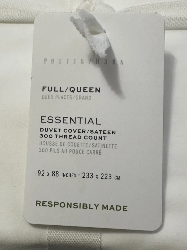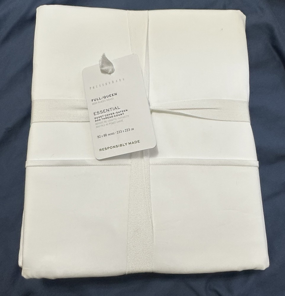 POTTERY BARN ESSENTIAL 300 THREAD COUNT SATEEN DUVET COVER Queen Full WHITE New See photos and zoom in as needed From a smoke free environment You will receive the exact brand new duvet cover you see here