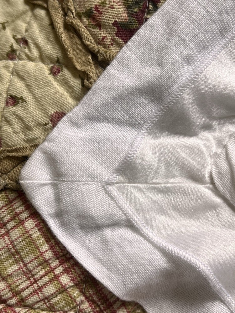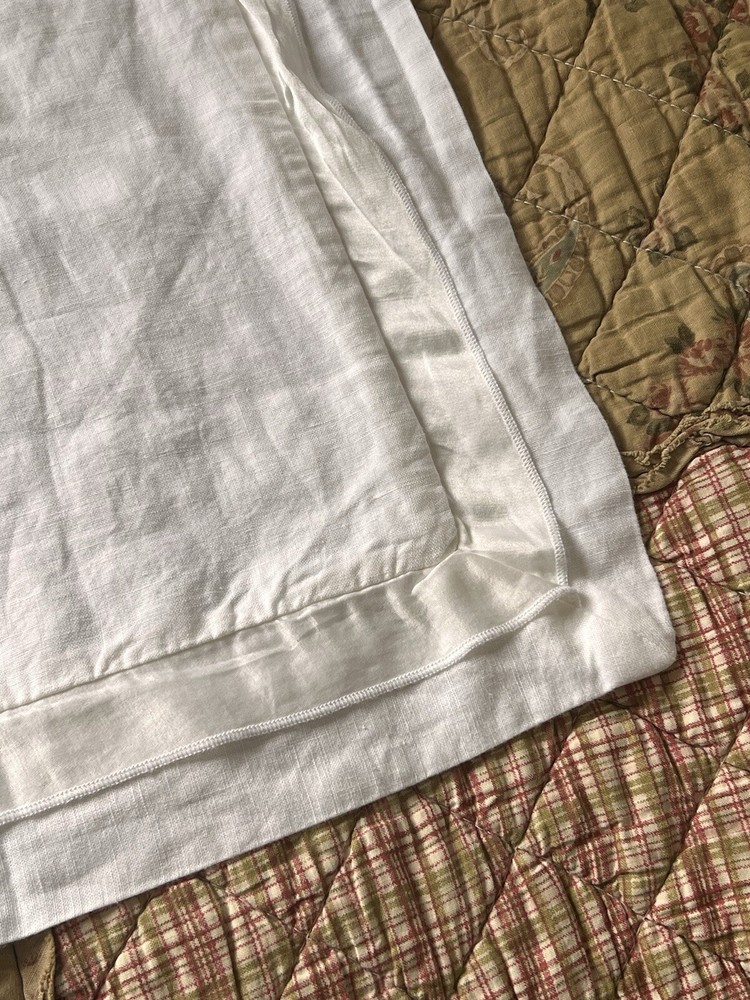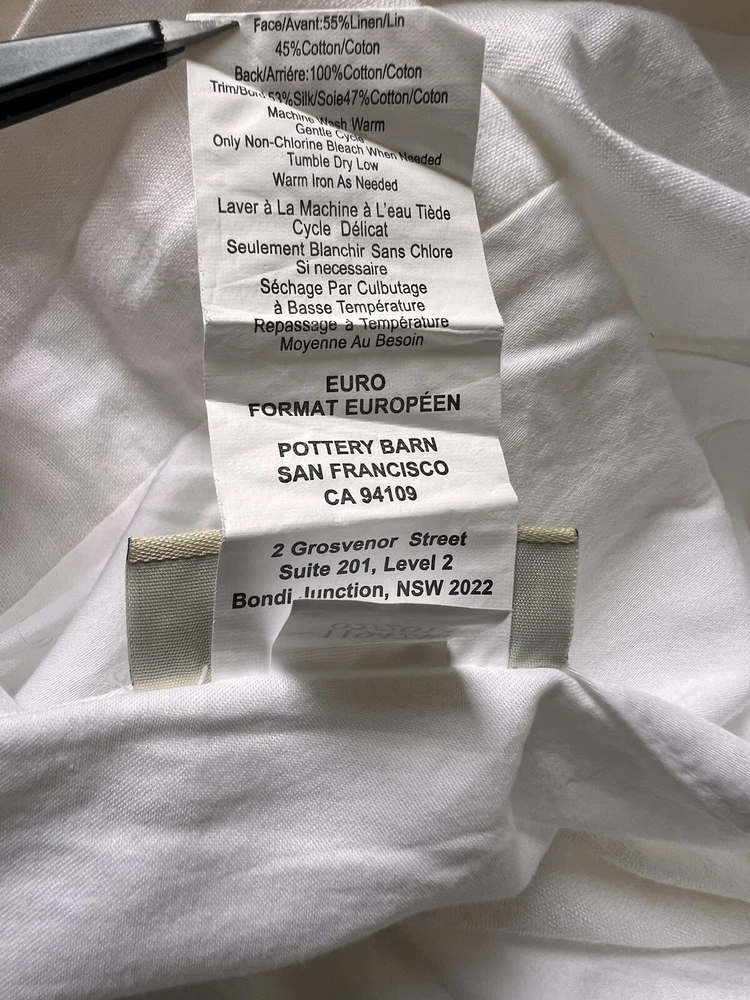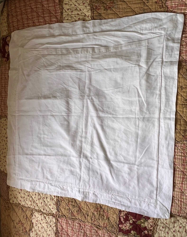 Stark white with white ribbon border detail in front. Envelope entrance on backside. Linen cotton blend. No stains. No damage. 1 single euro square. Smoke and pet free home. Thank you!