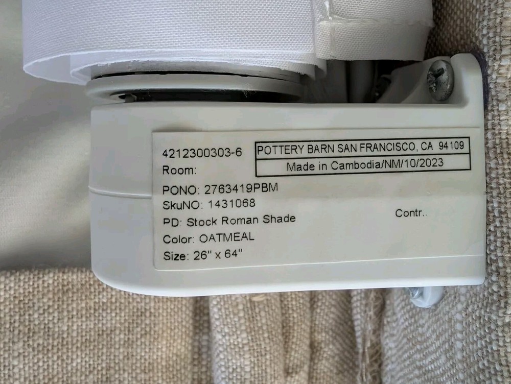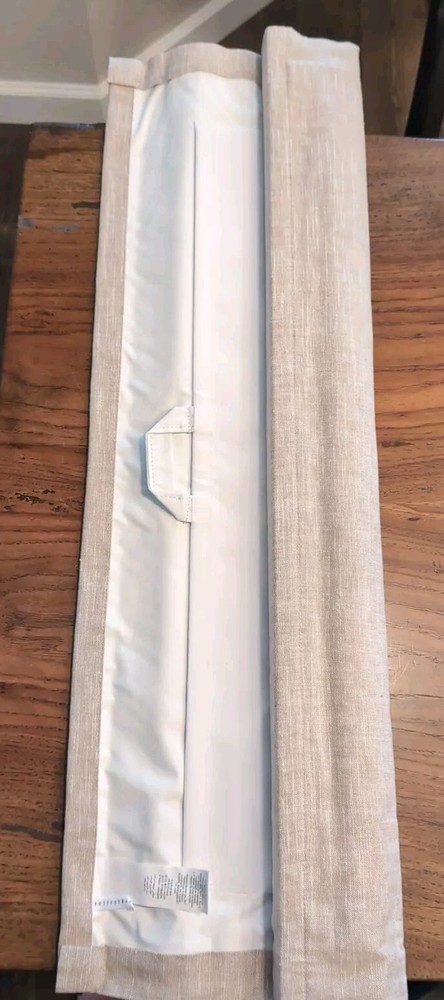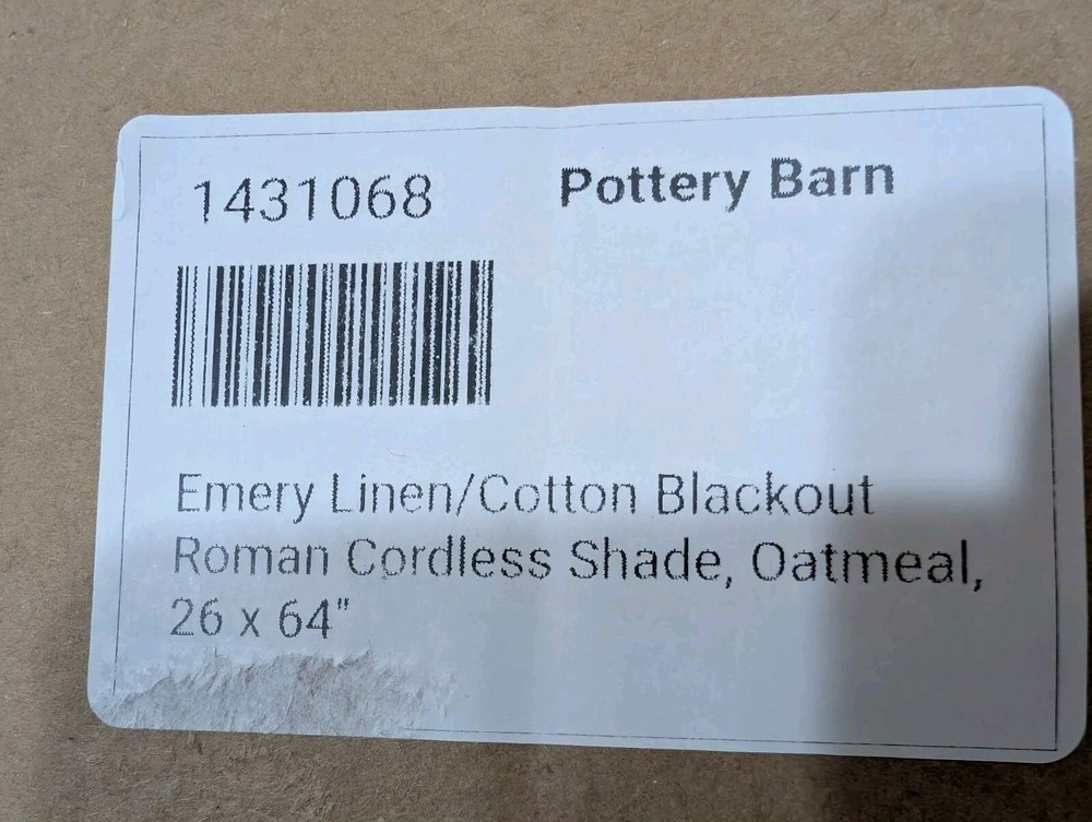 POTTERY BARN Emery Linen Cordless Blackout Shade-26x64 "-Oatmeal-OPEN BOX Face is a 100% yarn-dyed linen. Patented AeroLife™ Cordless Lift System uses a roller mechanism that is 100% cord-free, which is easy to use and safer for children and pets. Concealed handle makes it easy to lower and raise shade in one easy movement. Can be used as an inside or outside mount with included installation hardware. All shades have a depth of 2". US SHIPPED ONLY - FREE!