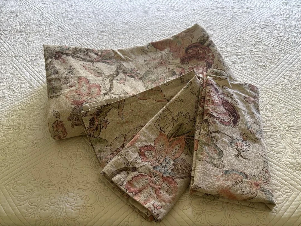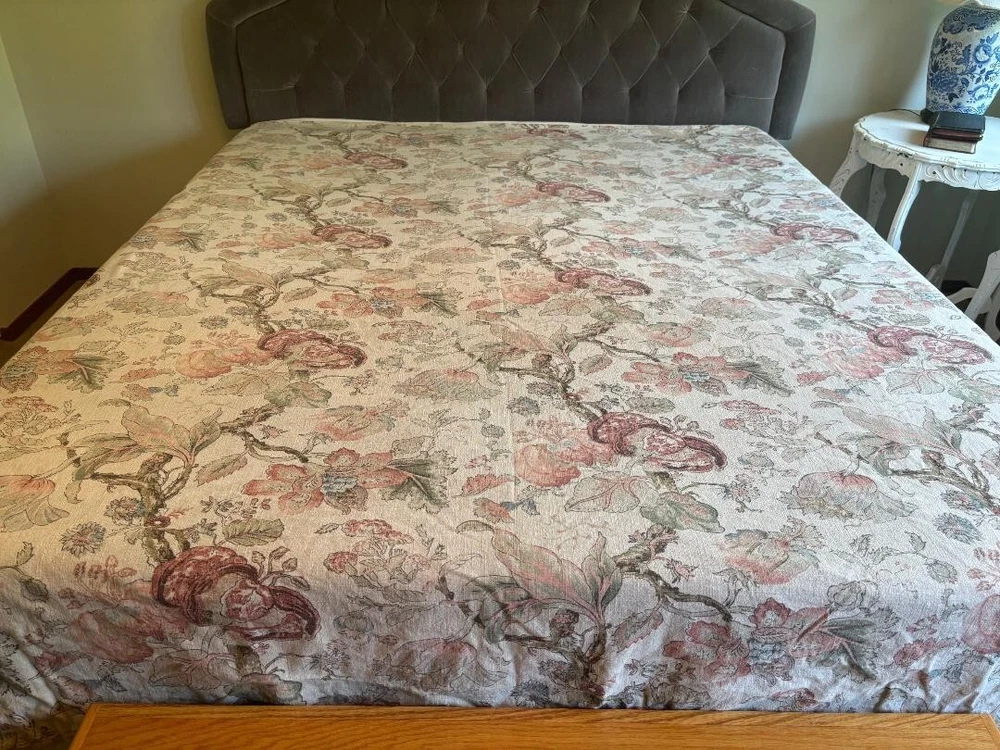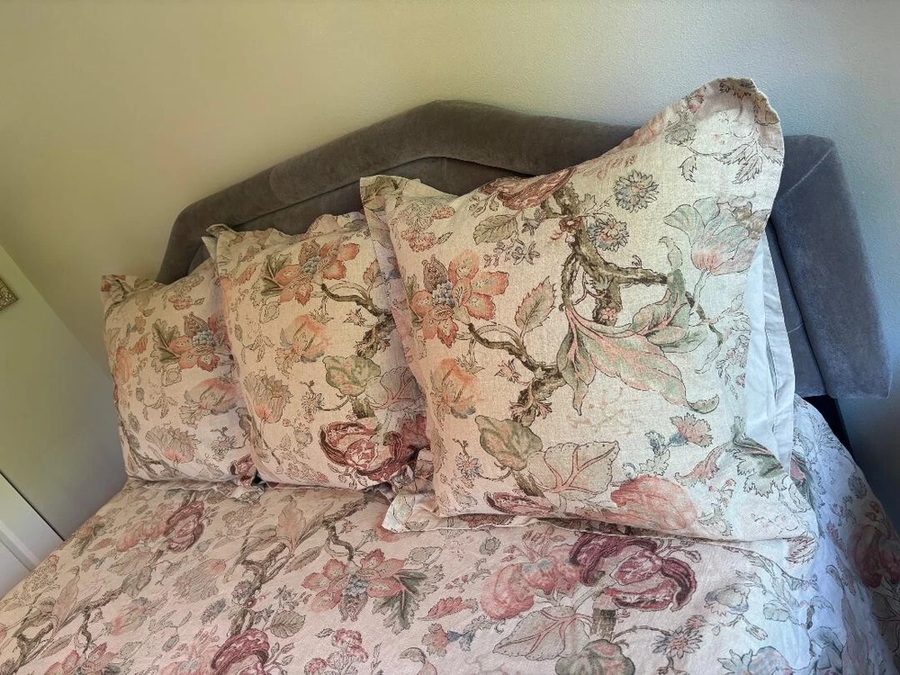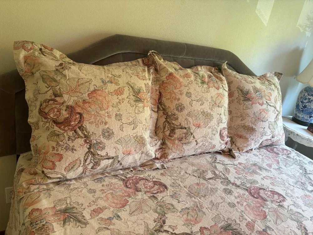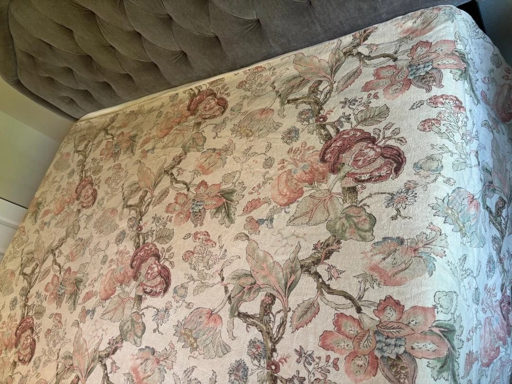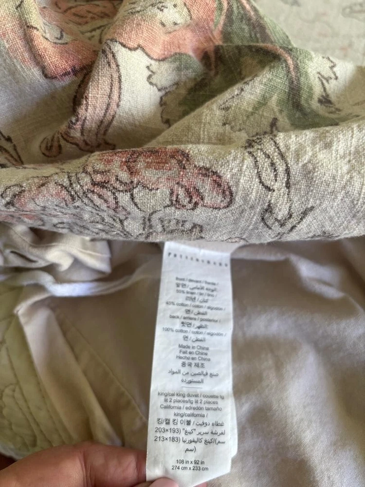POTTERY BARN GRACE FLORAL KING THICK LINEN DUVET W/ THREE EURO SHAMS. DUVET MEASURES 92" LENGTH X 106" WIDTH. BUTTON CLOSURE. BACKGROUND IS A NEUTRAL CREAM COLOR WITH MULTI COLOR FLORAL. NO RIPS OR TEARS.