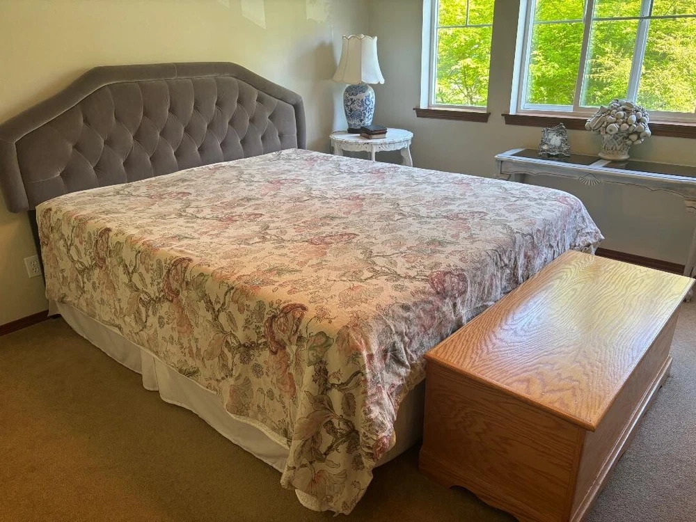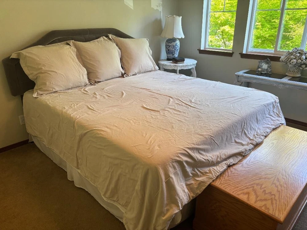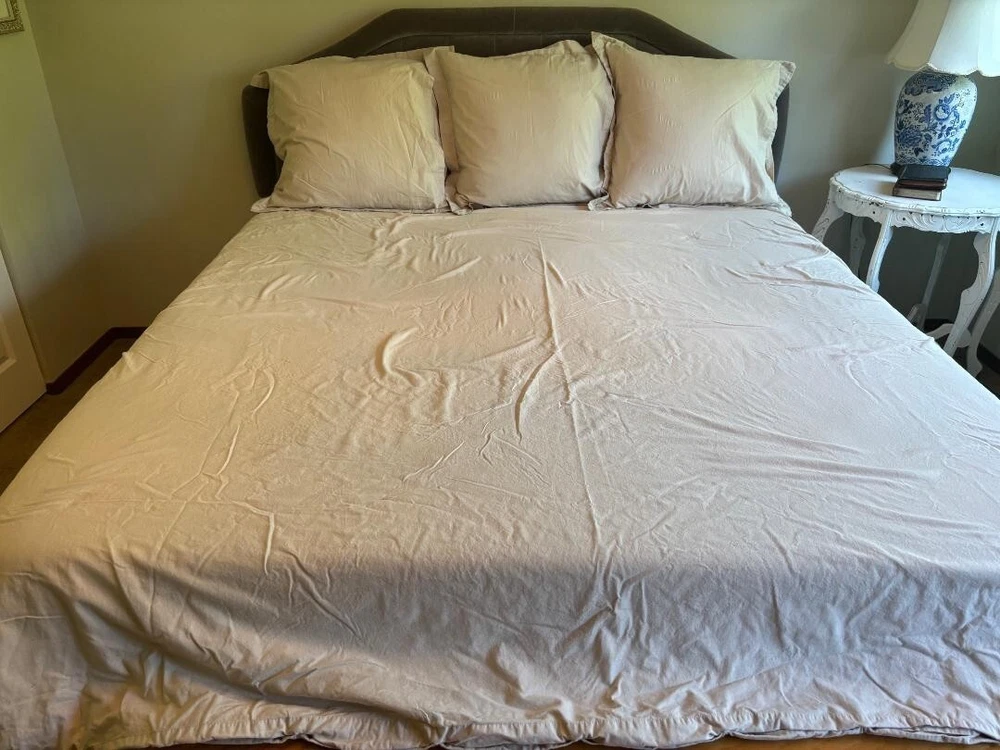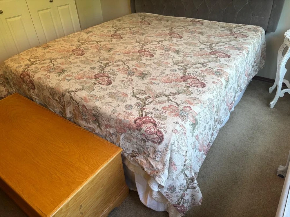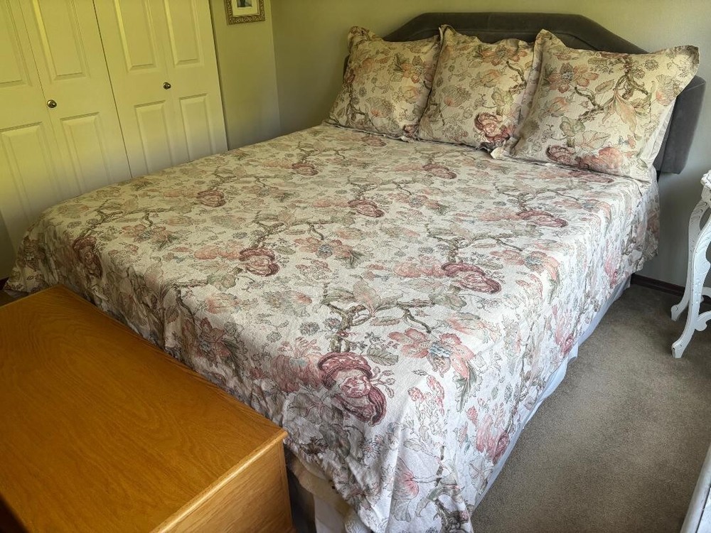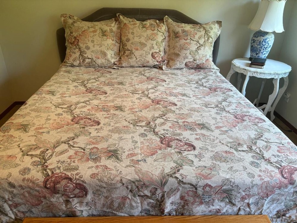 POTTERY BARN GRACE FLORAL KING THICK LINEN DUVET W/ THREE EURO SHAMS. DUVET MEASURES 92" LENGTH X 106" WIDTH. BUTTON CLOSURE. BACKGROUND IS A NEUTRAL CREAM COLOR WITH MULTI COLOR FLORAL. NO RIPS OR TEARS.