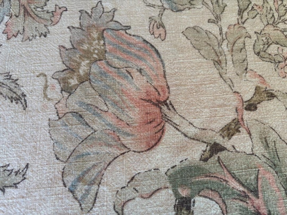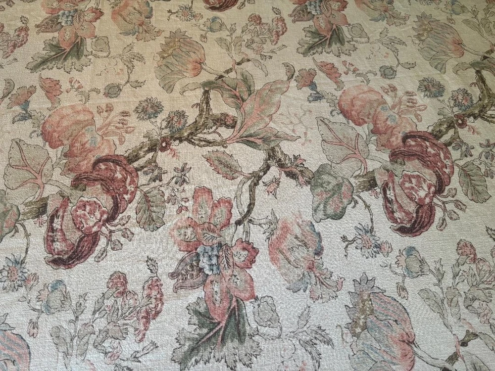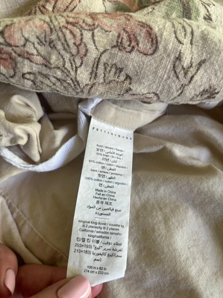 POTTERY BARN GRACE FLORAL KING THICK LINEN DUVET W/ THREE EURO SHAMS. DUVET MEASURES 92" LENGTH X 106" WIDTH. BUTTON CLOSURE. BACKGROUND IS A NEUTRAL CREAM COLOR WITH MULTI COLOR FLORAL. NO RIPS OR TE...