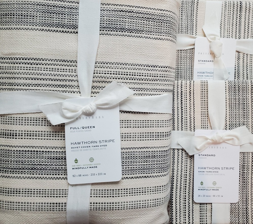 POTTERY BARN HAWTHORN STRIPE FULL/QUEEN DUVET ~ 92" X 88" AND 2 ~ 26" X 20" HAWTHORN STRIPE STANDARD SHAMS BRAND NEW CHARCOAL GRAY You are buying a BRAND NEW Pottery Barn Hawthorn Stripe Full/Queen Duvet. It measures 92" W x 88" L. Included are two 26" x 20" Hawthorn Stripe Standard shams. The color is CHARCOAL GRAY (The background is ivory). Pottery Barn describes this as, " A statement look for the bed, this large-scale stripe design feels like the perfect amount of preppy. Complemented by a textured slub cotton, this bedding is a casual and comfortable choice that layers like a dream . " DETAILS Front fabric of duvet is woven of 100% yarn-dyed cotton. Duvet features a button closure and interior ties to help keep insert (sold separately) in place; sham features an envelope closure. 200-thread count. Duvet and sham reverses to solid. Inserts sold separately. Machine wash. Imported. CARE Machine wash cold, gentle cycle. Use non-chlorine bleach when needed. Tumble dry low, remove promptly. Warm iron as neede d.