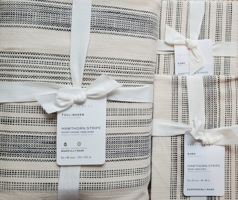 POTTERY BARN HAWTHORN STRIPE FULL/QUEEN DUVET ~ 92" X 88" AND 2 ~ 26" X 26" HAWTHORN STRIPE EURO SHAMS BRAND NEW CHARCOAL GRAY You are buying a BRAND NEW Pottery Barn Hawthorn Stripe Full/Queen Duvet. It measures 92" W x 88" L. Included are two 26" x 26" Hawthorn Stripe Euro shams. The color is CHARCOAL GRAY (The background is ivory). Pottery Barn describes this as, " A statement look for the bed, this large-scale stripe design feels like the perfect amount of preppy. Complemented by a textured slub cotton, this bedding is a casual and comfortable choice that layers like a dream . " DETAILS Front fabric of duvet is woven of 100% yarn-dyed cotton. Duvet features a button closure and interior ties to help keep insert (sold separately) in place; sham features an envelope closure. 200-thread count. Duvet and sham reverses to solid. Inserts sold separately. Machine wash. Imported. CARE Machine wash cold, gentle cycle. Use non-chlorine bleach when needed. Tumble dry low, remove promptly. Warm iron as neede d.