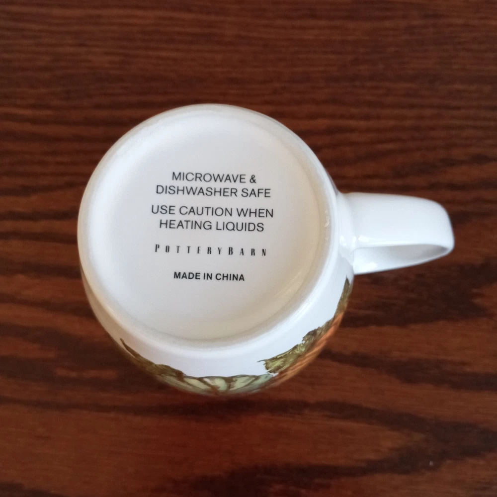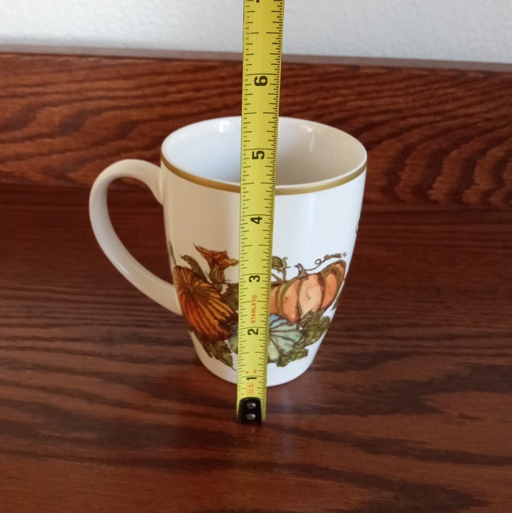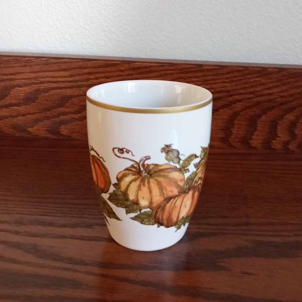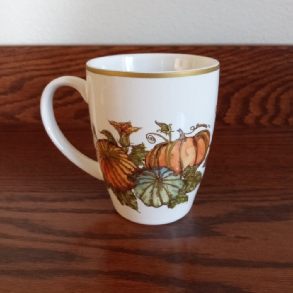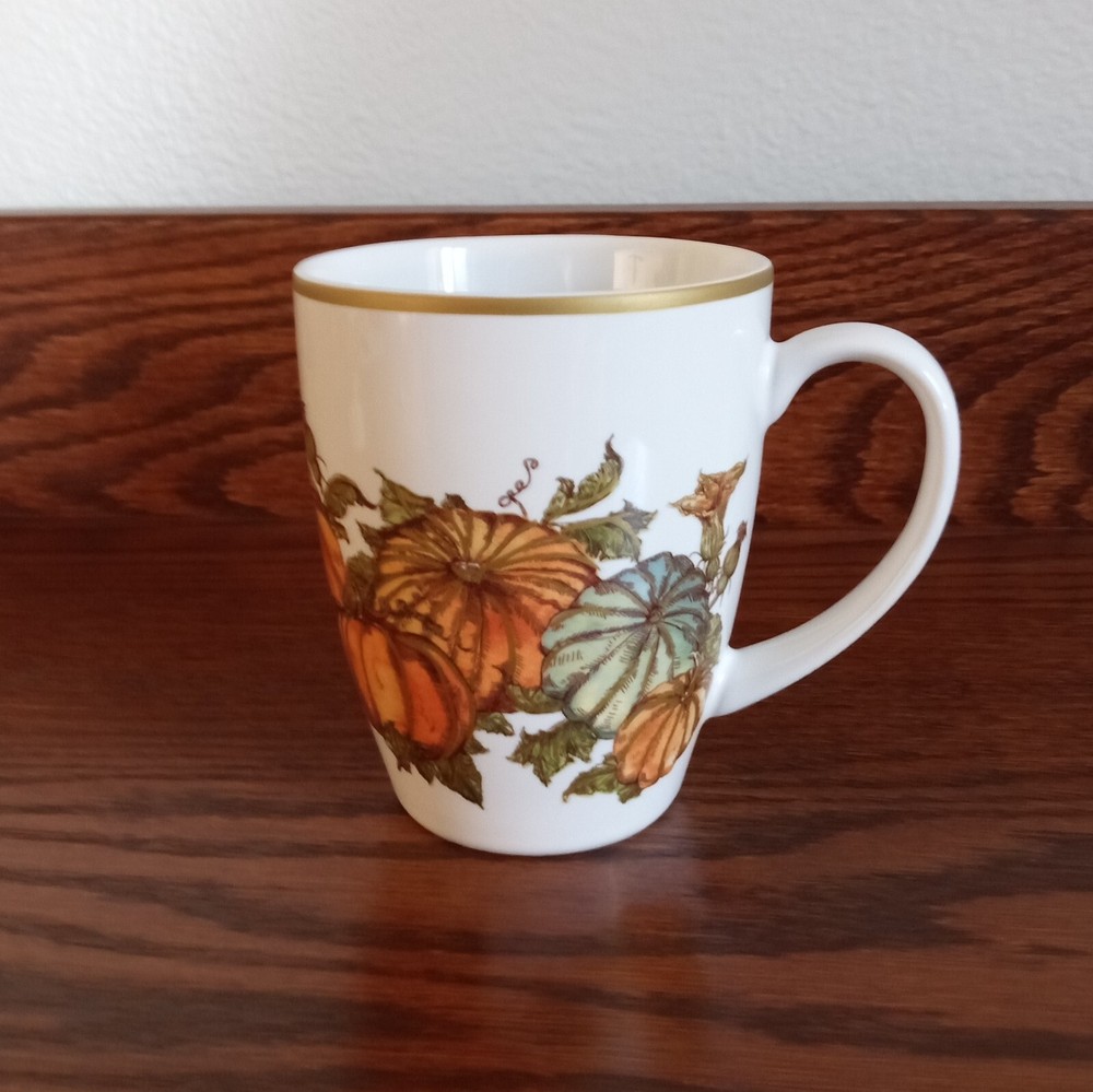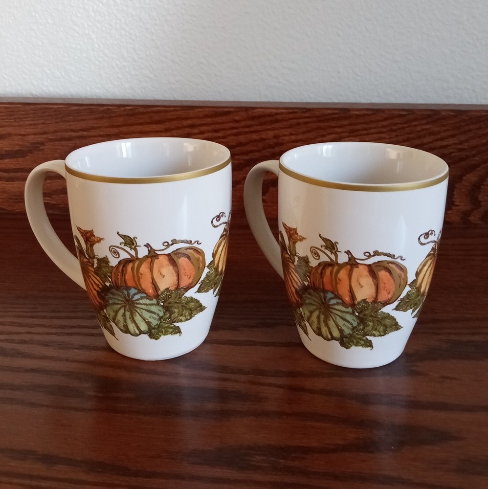 Set of 2 Heritage Pumpkin stoneware mugs by Pottery Barn, with pumpkins, fall leaves and gold trim. Microwave and dishwasher safe. Dimensions per mug: 4 1/4" tall x 3 1/2" wide; Weight per mug 12 5/8 oz; Capacity: 11 oz. Condition: Excellent, no chips, cracks or crazing.