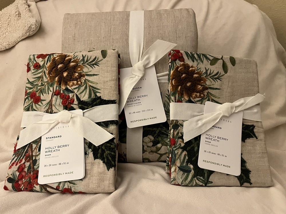 BRAND NEW POTTERY BARN Holly Berry Wreath FULL/QUEEN Duvet & 2 Standard shams This is a phenomenal, incredibly adorable duvet set from the new for 2024 holiday line from Pottery Barn. You will receive the absolutely stunning berry, pine cone and green wreath branches with embroidered accents on this duvet and 2 shams . Even more charming and appealing in person - sure to be an all-time favorite. Perfect for your room this season. Brand new in the original PBK ribbon tied packaging - no plastic wrap. Fragrant pine branches and verdant holly leaves dotted with bright red berries: You can always count on these are defining symbols of the season to set a festive scene. Our bedding is framed with a holiday garland and decorated with embroidered details that make the artwork pop. Details Material: Made from 85% cotton and 15% linen. Reverses to 100% cotton. Secure Design: Duvet features a hidden button closure with inner ties that keep insert in place; sham features an envelope closure. Components: Duvet cover, shams Certification and Standards: By choosing our cotton products, you’re supporting our investment in Better Cotton’s mission. This product is sourced via mass balance and therefore may not contain Better Cotton. Place of Manufacture: Imported. Dimensions Full/Queen Duvet: 88" l x 92" w Standard Shams: 20" w x 26" l