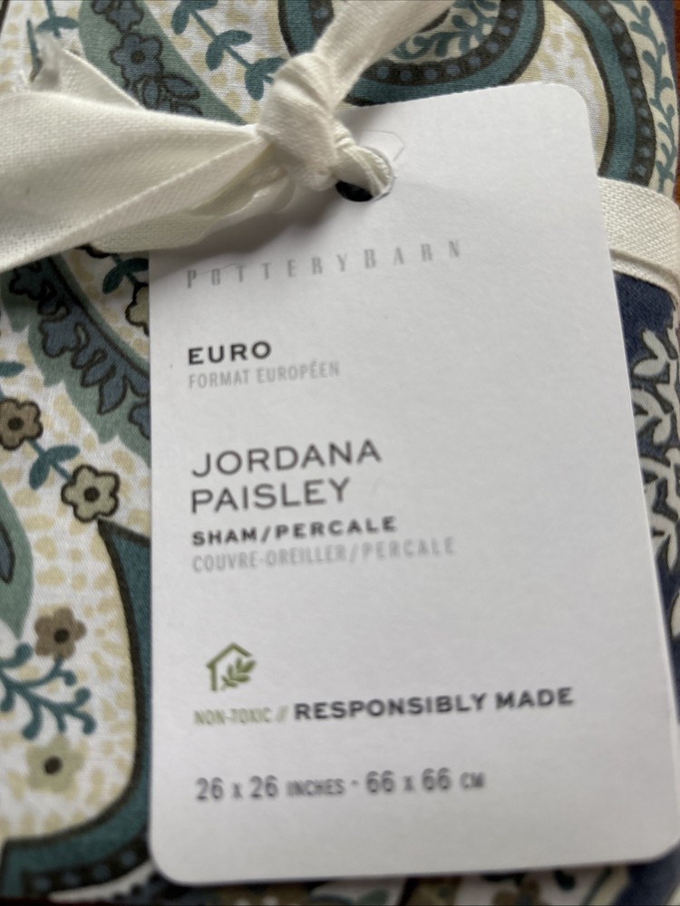 The Pottery Barn Jordana Paisley Percale Sham is a luxurious addition to any bedroom, featuring a beautiful paisley pattern in a soothing blue color. Made from 100% organic cotton percale, this square Euro sham is not only stylish but also eco-friendly. The sham is machine washable with an envelope closure for easy maintenance. The STANDARD 100 by OEKO-TEX certification ensures high quality and safety for adults to enjoy a comfortable and restful sleep experience.
