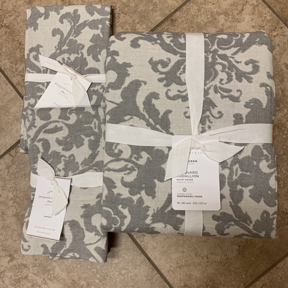 BRAND NEW POTTERY BARN JACQUARD LINEN MEDALLION FULL/QUEEN Duvet & 2 STANDARD Shams GRAY This set is a brand new from the popular Pottery Barn Jacquard Medallion Collection. You will receive the absolutely beautiful, delicate and stunning gray texture woven patterned FULL/QUEEN duvet and TWO matching STANDARD shams. This set is amazing and soft rayon blend - simple yet elegant and outstanding for your bedroom this year. Retails for $368 - buy it here for Less! The bedding set in the picture is the actual set you will receive. A layered bed starts with texture. This tonal pattern is woven with linen for a touch of breezy softness. DETAILS YOU'LL APPRECIATE Made of 45% rayon, 38% cotton, and 17% linen. Features a yarn dyed, Jacquard weave. Duvet cover features hidden button closure and sham features flap closure. KEY PRODUCT POINTS Duvet cover and sham reverse to solid ivory. Machine wash. DIMENSIONS Duvet Cover Full/Queen: 88" l x 92" w Sham Standard: 20" h x 26" w Flange: 1.5" Paypal is preferred. FREE priority shipping with delivery confirmation. Please email me if you have any questions. All sales are final. Returns are not accepted.