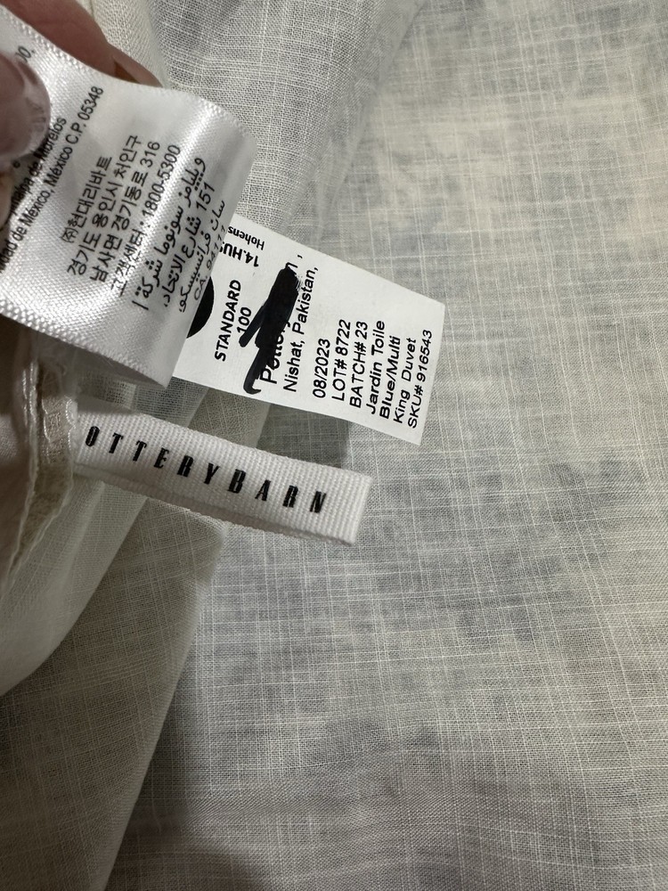 unused with original packaging folds. just has a minor amount of pet hair so being sold as pre owned. POTTERY BARN Jardin Toile Cotton King Duvet Cover in blue...
