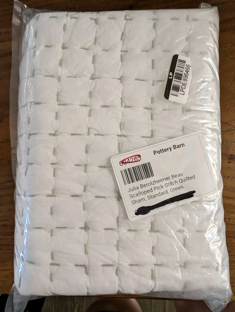 POTTERY BARN Julia Berolzheimer Beau Scalloped Quilted Sham-Std-Green-OPEN BOX Quilted of 100% cotton. Filled with 100% polyester batting. Quilted sham has envelope closure. Reverses to same. 20x26" U...