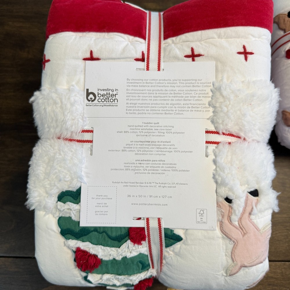 Keep your little one feeling cozy with our baby quilt, adorned with Rudolph the Red-Nosed Reindeer characters that are sure to spread holiday cheer. Plus, this set is crafted from supersoft sheeting with velvet and Sherpa appliqués, so they can have the most comfortable night’s rest. DETAILS THAT MATTER Hand-quilted of 100% cotton sheeting in India. This product celebrates and preserves artisan handcraft traditions around the world. Quilt reverses to solid pattern. Filled with 100% polyester fibers with 200-gram weight. Quilt features a running stitch on the front. Features appliqués made of 100% cotton velvet, 100% polyester Sherpa and gingham check fabrics. Yarn-dyed fiber has incredibly rich color that holds its vibrancy over time. DIMENSIONS Overall: 36" wide x 50" long Sham Standard: 26" wide x 20" high Euro: 26" square CARE Wash before first use. Machine wash in warm water; gentle cycle. Use only non-chlorine bleach, if needed. Tumble dry on low heat; remove promptly. Warm iron as needed. Shipping & handling: We ship same or next day. Large comforters & quilts are vacuum packed with a reusable storage bag to save shipping cost and preserve the item. Questions: Please reach out. We respond very quickly. We strive for 5-star service in our product quality, shipping speed & customer service. We know you have many choices on eBay and appreciate that you have chosen to shop with us. Zoe's Castle | eBay Stores