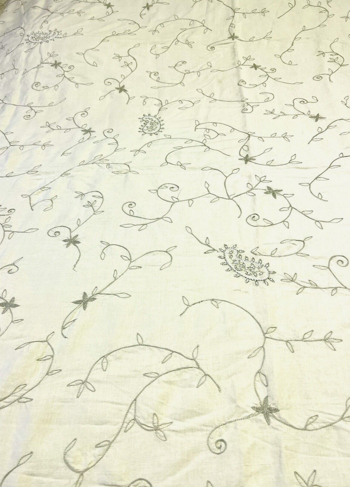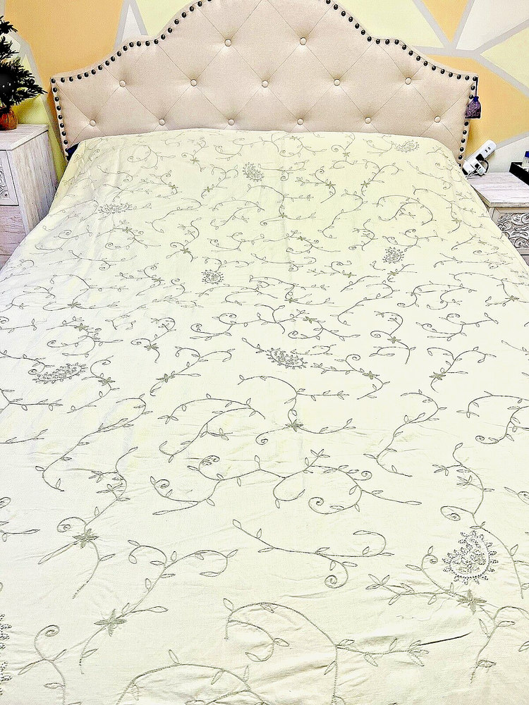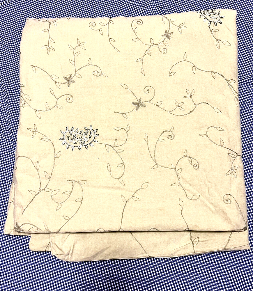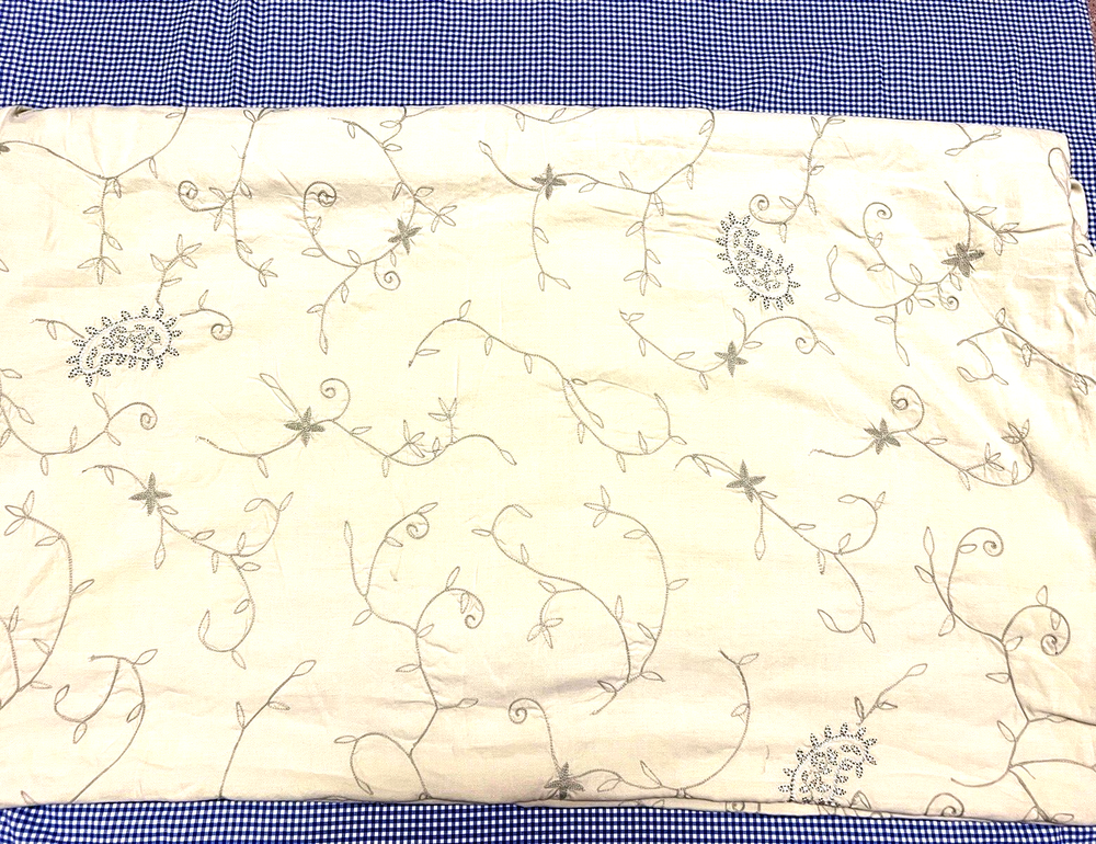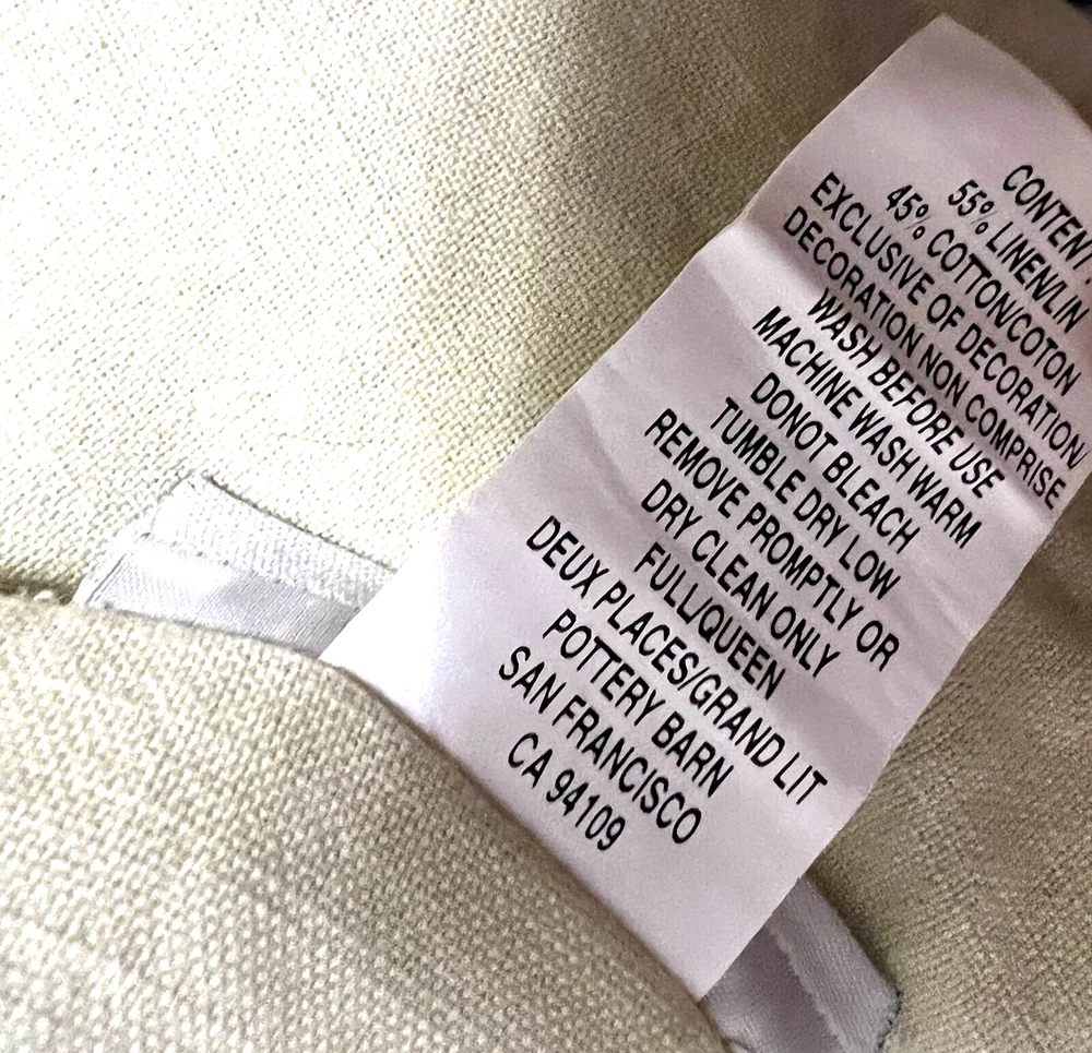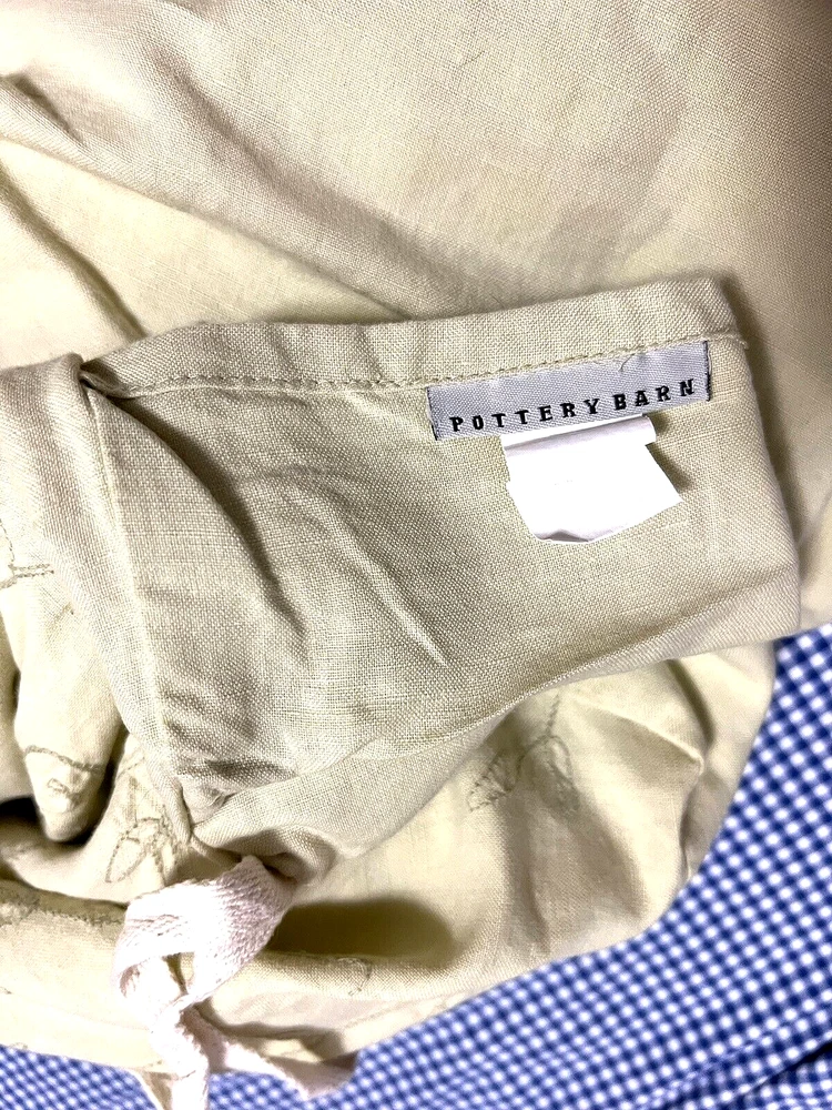 POTTERY BARN LINEN/COTTON KING DUVET COVER light olive / embroidery/ button closure 86''X90'' 55% linen 45% cotton Good pre-owned condition, duvet cover is in good condition with no stains or damage. machine wash warm All items are from my smoke free home. Packages are shipped same day, or next Business day. Please view all photos for details carefully before purchased! Thank you for looking!