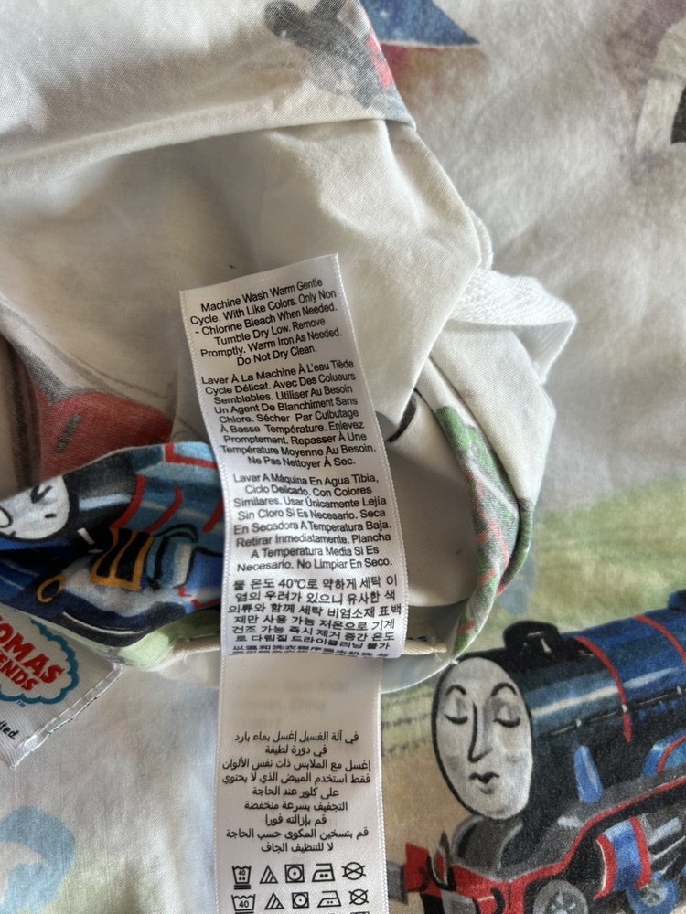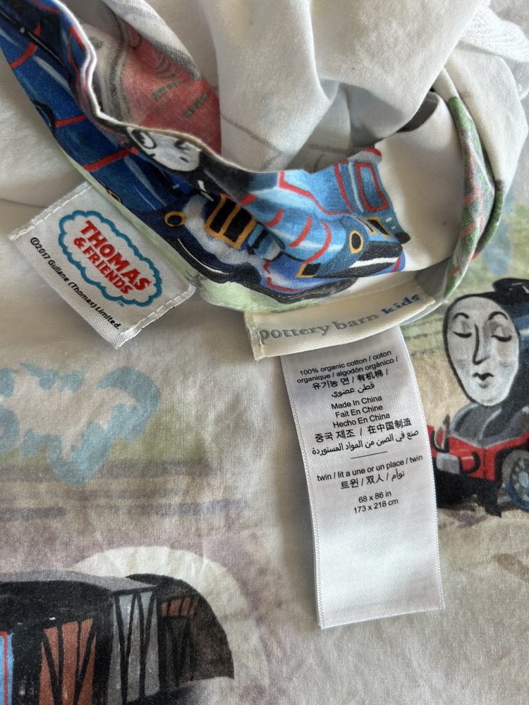 Adorable Thomas and Friend train duvet cover. No holes, stains or rips. Inside corner ties to hold duvet in place. Button closure. There is some minor fading due to normal wash wear