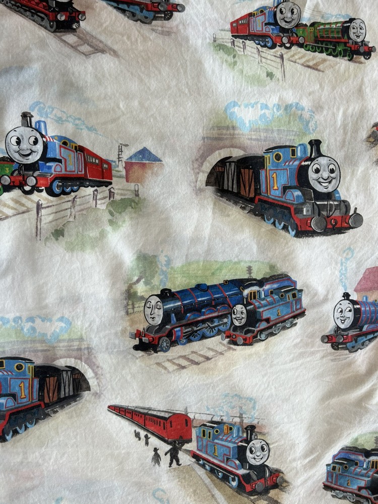 Adorable Thomas and Friend train duvet cover. No holes, stains or rips. Inside corner ties to hold duvet in place. Button closure. There is some minor fading due to normal wash wear...