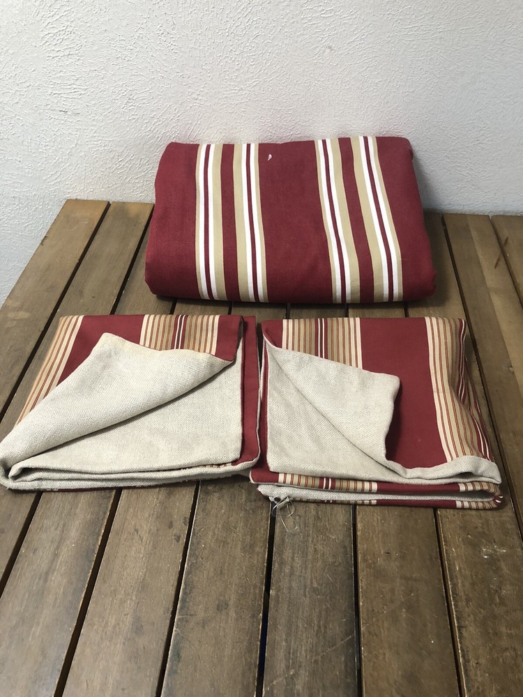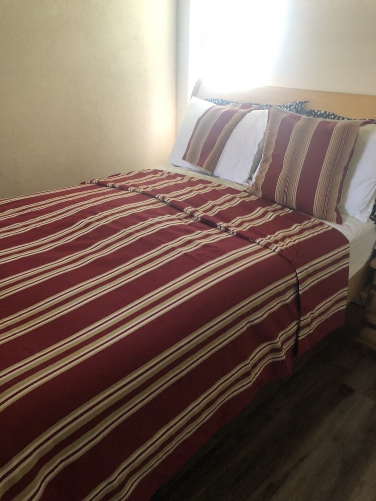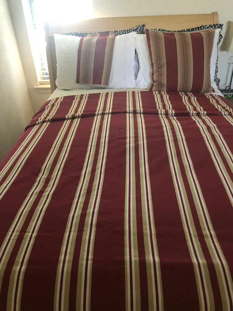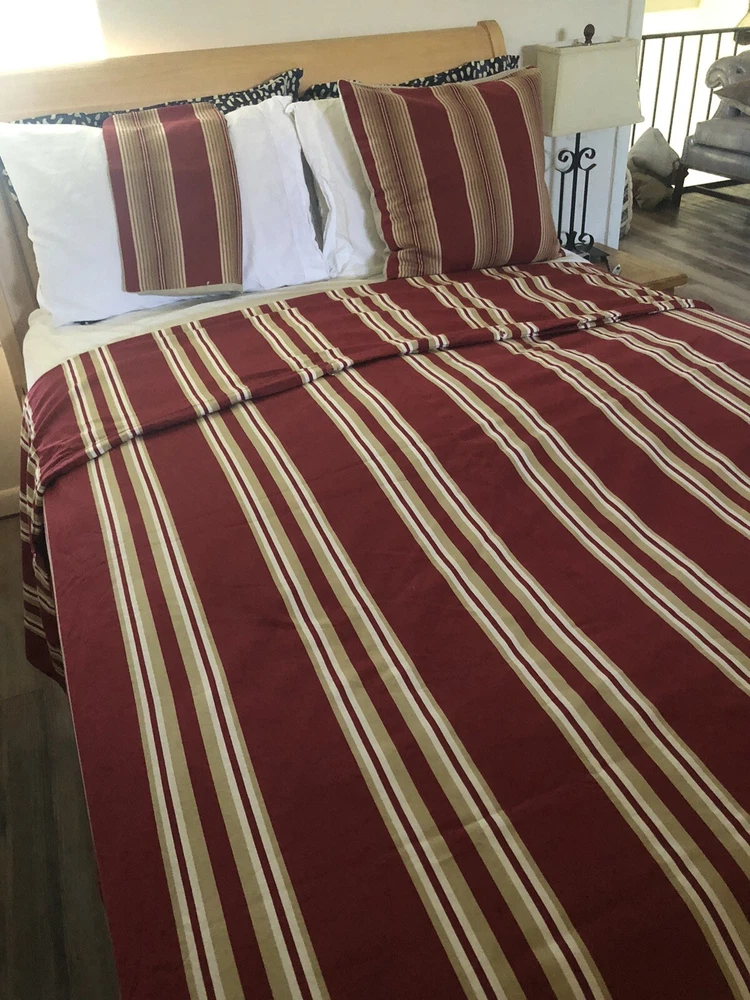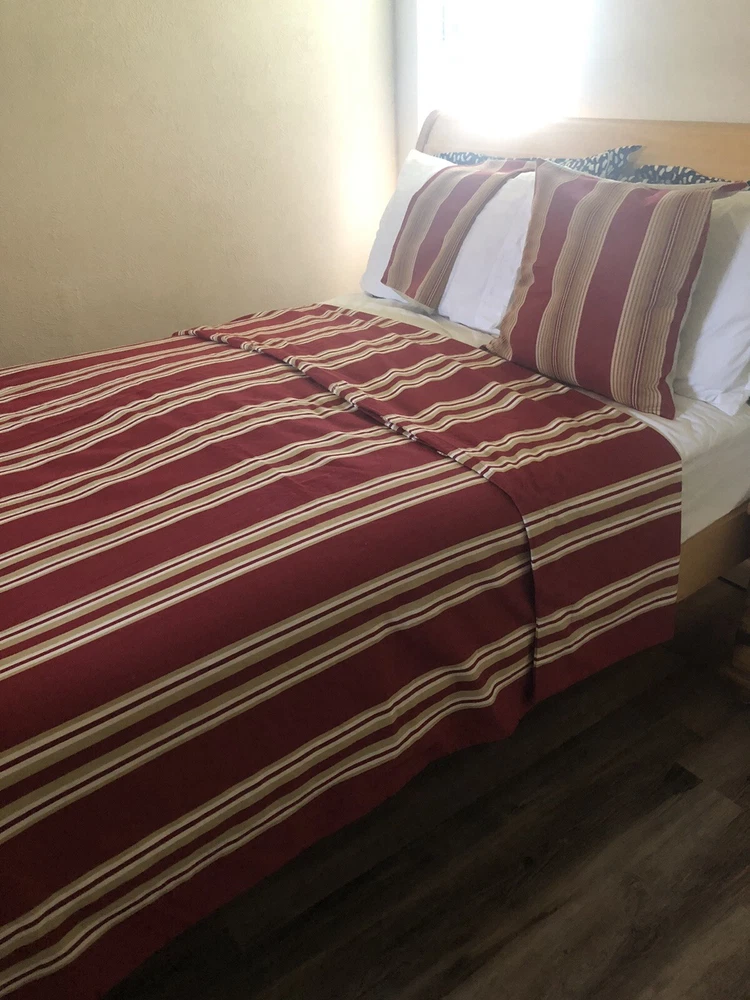 This Pottery Barn three-piece duvet cover set features a modern striped pattern with red X design. The set includes a duvet cover 90x88 inches with corner ties, two Euro shams, 20x20 inches and is made of 100% cotton. The red, tan, and white color scheme adds a luxury theme to any bedroom. The set is machine washable and reversible, with a button closure and zipper on shams. Perfect for teens, adults, or kids. Great Condition, see last Photo for discoloration on back of one Sham, otherwise no flaws to Note. Stored in smoke and pet free home. USPS Ground advantage shipping.