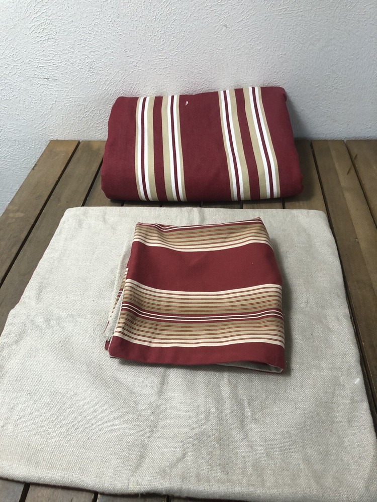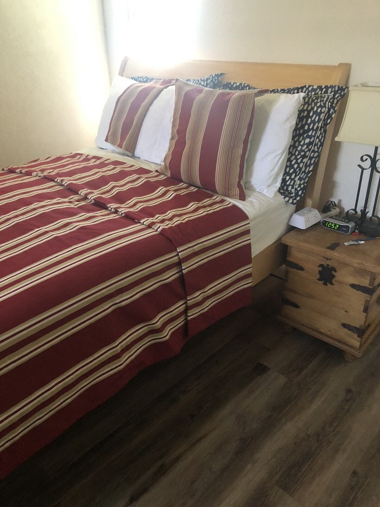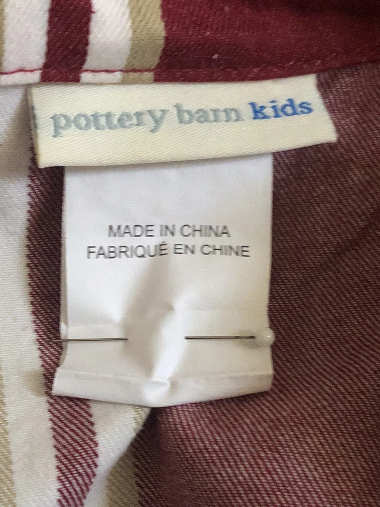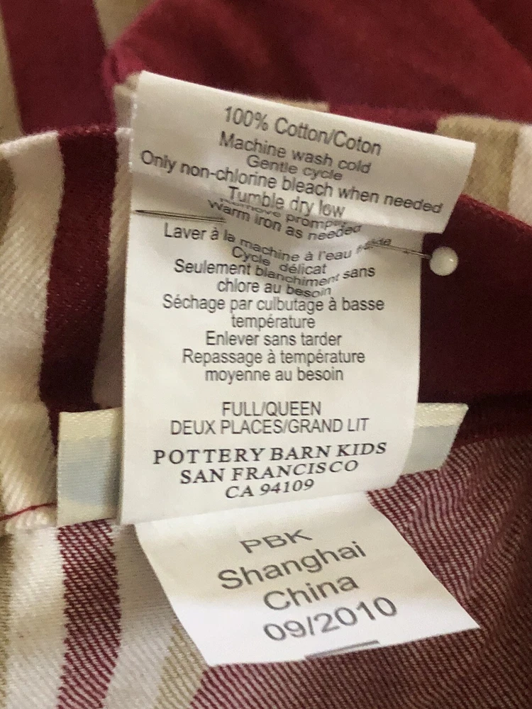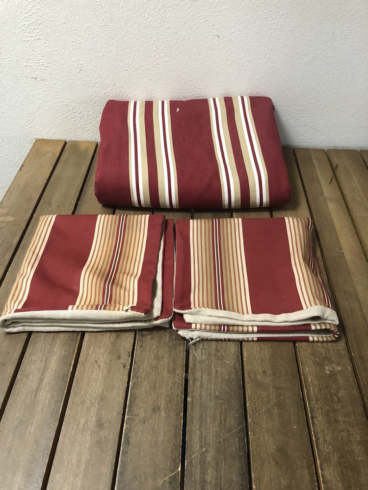 This Pottery Barn three-piece duvet cover set features a modern striped pattern with red X design. The set includes a duvet cover 90x88 inches with corner ties, two Euro shams, 20x20 inches and is made of 100% cotton. The red, tan, and white color scheme adds a luxury theme to any bedroom. The set is machine washable and reversible, with a button closure and zipper on shams. Perfect for teens, adults, or kids. Great Condition, see last Photo for discoloration on back of one Sham, otherwise no flaws to Note. Stored in smoke and pet free home. USPS Ground advantage shipping.