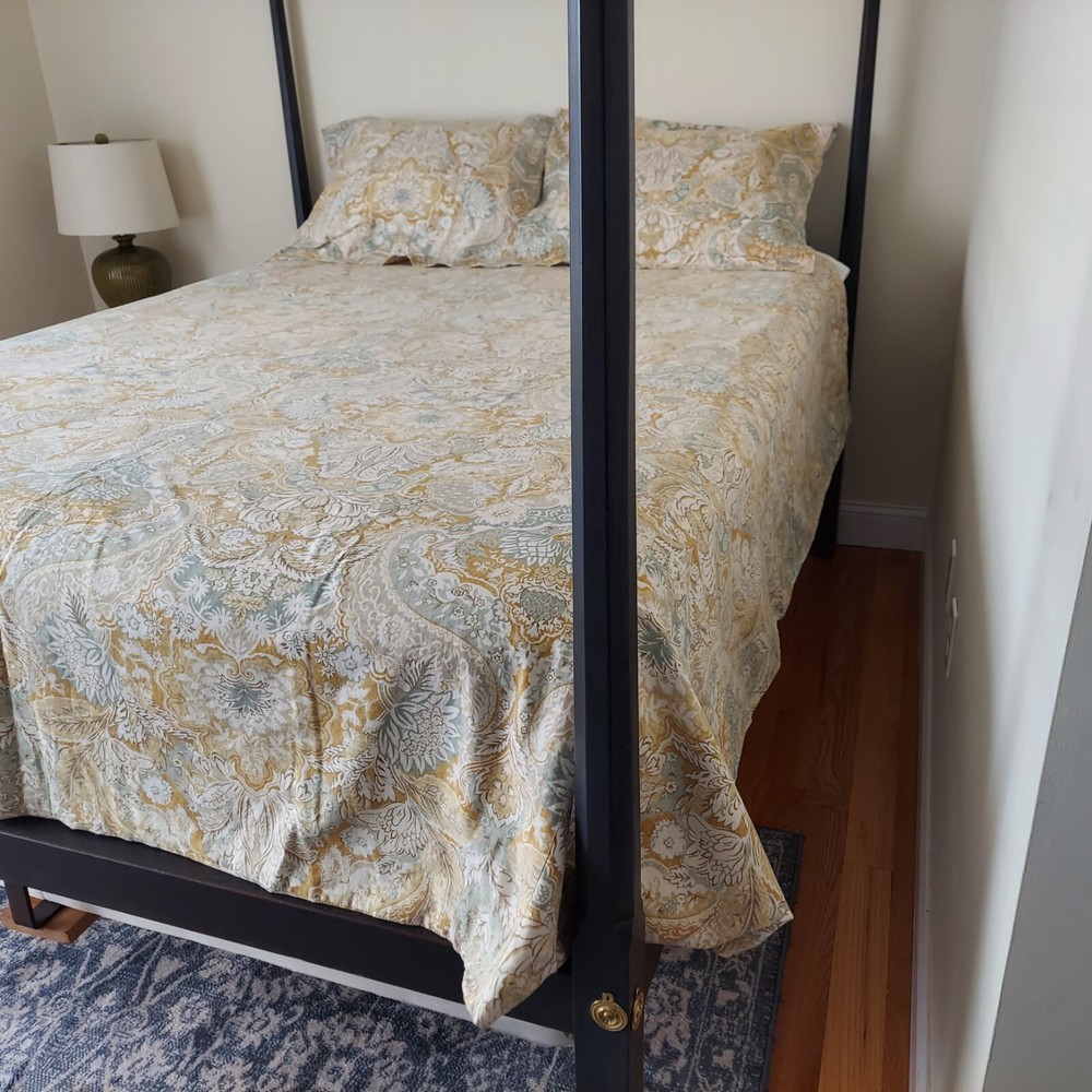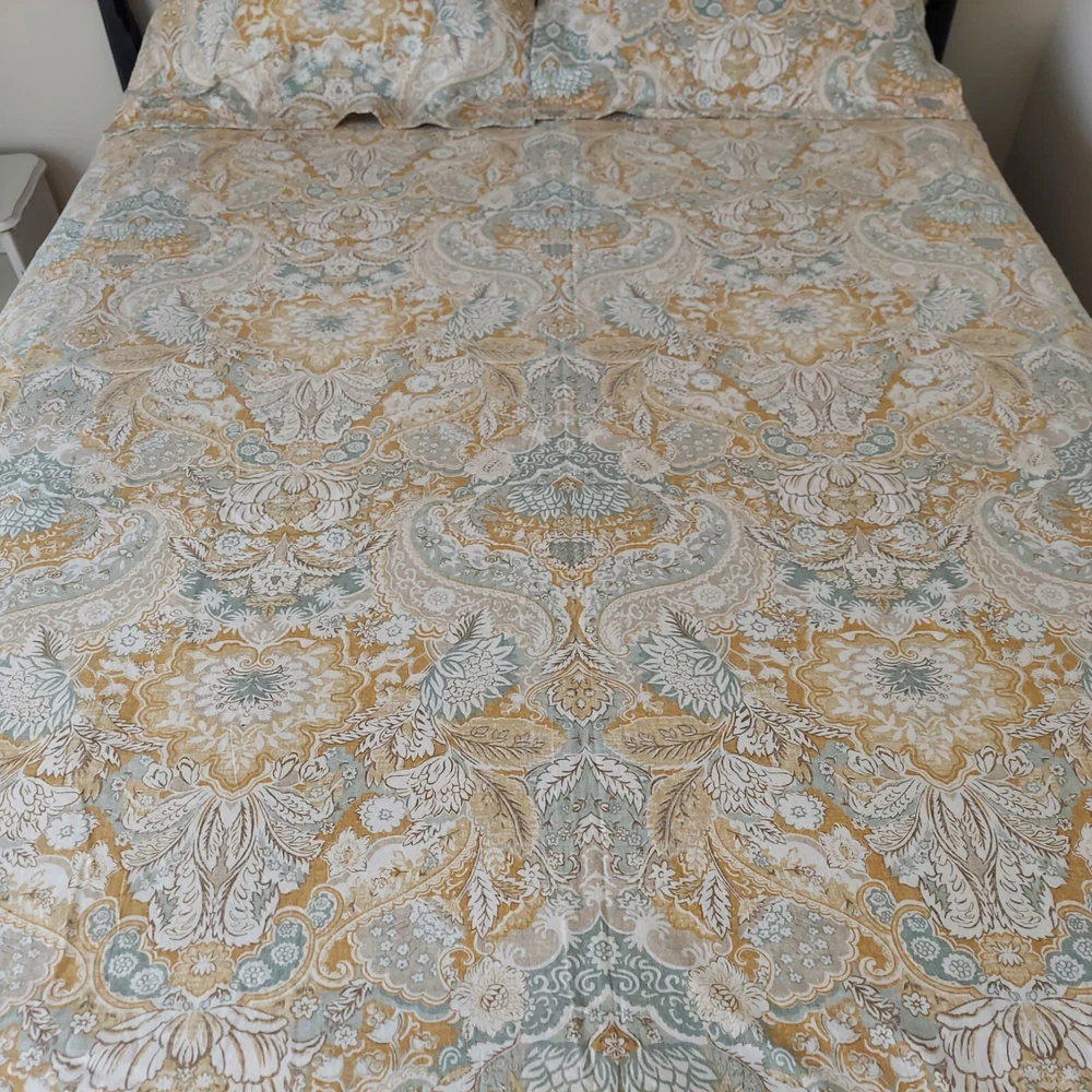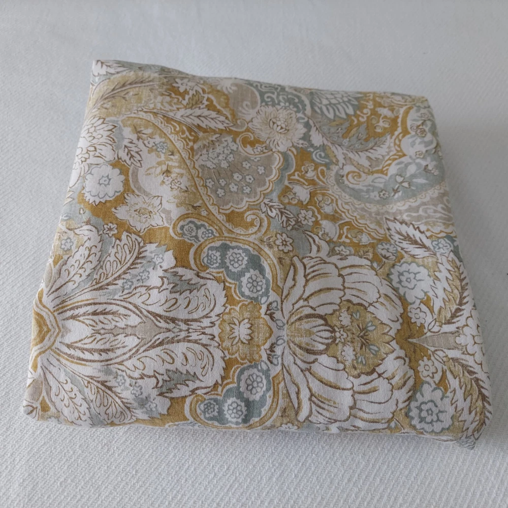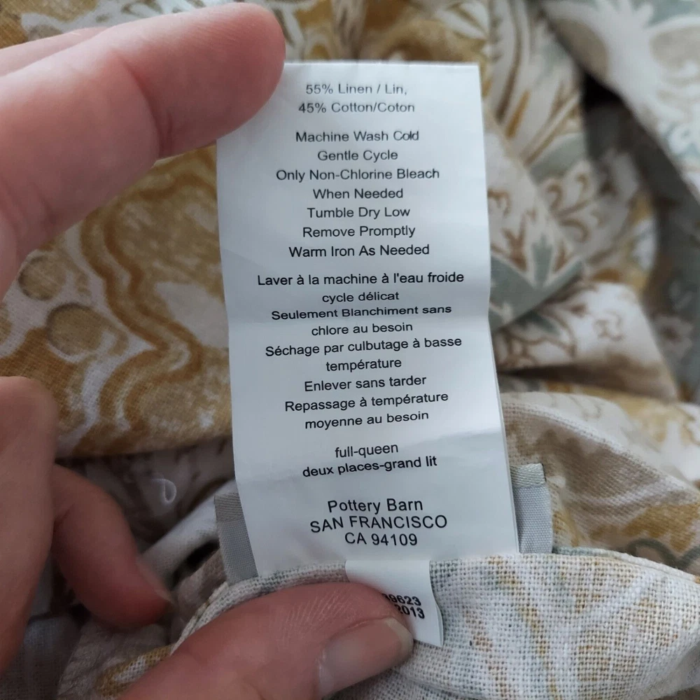 POTTERY BARN Linen Blend Paisley DUVET COVER & 2 Std SHAMS Blue Gold F/Q 85x87" Duvet Cover Set 45% Cotton/55% Linen 1 - F/Q Duvet Cover; button close 2 - Knife pleated standard pillow shams High Quality Blue and gold paisley on cream/ivory background Photographed on a QUEEN size bed without duvet insert. Measures 87x85" 16" drop on queen size bed Weight 7lb 1oz Ships FAST