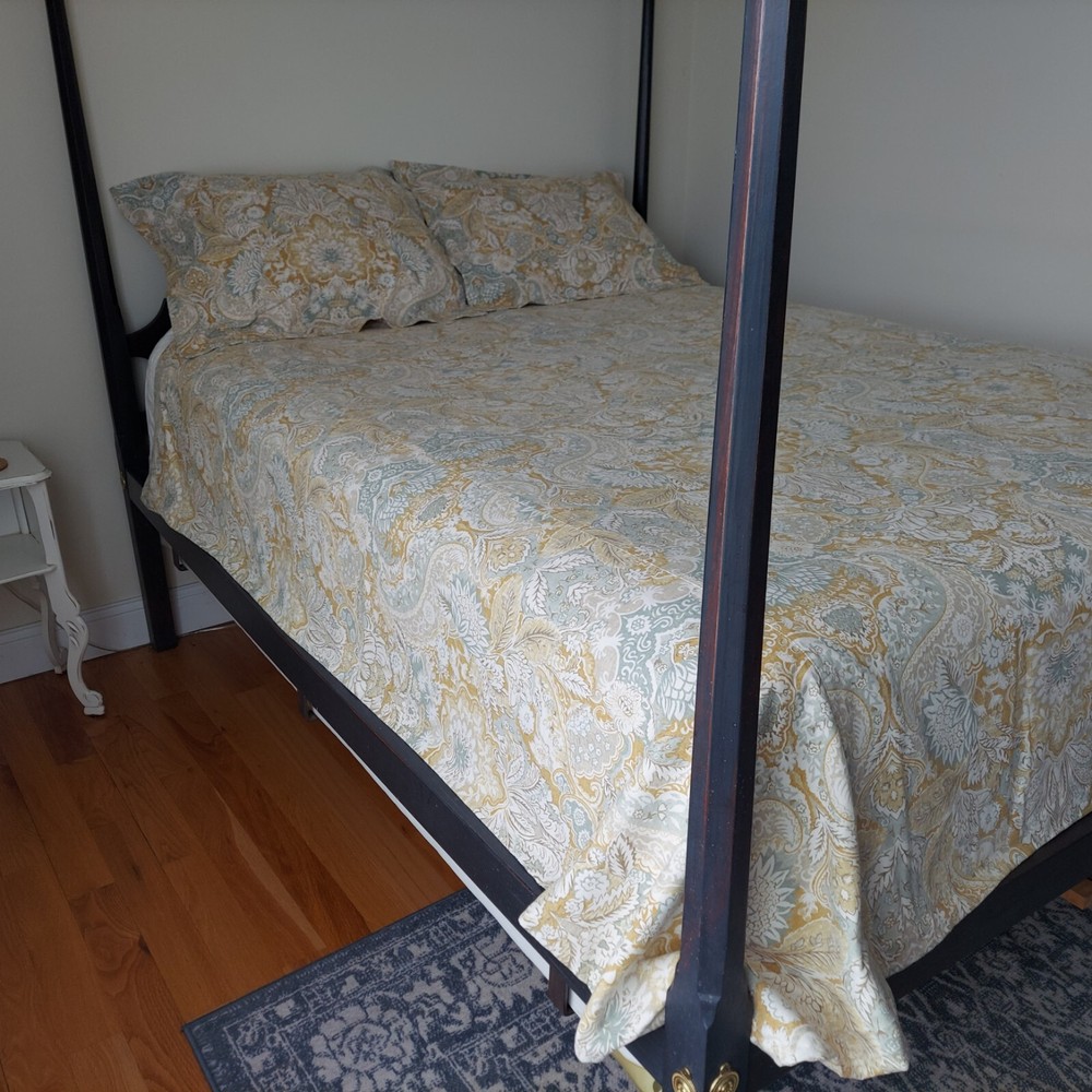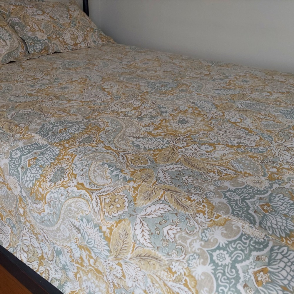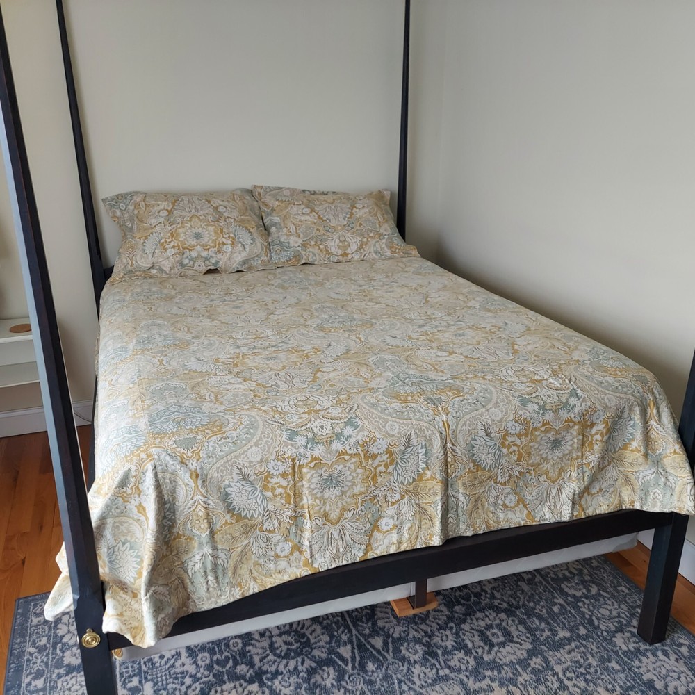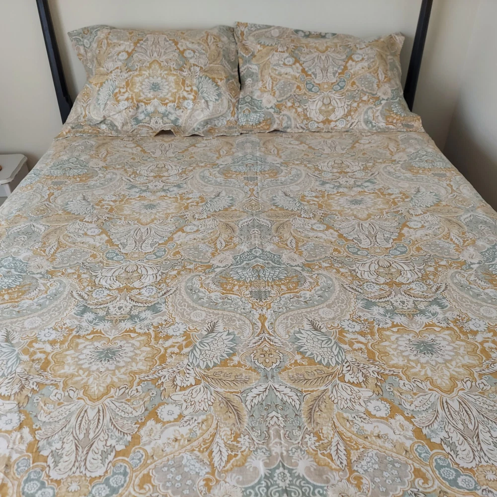 POTTERY BARN Linen Blend Paisley DUVET COVER & 2 Std SHAMS Blue Gold F/Q 85x87" Duvet Cover Set 45% Cotton/55% Linen 1 - F/Q Duvet Cover; button close 2 - Knife pleated standard pillow shams High Quality Blue and gold paisley on cream/ivory background Photographed on a QUEEN size bed without duvet insert. Measures 87x85" 16" drop on queen size bed Weight 7lb 1oz Ships FAST