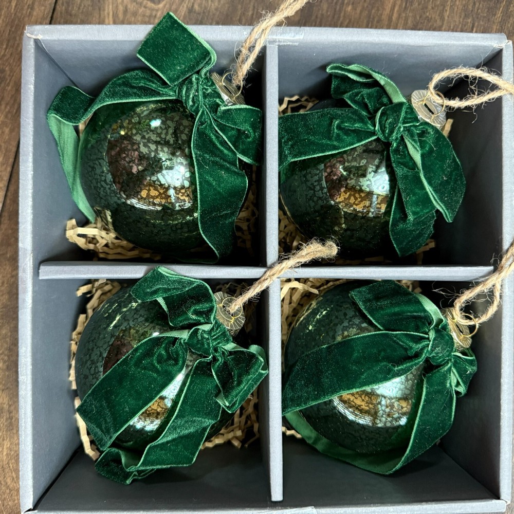 *DISCONTINUED ITEM* Add old-world charm to your holiday tree: Inspired by Victorian-era kugels, our mercury glass ornaments are crafted from antique-finished blown glass. Looking burnished by time, they come in a festive choice of colors with a velvet bow, the symbol of generosity and celebration. Construction Made from glass with aluminum cap. Hangs from polyester ribbon. Set of 4. Dimensions Overall: 4" diam, 4" h Hanging String: 3.5" l Care Dust with a soft, dry cloth. Shipping & handling: We ship same or next day. Large comforters & quilts are vacuum packed with a reusable storage bag to save shipping cost and preserve the item. Questions: Please reach out. We respond very quickly. We strive for 5-star service in our product quality, shipping speed & customer service. We know you have many choices on eBay and appreciate that you have chosen to shop with us. Zoe's Castle | eBay Stores