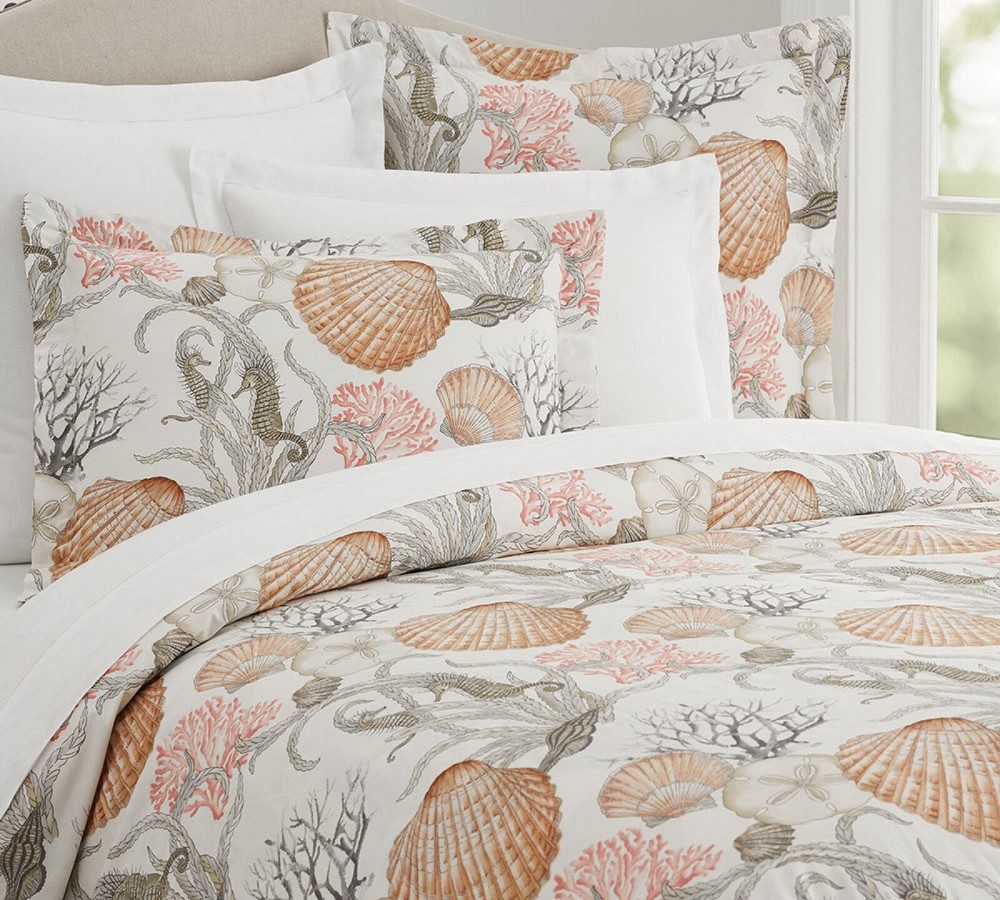 NEW POTTERY BARN MONTEREY COASTAL FULL QUEEN DUVET COVER + 1 EURO SHAM ~Shells Coral Seahorses Sold Out so Don't Miss Out on this lovely Bedding Comes from a Clean Pet Free & Smoke Free Environment PB states the following:Dream of the seaside. Colorful shells and coral bring the spirit of summer to your bed, wherever you are. Woven of 95% conventional cotton and 5% organic cotton. Duvet features a hidden button closure and sham features an envelope closure. Oeko-Tex® certified, the definitive mark of excellence for products that are healthy for you and healthy for the environment. Duvet and sham reverse to same. Full/Queen: 88" long x 92" wide Euro Sham: 26" x 26" square 200-thread count Duvet cover, sham and insert sold separately. Machine wash.