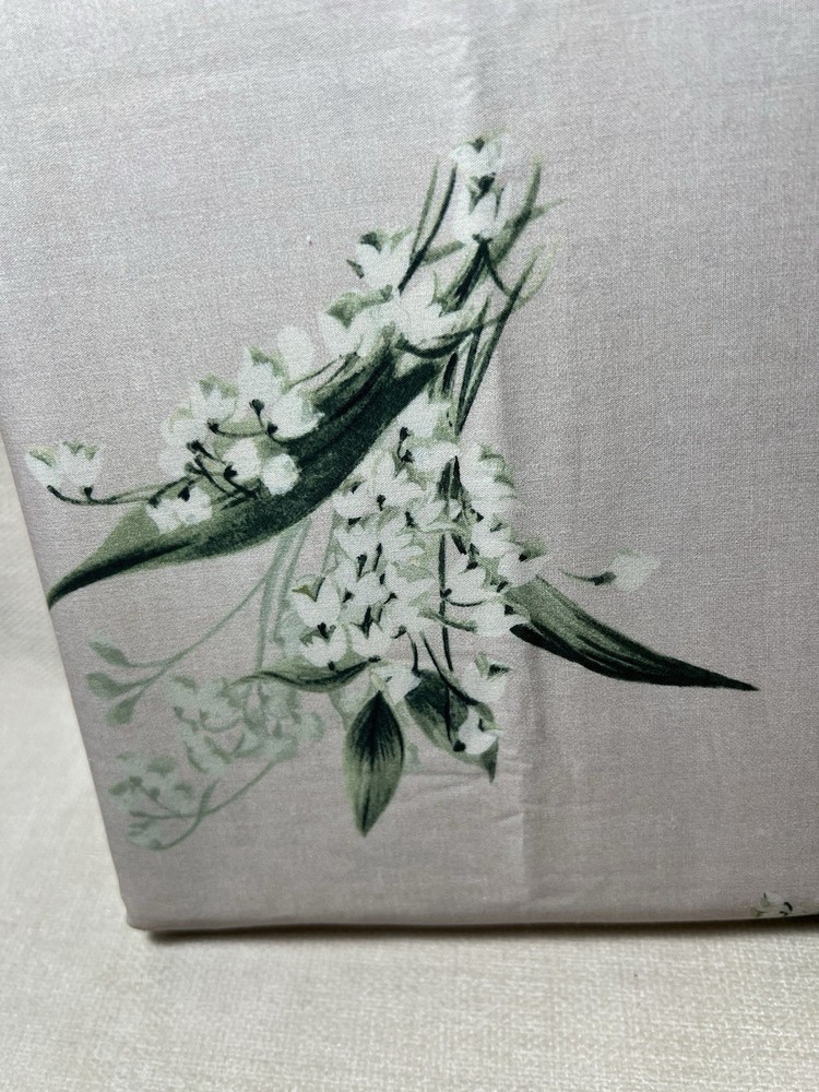 The product is a full/queen size duvet cover made of 100% cotton with a floral pattern. It features a closure type of buttons and is machine washable. The duvet cover is designed for adults and is made in Bahrain. It is part of the Pottery Barn brand and is labeled with the STANDARD 100 by OEKO-TEX certification. The model name is Monique Lhuillier Lily of Valley and it is meant for use in a bedroom.