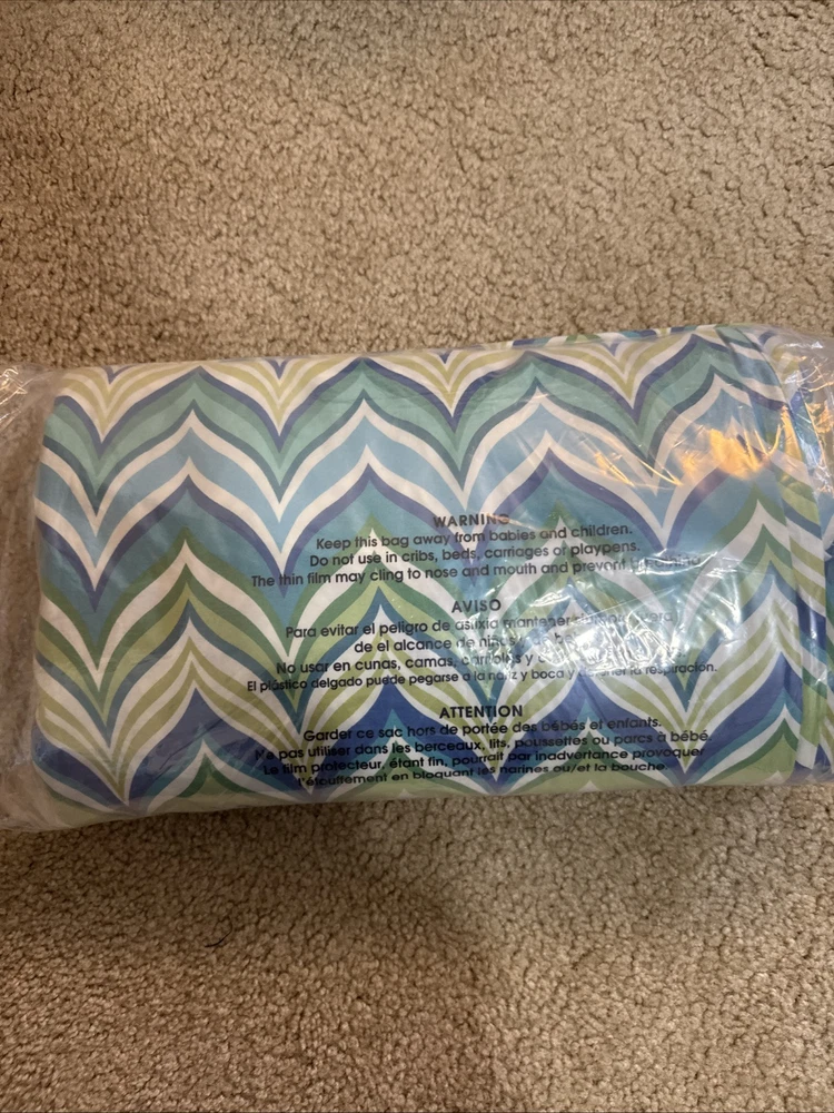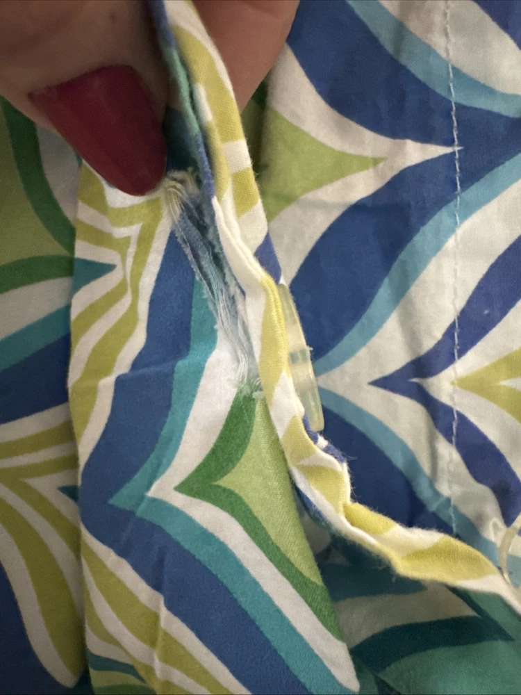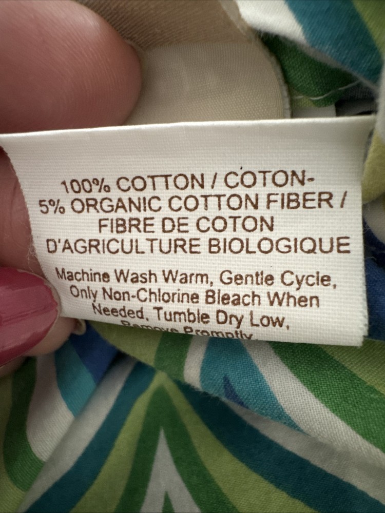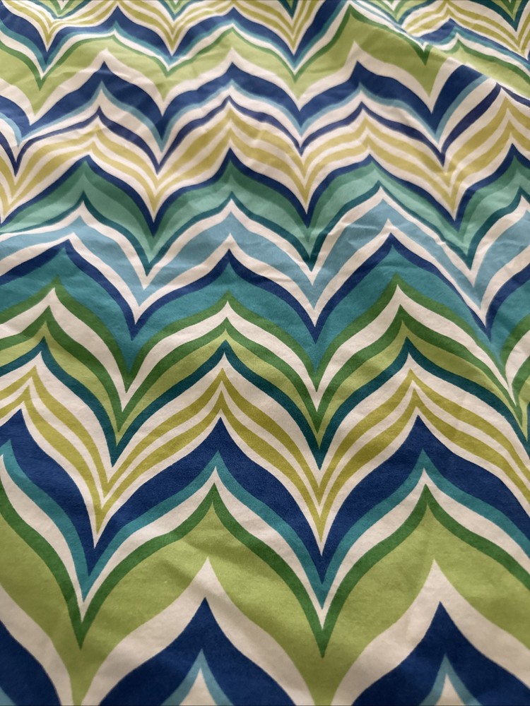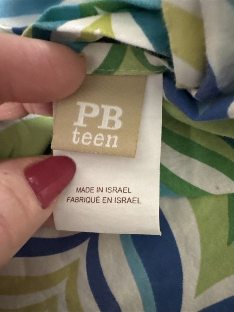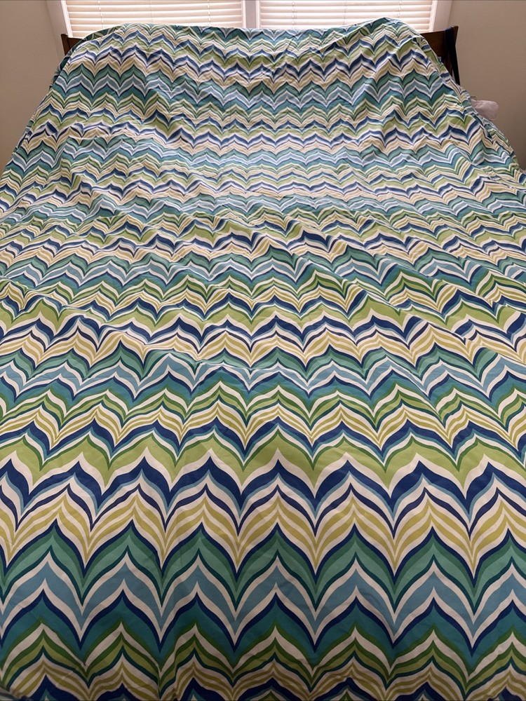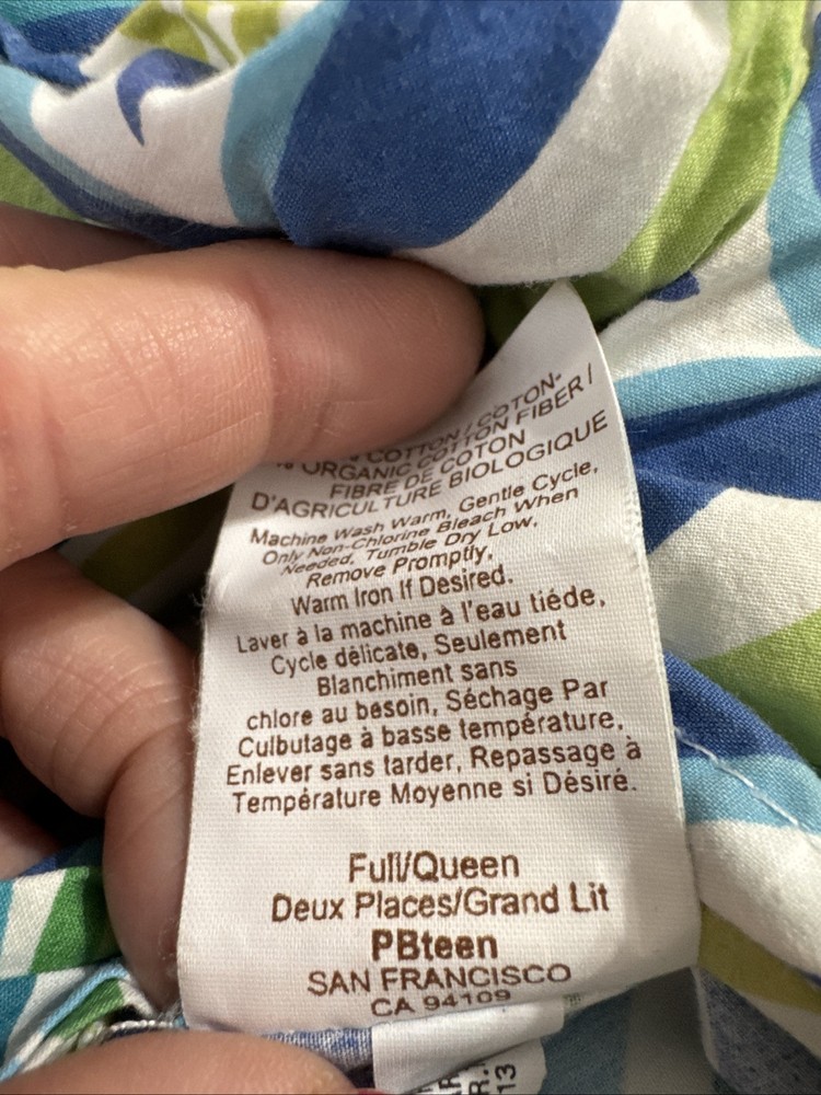 See pic small tear near button. Add a touch of ocean breeze to your bedroom with this Pottery Barn Teen Newport Wave Duvet Cover. Featuring a wave pattern in green, aqua, and mint blue, this full/queen size duvet cover is made of 5% organic cotton, providing a comfortable and eco-friendly sleep. The buttons closure type adds a cute and practical touch to this bedding accessory, while the all-season insulation makes it suitable for every season. Perfect for any teenager's bedroom, this duvet cover is designed with a thread count of 200 or less, providing a soft and breathable feel. Made in Israel, this Pottery Barn Teen Newport Wave Duvet Cover is a must-have for those who love the beach and want to bring a piece of it into their home.