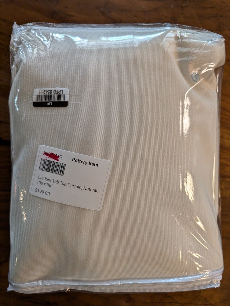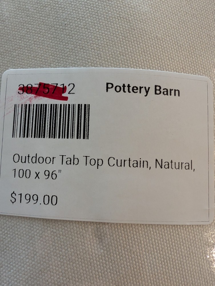 POTTERY BARN Outdoor Tab Top Curtain-100x96"-OPEN BOX Made from 100% polyester in Natural. Tab top includes 15 tabs. Includes 25" long tiebacks. Drape will have middle seam. Sold as one panel. 100x96" SHIPPED FREE!
