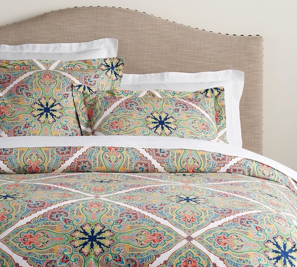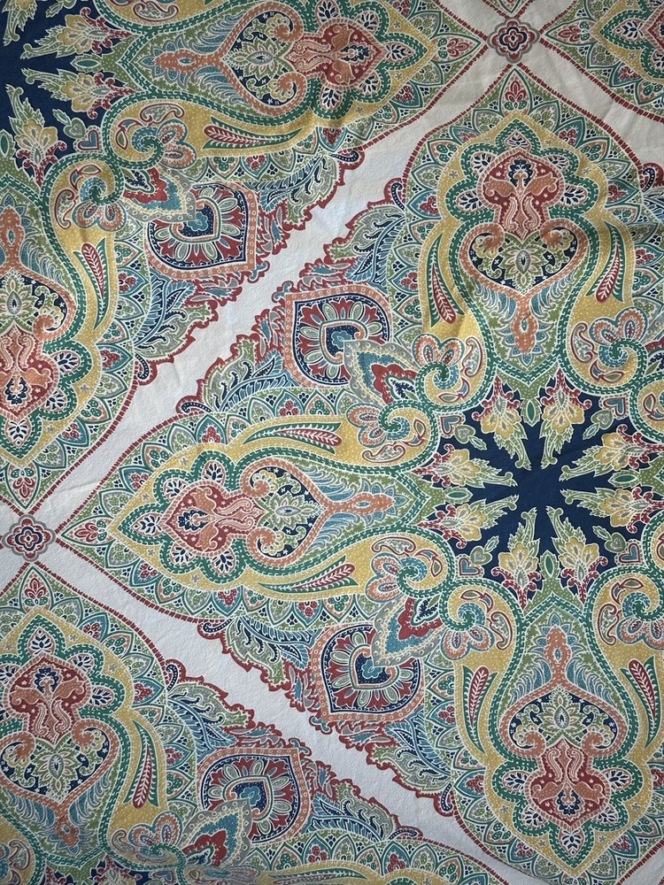 Add a touch of boho style to your bedroom with this stunning king-sized duvet cover from Pottery Barn. Featuring a beautiful paisley pattern and multicolor design, this 100% organic cotton duvet cover is perfect for a comfortable and stylish bedding setup. The fill material is also made of 100% cotton, ensuring a soft and cozy feel. This duvet cover is perfect for anyone who wants to add a touch of elegance to their bedroom decor. The high-quality material and intricate design make it a great addition to any home. With Pottery Barn's reputation for creating high-quality bedding products, you can rest assured that you're getting a duvet cover that will last for years to come. Excellent condition.