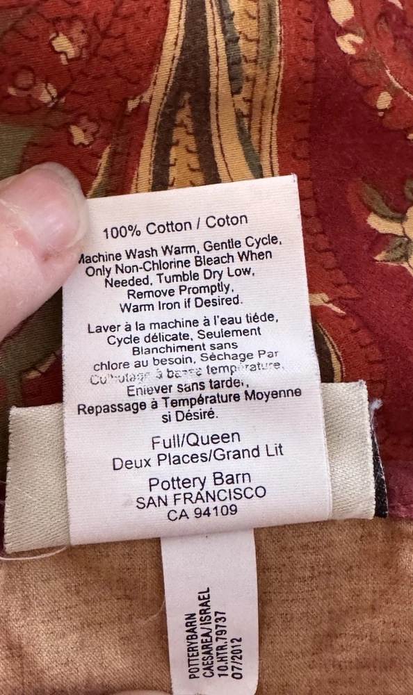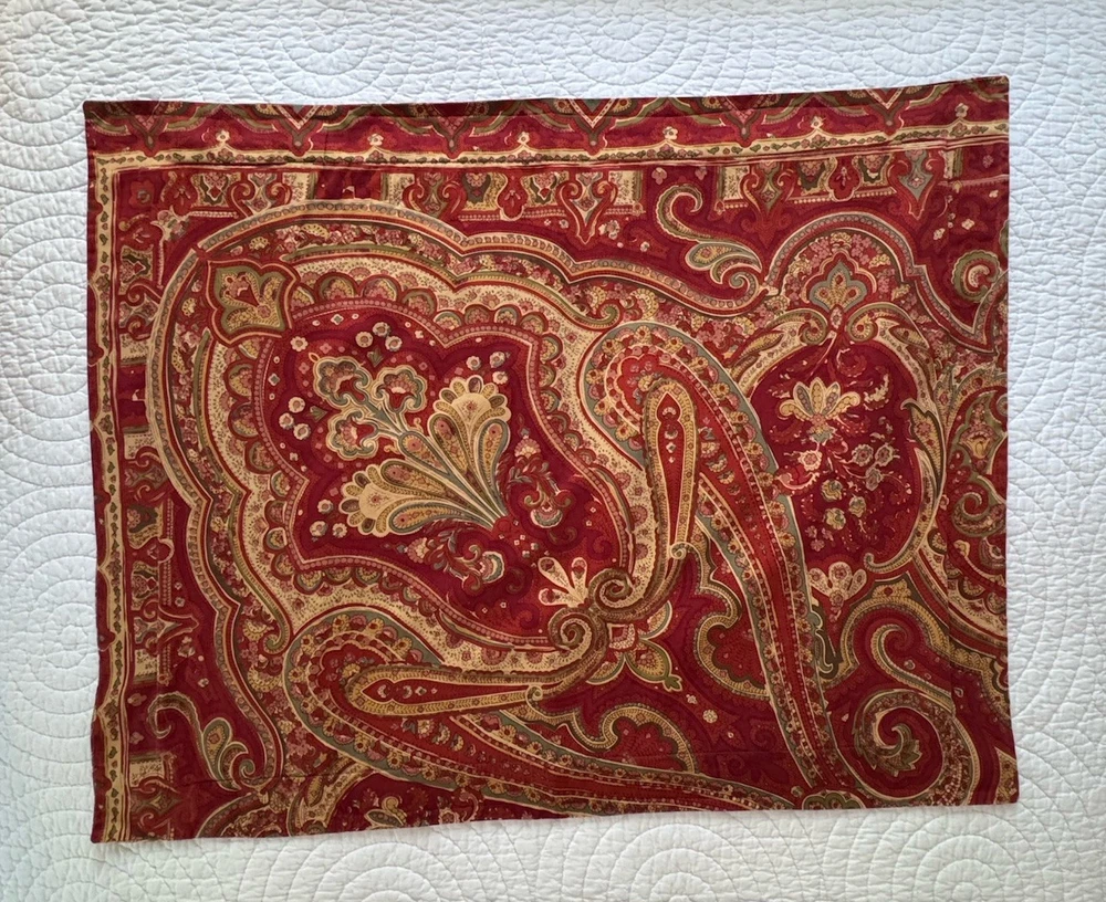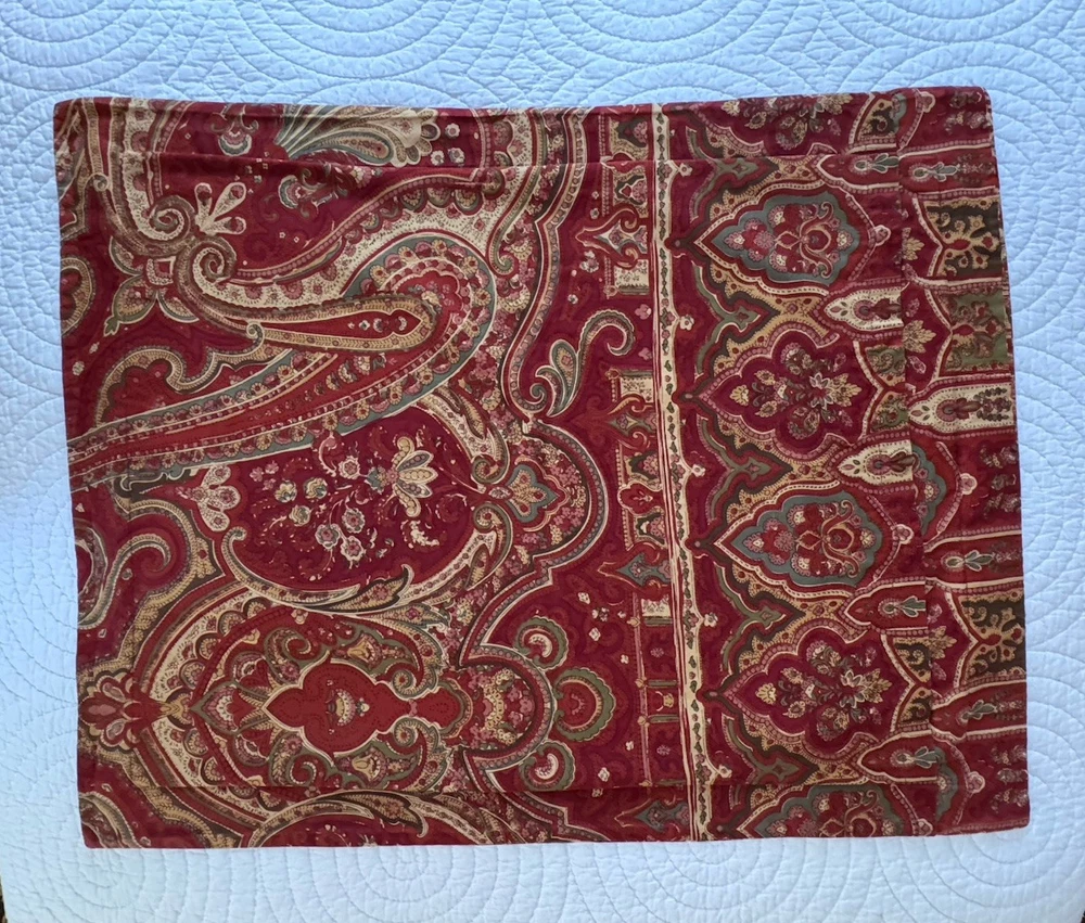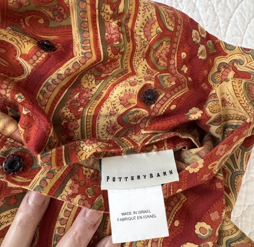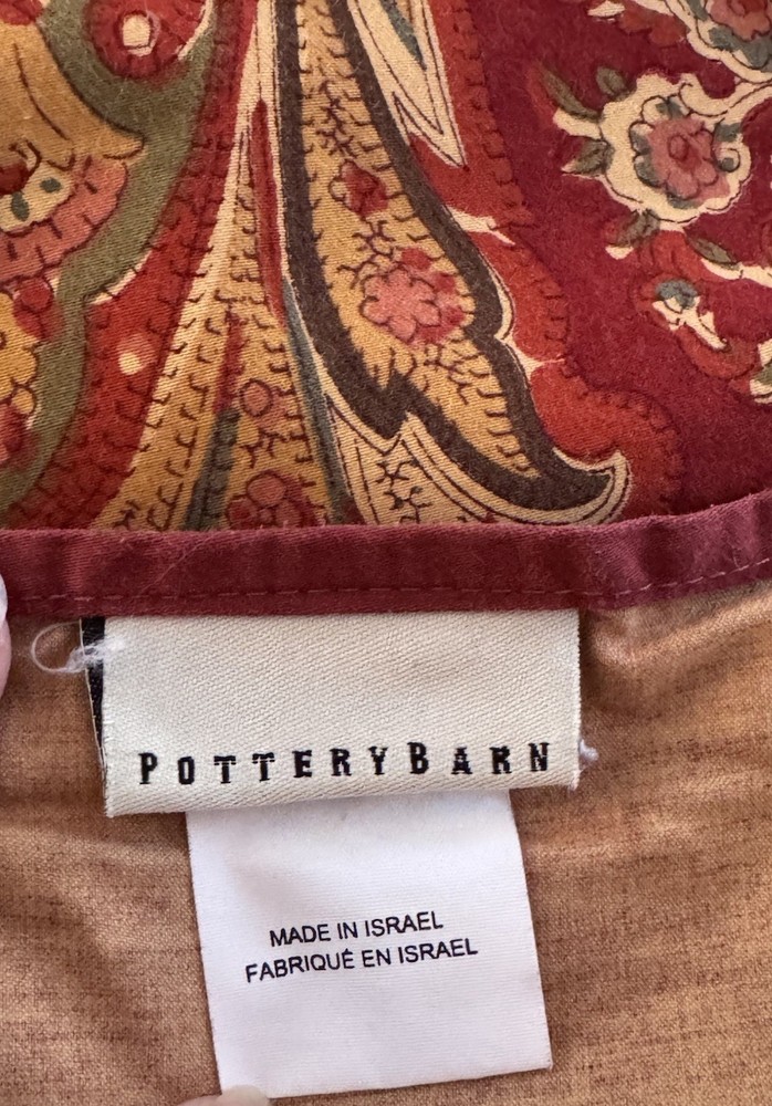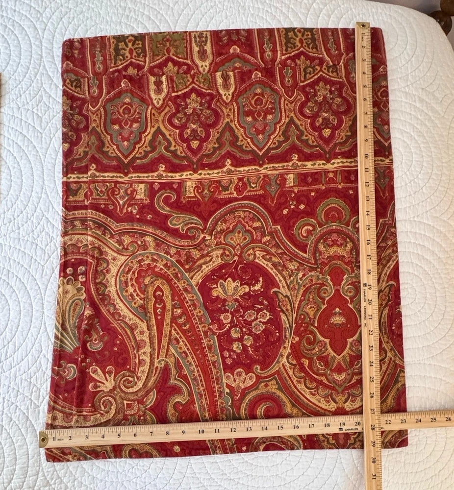 POTTERY BARN Red Tan Green Paisley Talia FULL/QUEEN Duvet Cover 2 Shams 3pc Set. Measurements: F/Q Duvet L 88” W 88”. Standard Shams L 29.5” W 23”. Duvet has buttons and ties to secure your comforter insert. One button replaced as it was missing. Shams have multiple snaps to secure your pillow insert. Pre-owned good condition showing minor wear. One buttonhole has a slight tear and a new replaced missing button (see enhanced images). Item has been laundered and ready for immediate use. Please see all pictures to review the age, use and condition of the item as this is part of the description. Pictures on many phones/computers do not display the colors or the tone the same as the original images; if you have questions regarding this please contact me. Ships within 3 business days.