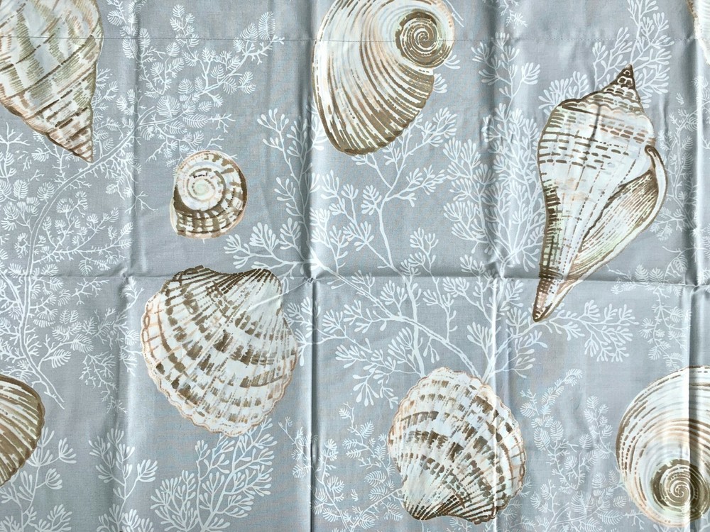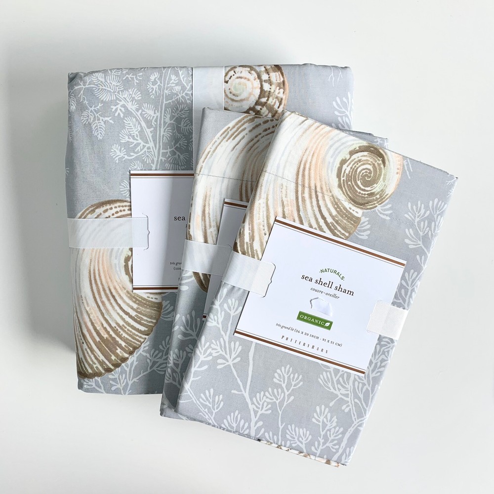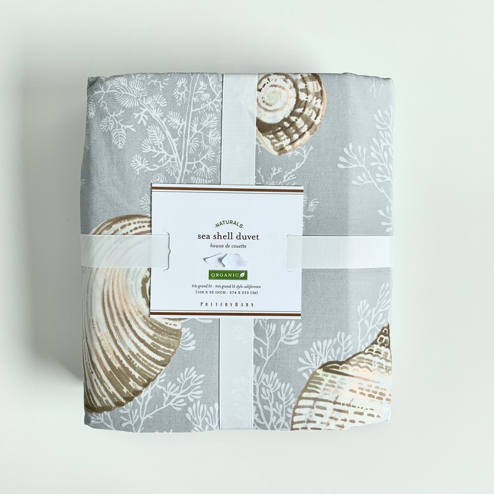 Pottery Barn SUMMER SEASHELL ORGANIC DUVET COVER & 2 Euro SHAMs Total 3 pieces! 100% organic cotton Color: Gray, natural /, see picture Duvet Cover Size King: 108 x 92" 2 Euro shams: 26 x 26" Depicted in lifelike detail, these remarkable seashells float the depths of the ocean amidst underwater botanicals on pure organic cotton percale. New in Original Package Pure cotton percale interwoven with 100% organic cotton fibers. 200-thread count. Duvet cover reverses to the same design. Sham reverses to solid color. Duvet cover has a button closure; sham has an envelope closure. Easy-Care finish. Machine wash. Imported. From smoke free, pet friendly home!