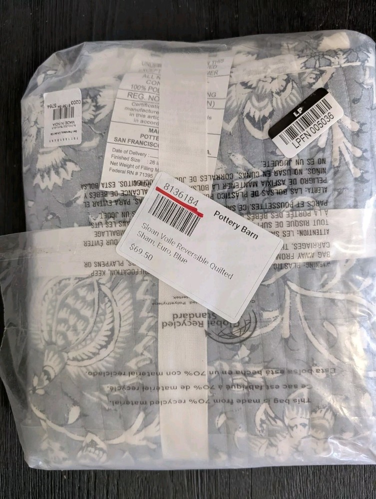 POTTERY BARN Sloan Voile Reversible Sham-Blue-Euro-NWT Handcrafted from 100% cotton, reverses to coordinating pattern. 100% polyester fill. Sham features a zipper closure. 26x26" SHIPPED FREE!...