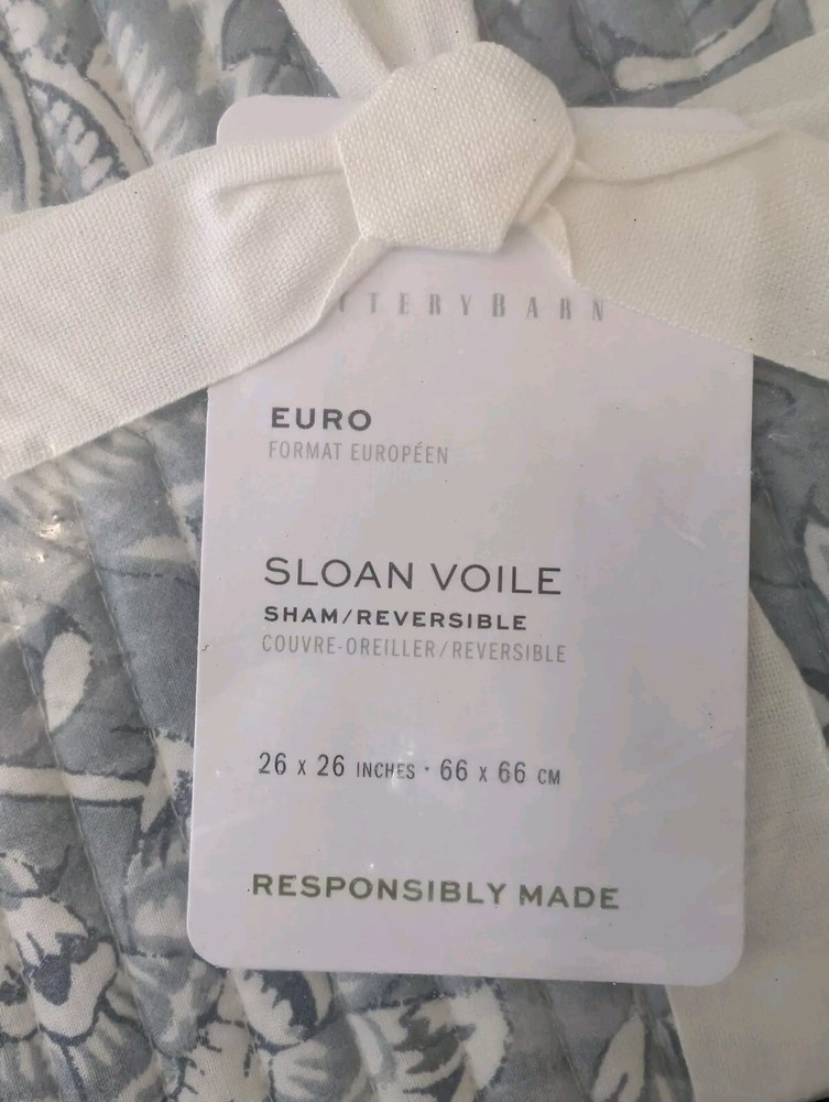 POTTERY BARN Sloan Voile Reversible Sham-Blue-Euro-NWT Handcrafted from 100% cotton, reverses to coordinating pattern. 100% polyester fill. Sham features a zipper closure. 26x26" SHIPPED FREE!