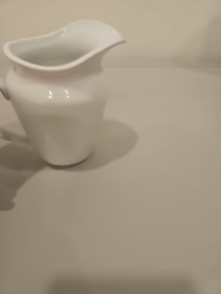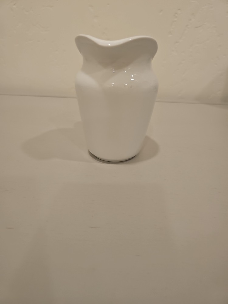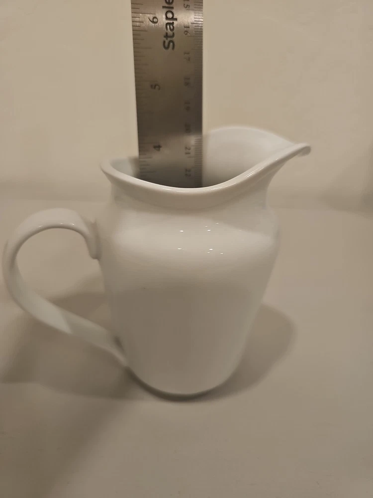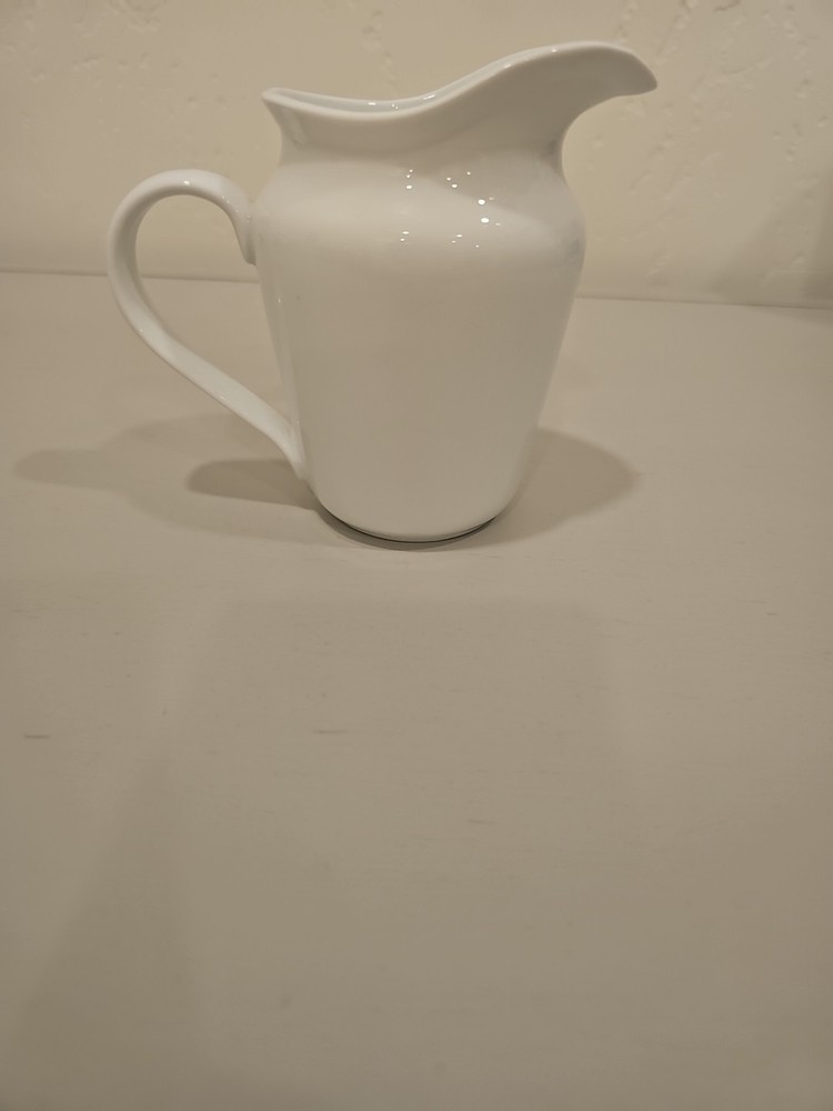 The Pottery Barn Small White Pitcher/Creamer is a beautifully crafted piece made of porcelain or ceramic, featuring a solid white color with a glossy finish. This creamer is an original production style from Pottery Barn, showcasing art pottery techniques. With its elegant design and dishwasher-safe feature, it is perfect for serving cream or milk at the dining table or adding a touch of sophistication to any table setting. Made in China, this creamer combines quality craftsmanship with a timeless aesthetic.