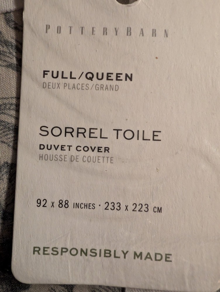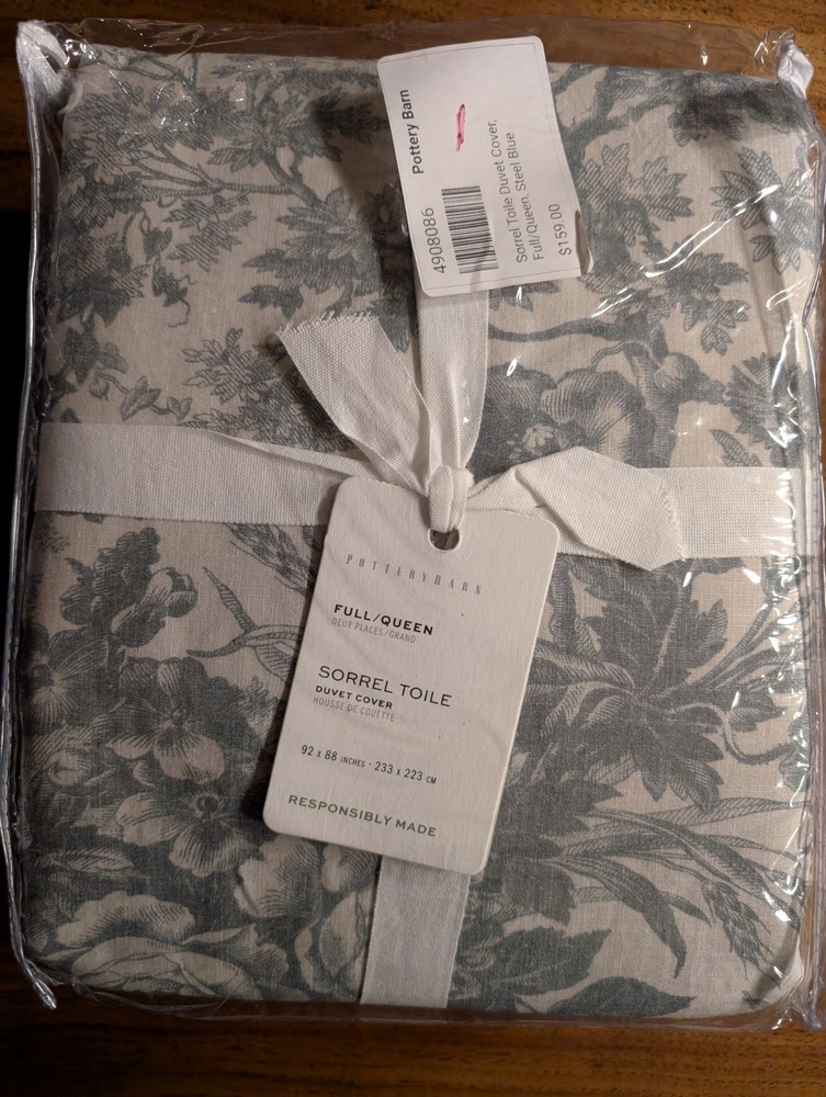 POTTERY BARN Sorrel Toile Duvet Cover-Full/Queen-Steel Blue-NWT Made of 100% cotton, reverses to the same. Duvet features a hidden button closure with inner ties to keep insert in place. Insert sold s...