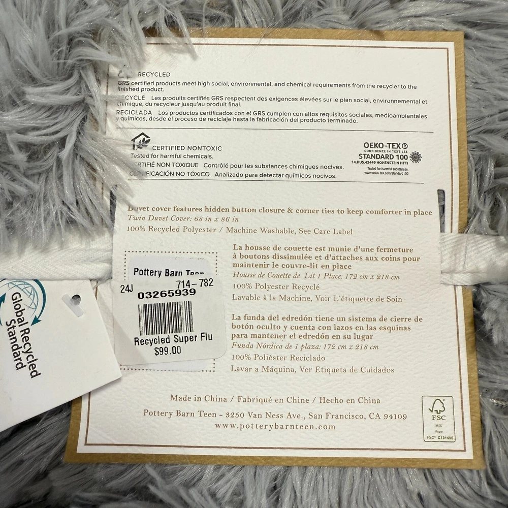 Long, luxe and ultra-fluffy faux fur makes our reversible duvet cover and sham supercool and cuddle-ready. The silky fur is backed in recycled microfiber for a smooth finish, and you can rest easy knowing it's gentler on the planet. OEKO-TEX® STANDARD 100: tested for 1000+ harmful substances to keep you and your family safe from chemicals common to textile manufacturing. 14.HUS.42449 HOHENSTEIN HTTI. Made from 100% recycled polyester with soft and shaggy cover and reverses to 100% recycled polyester microfiber. Twin-sized duvet cover fits both standard twin and twin XL dorm mattresses. Sham reverse to a solid color. Duvet cover has interior ties and a hidden button closure to keep the duvet in place; sham has an overlap closure. Duvet Cover Twin/Twin XL: 68" wide x 86" long CARE AND MAINTENANCE Machine wash in cold water; gentle cycle. Use only non-chlorine bleach, if needed. Tumble dry on low heat. Do not iron. Shipping & handling: We ship same or next day. Large comforters & quilts are vacuum packed with a reusable storage bag to save shipping cost and preserve the item. Questions: Please reach out. We respond very quickly. We strive for 5-star service in our product quality, shipping speed & customer service. We know you have many choices on eBay and appreciate that you have chosen to shop with us. Zoe's Castle | eBay Stores