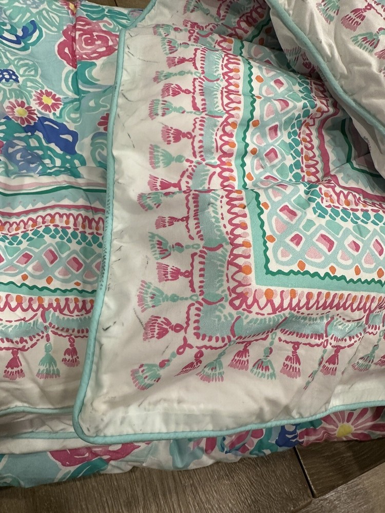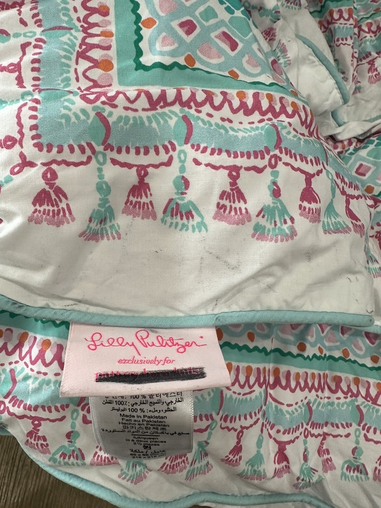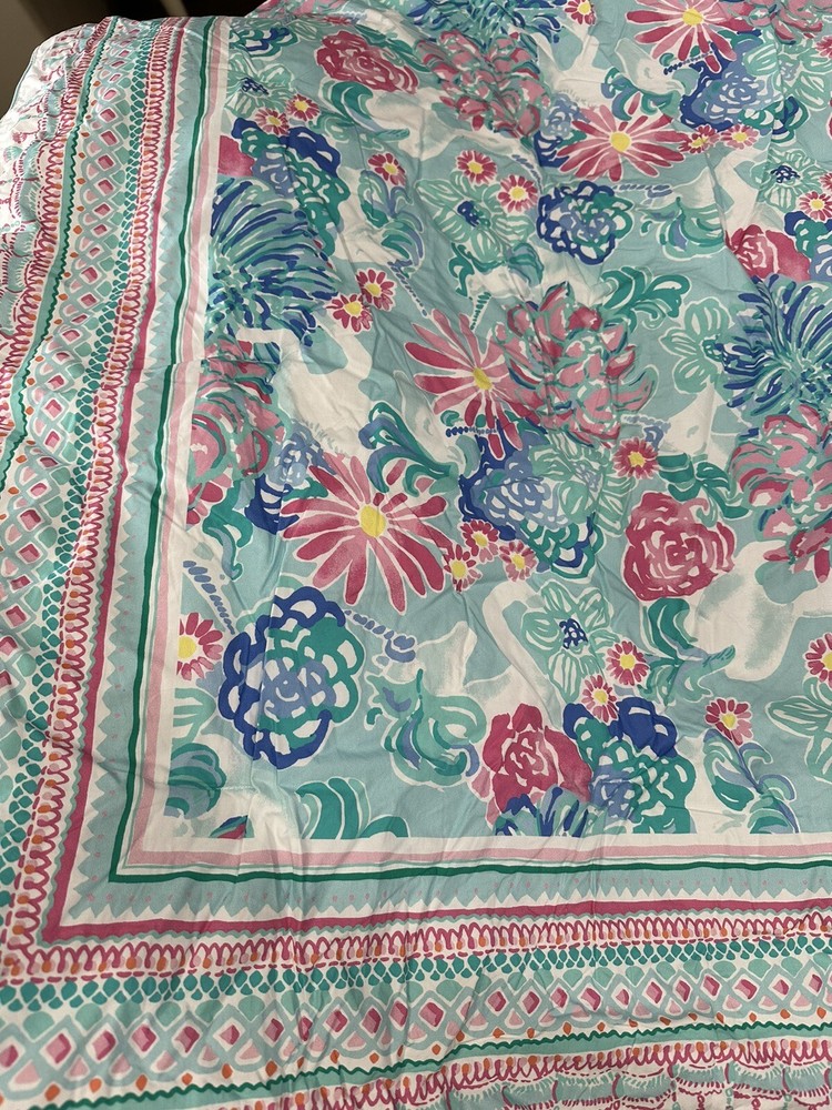 You are purchasing one Pottery Barn Teen Lilly Pulitzer Unicorns in bloom Quilt size is queen Has a black line through the Pottery Barn name on the attached tag excellent used condition. unfaded, has a few markings a long one edge. No rips or odor.