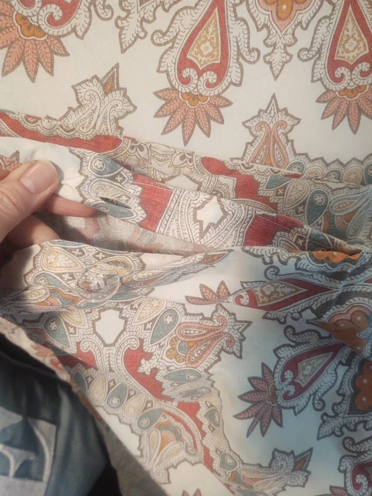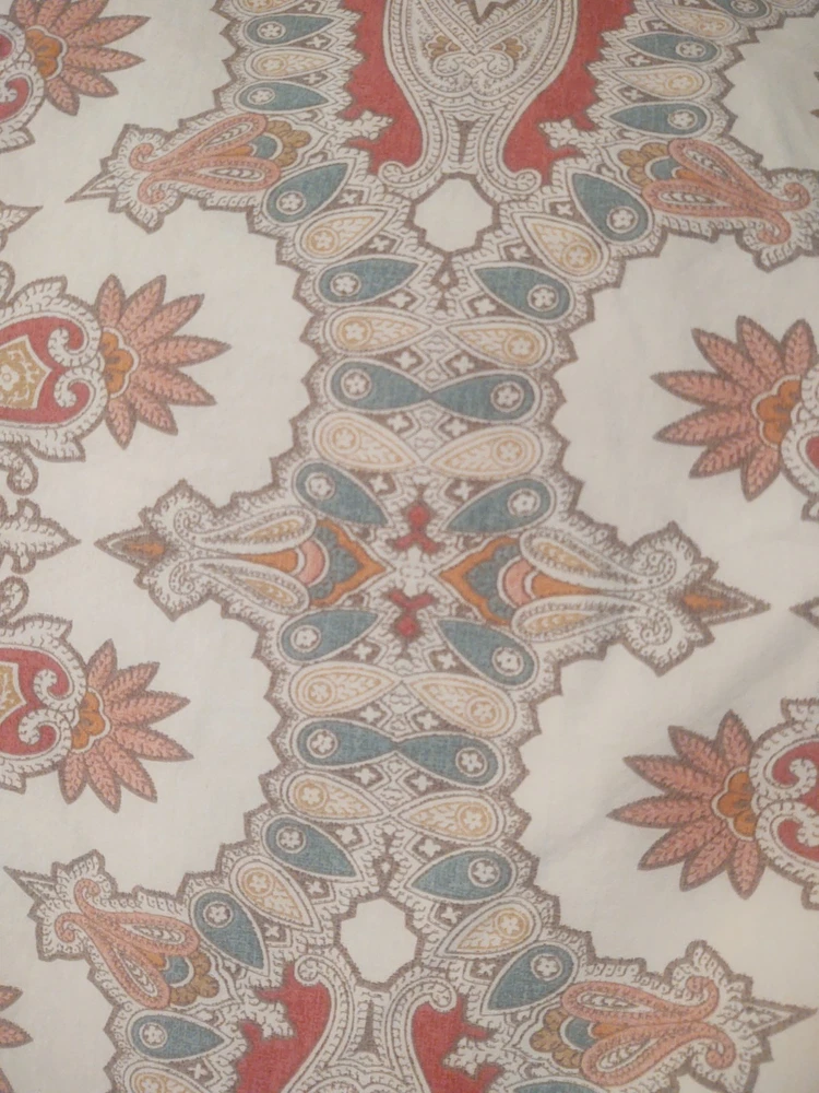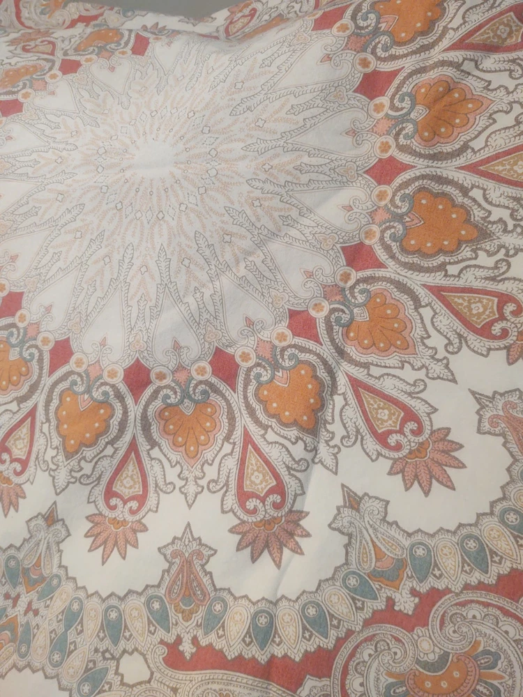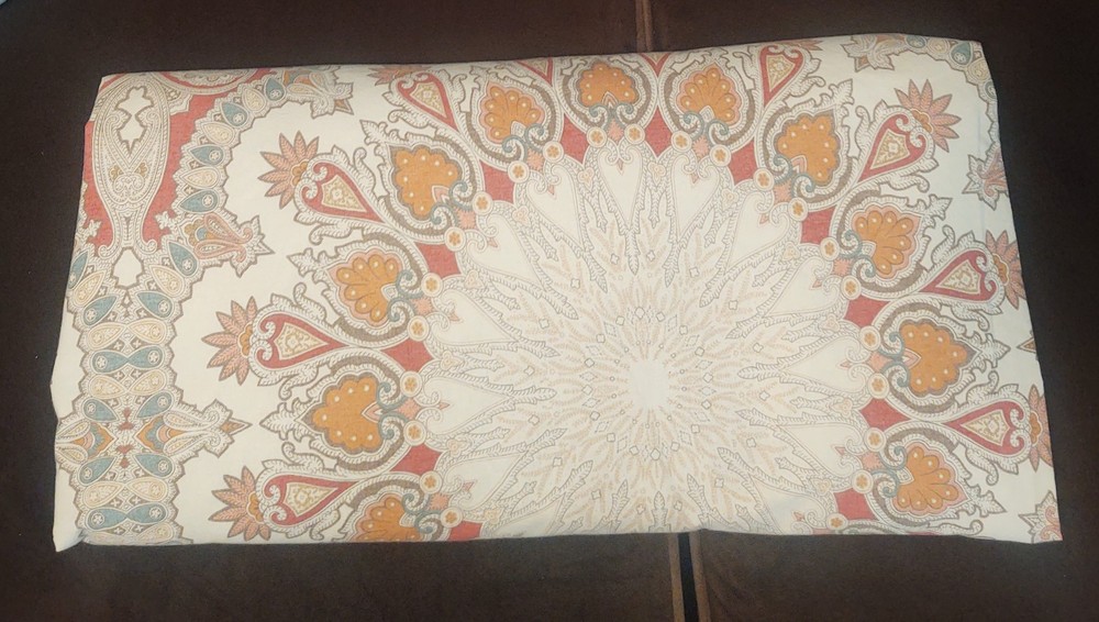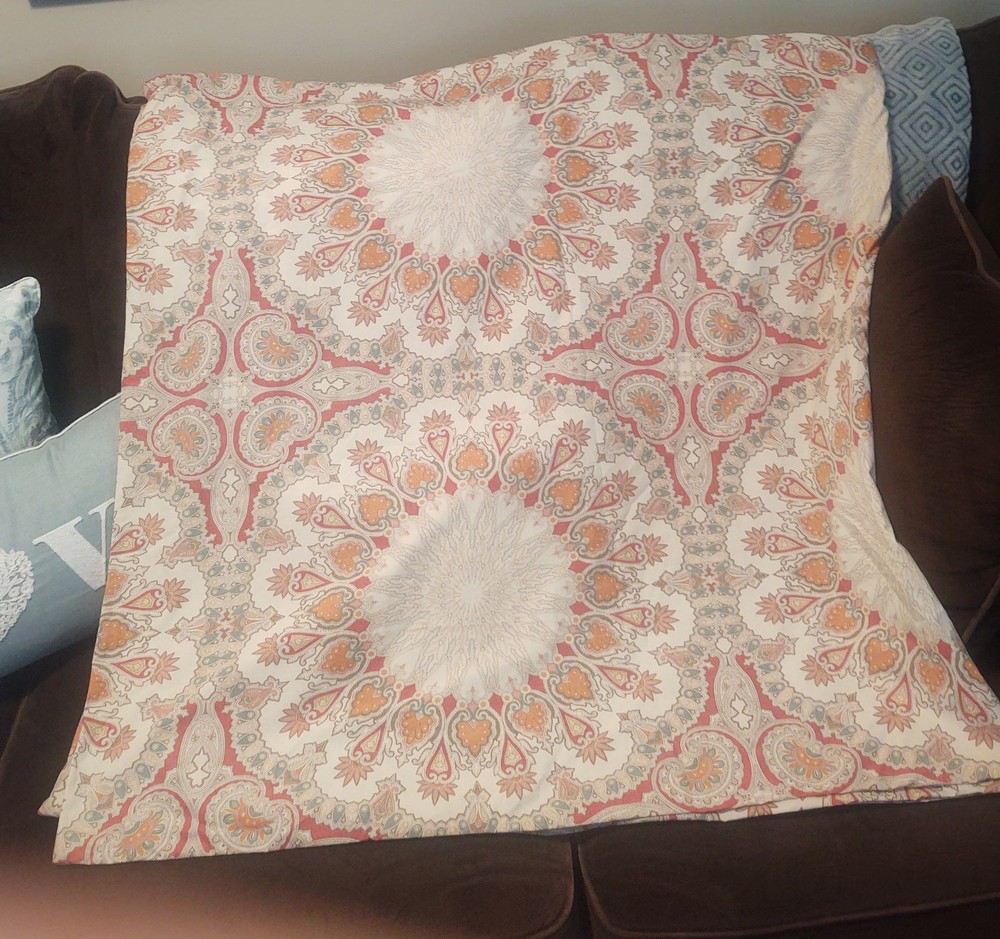POTTERY BARN VALENCIA FULL / QUEEN DUVET COVER PAISLEY MEDALLION 100% COTTON SIZE: LABEL FULL / QUEEN 88 X 88 Pottery Barn Valencia Percale Organic Duvet Cover, Full/Queen size, showcasing a paisley medallion pattern in beige, orange, and teal on a white background. Material: Made of 100% cotton percale. Percale is a tightly woven fabric known for its durability and crisp feel. Design: Features a bohemian-inspired paisley medallion pattern.