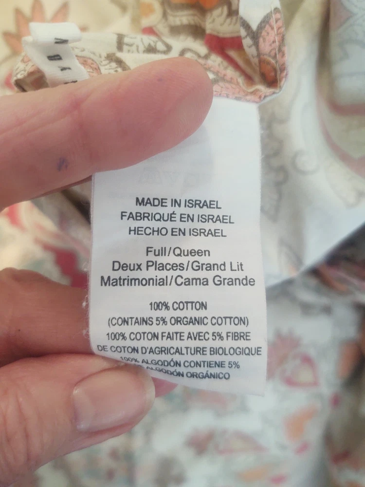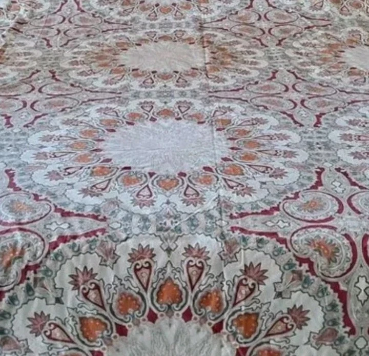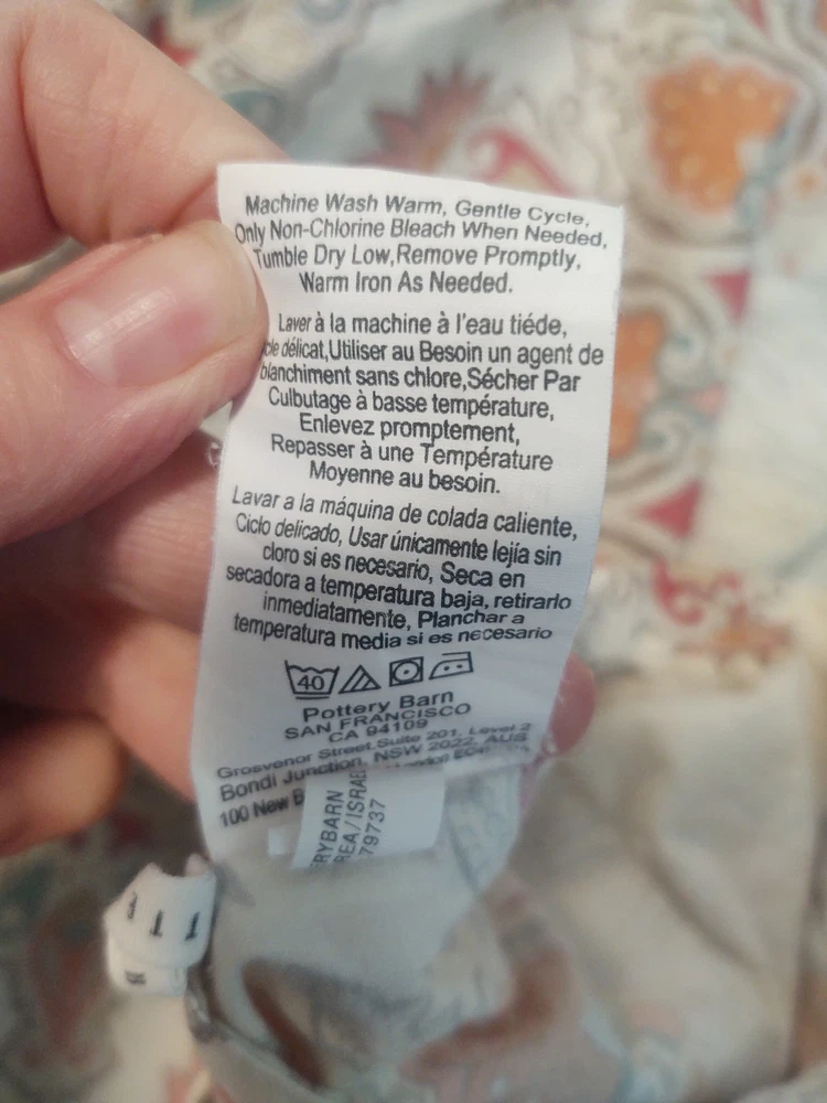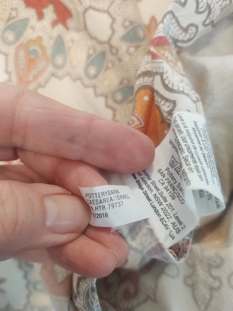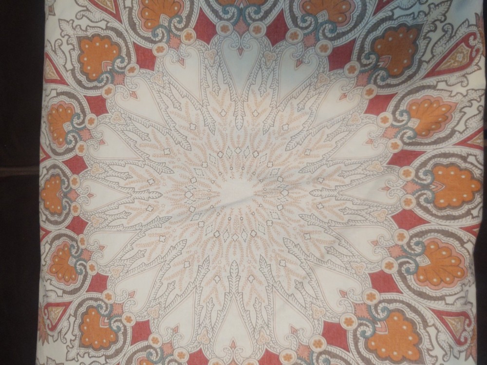 POTTERY BARN VALENCIA FULL / QUEEN DUVET COVER PAISLEY MEDALLION 100% COTTON SIZE: LABEL FULL / QUEEN 88 X 88 Pottery Barn Valencia Percale Organic Duvet Cover, Full/Queen size, showcasing a paisley medallion pattern in beige, orange, and teal on a white background. Material: Made of 100% cotton percale. Percale is a tightly woven fabric known for its durability and crisp feel. Design: Features a bohemian-inspired paisley medallion pattern.