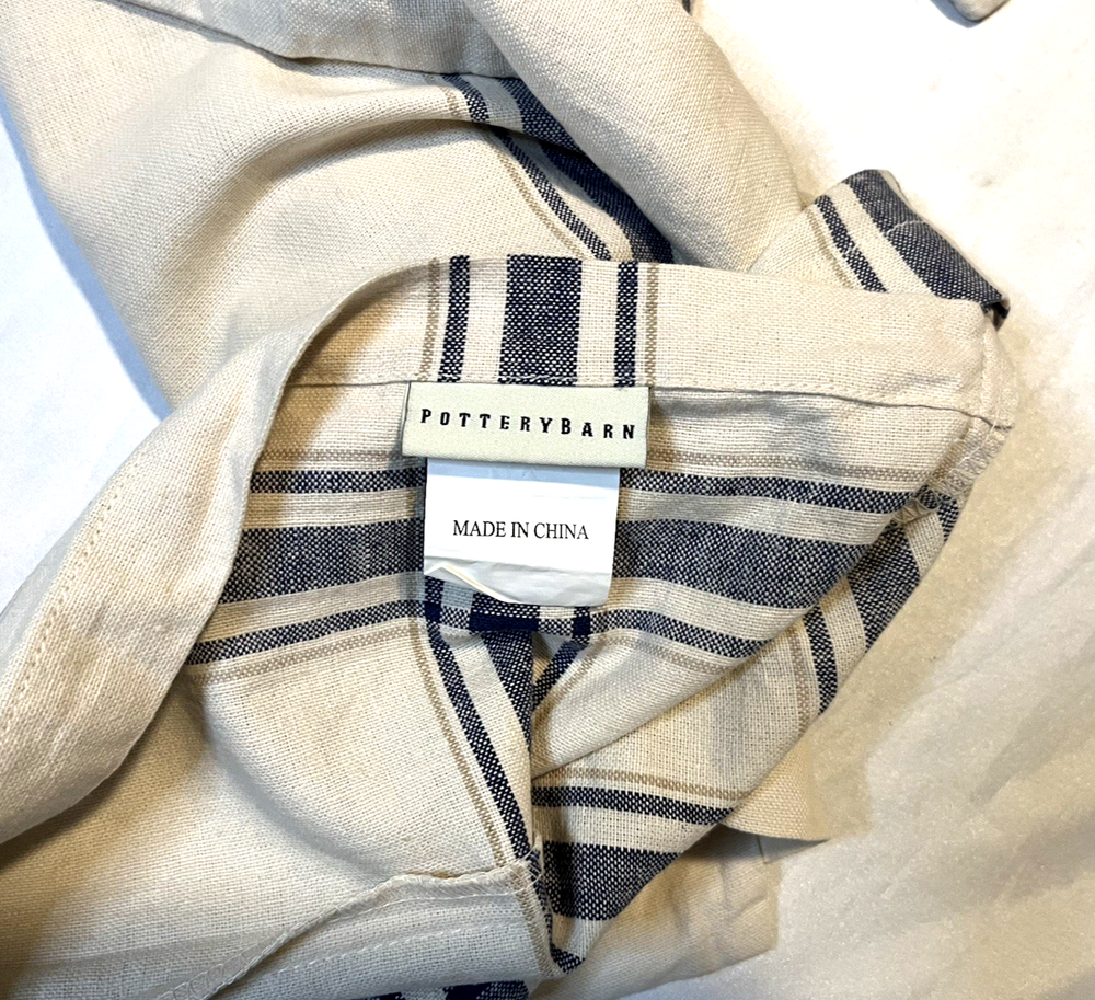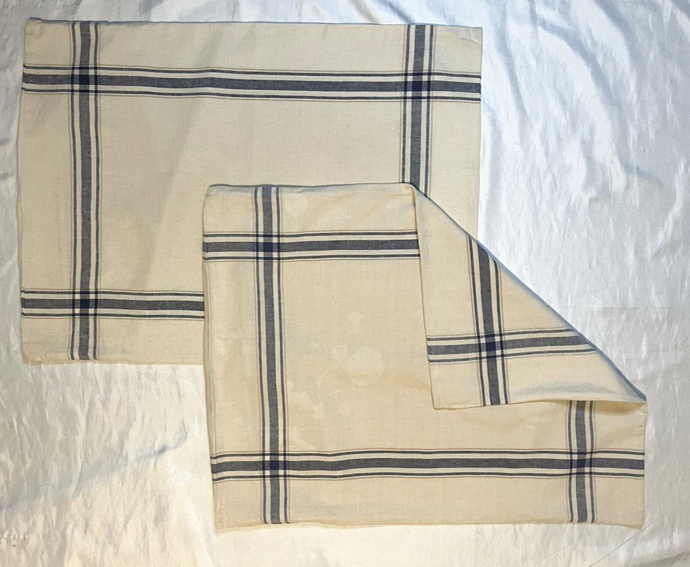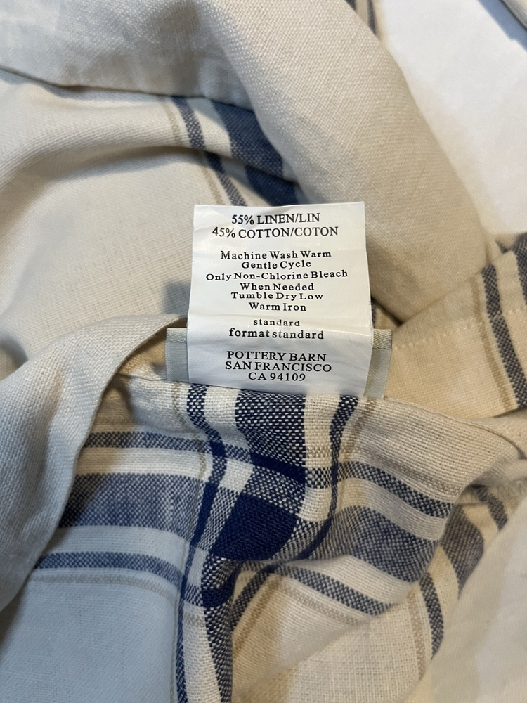 WONDERFUL pair of standard shams by POTTERY BARN in cream with a medium blue plaid. 55% linen and 45% cotton. Machine wash and tumble dry. Each measures about 26" X 20" MINT CONDITION! Mix and match with your favorite bedding. NOTE: I make every effort to provide accurate pictures, but my camera may or may not capture the exact true color of an item in photos; further, individual monitors tend to convey colors differently. .