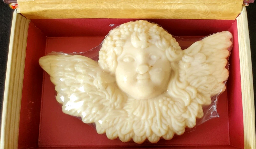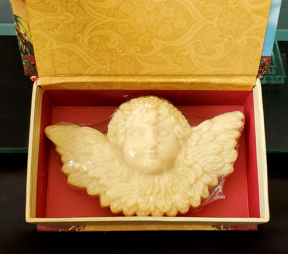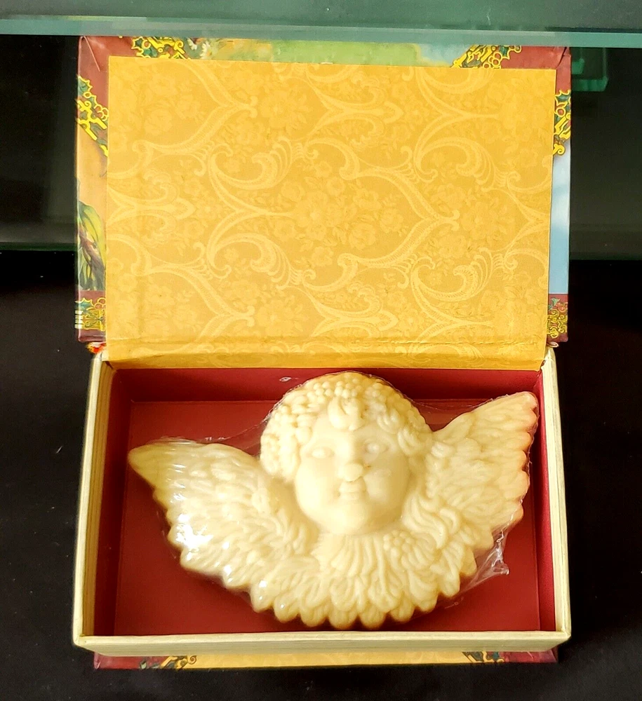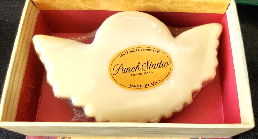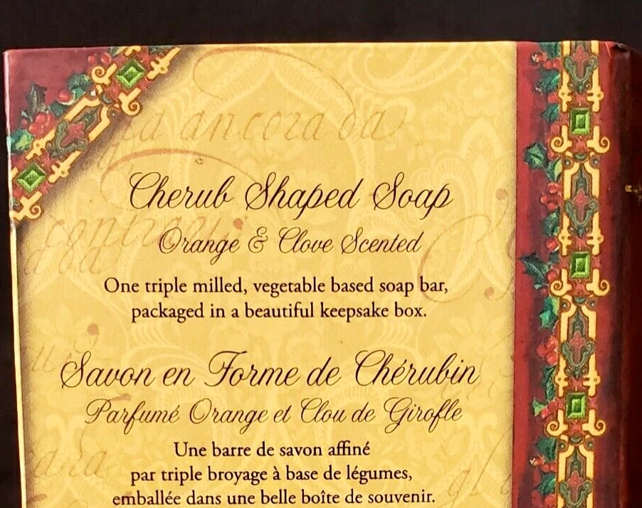 PUNCH STUDIO - CHERUB SOAP IN VINTAGE-INSPIRED KEEPSAKE "BOOK" BOX. ORANGE & CLOVE SCENTED. ONE TRIPLED-MILLED, VEGETABLE BASED SOAP BAR PACKAGED IN A BEAUTIFUL KEEPSAKE BOX. 2.94 OZ/84 GRAMS. MEASURES: 3" X 4.5" X 1.5". CONDITION: NEW WITH DEFECT. SOAP IS IN CELLOPHANE SHRINK-WRAP. THE NOSE ON CHERUB APPEARS TO BE FLATTENED A LITTLE. SEE CLOSE-UP. QUESTIONS ARE WELCOME. SALE IS FINAL.