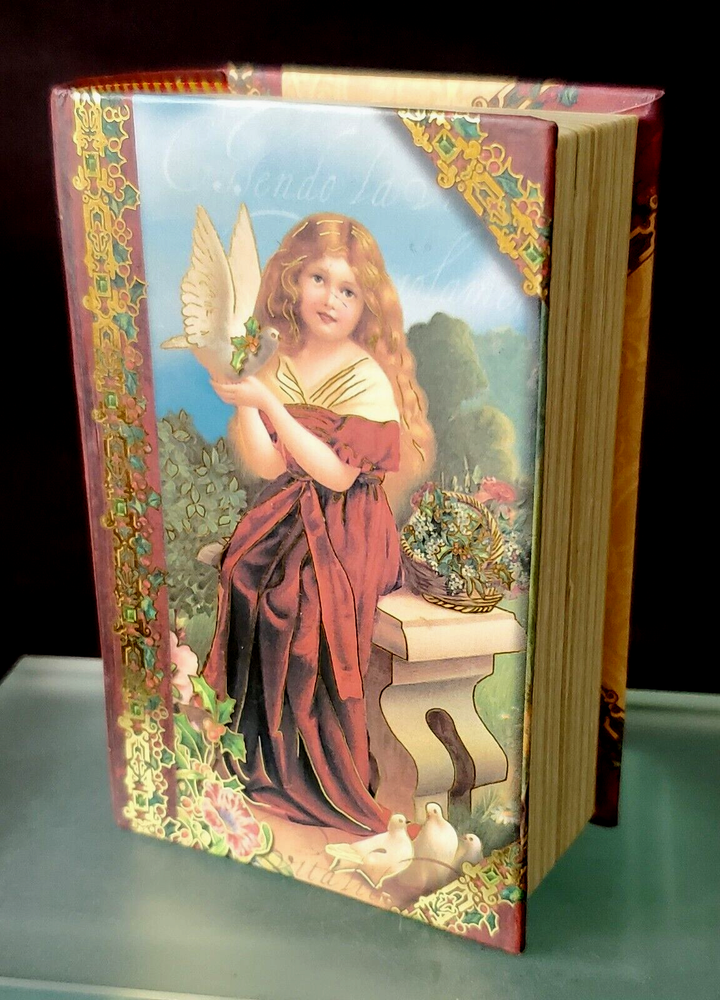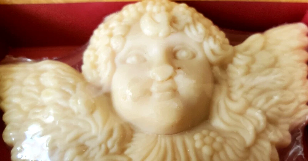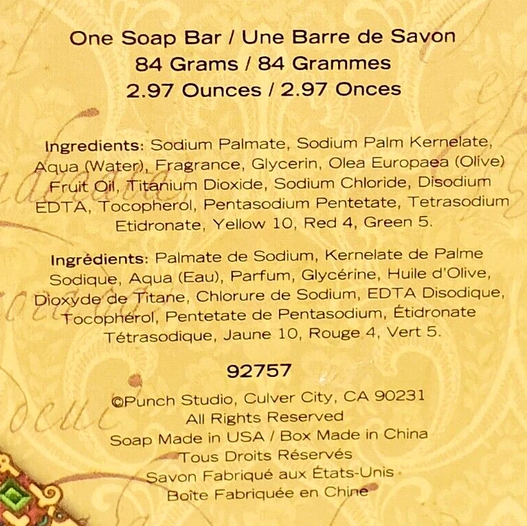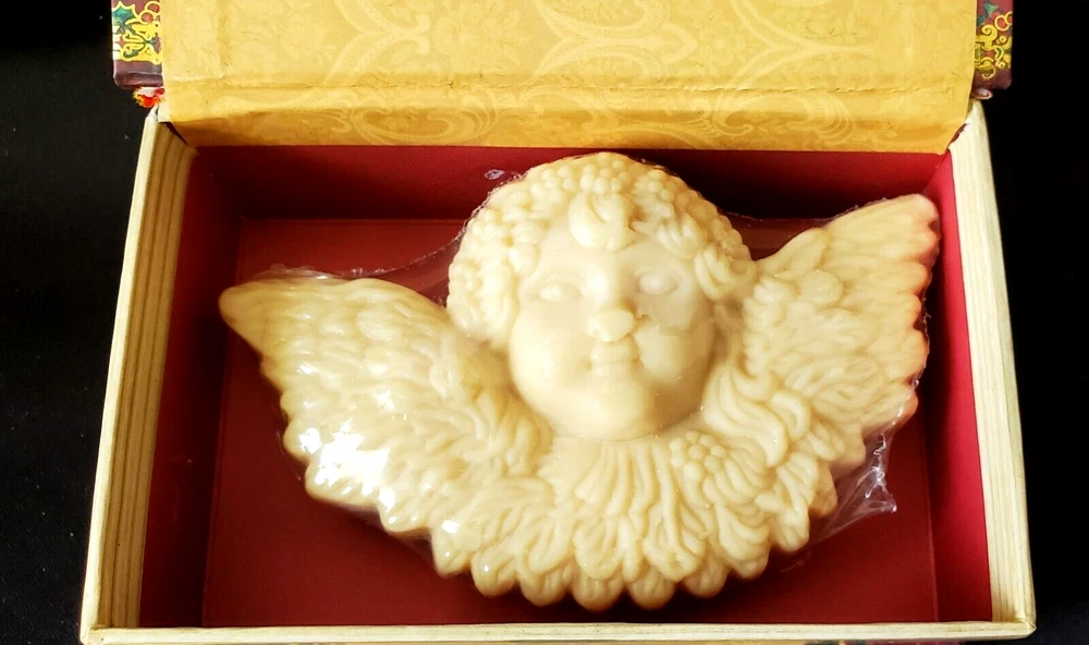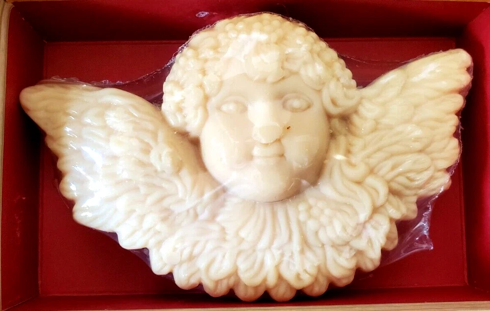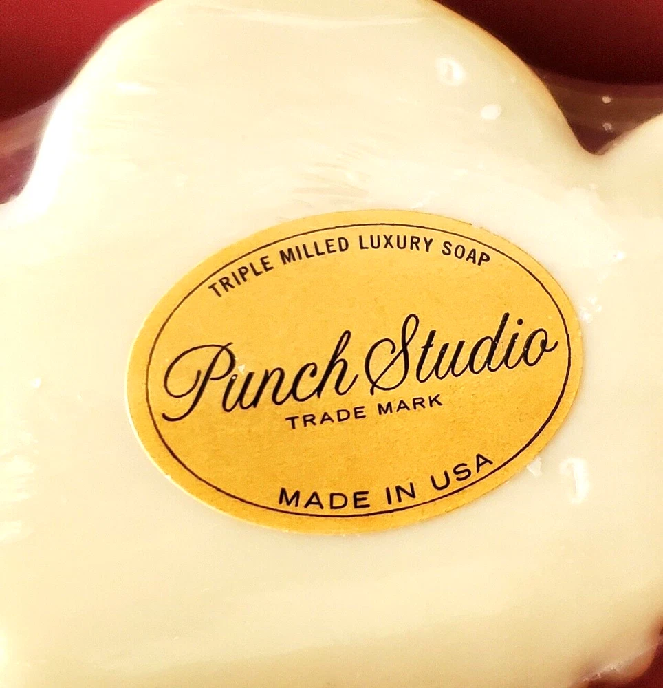 PUNCH STUDIO - CHERUB SOAP IN VINTAGE-INSPIRED KEEPSAKE "BOOK" BOX. ORANGE & CLOVE SCENTED. ONE TRIPLED-MILLED, VEGETABLE BASED SOAP BAR PACKAGED IN A BEAUTIFUL KEEPSAKE BOX. 2.94 OZ/84 GRAMS. MEASURES: 3" X 4.5" X 1.5". CONDITION: NEW WITH DEFECT. SOAP IS IN CELLOPHANE SHRINK-WRAP. THE NOSE ON CHERUB APPEARS TO BE FLATTENED A LITTLE. SEE CLOSE-UP. QUESTIONS ARE WELCOME. SALE IS FINAL.