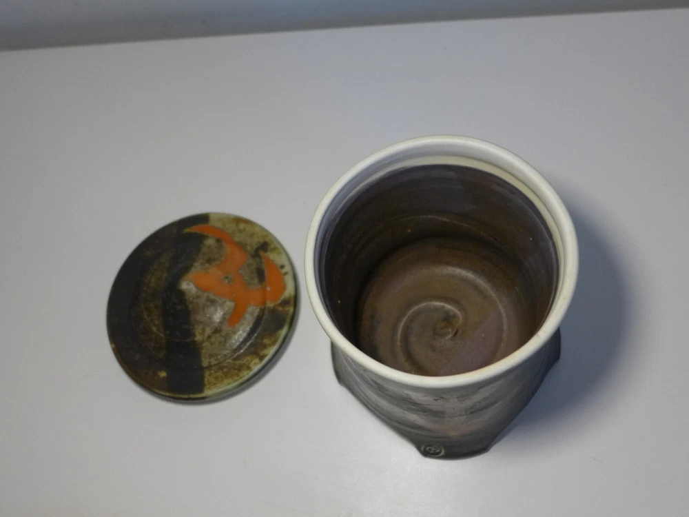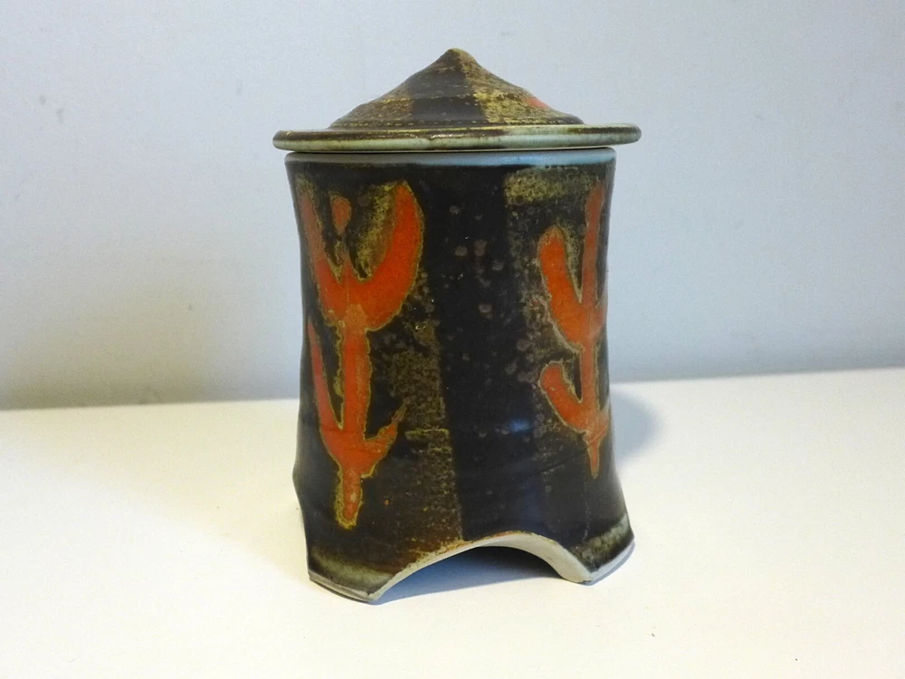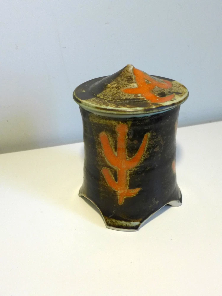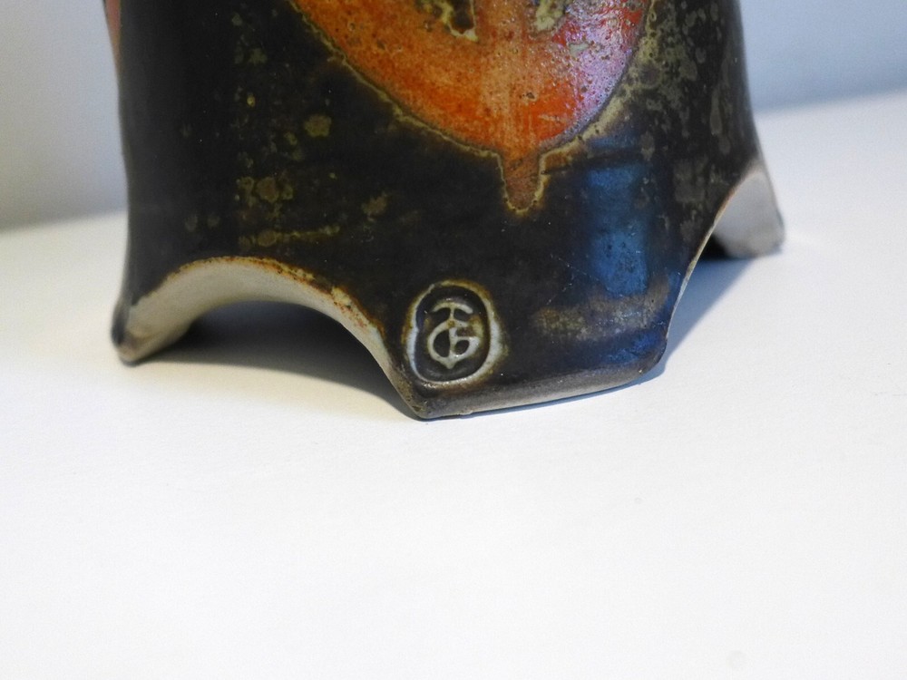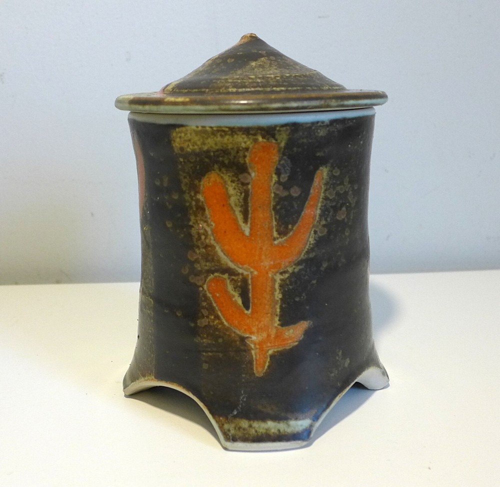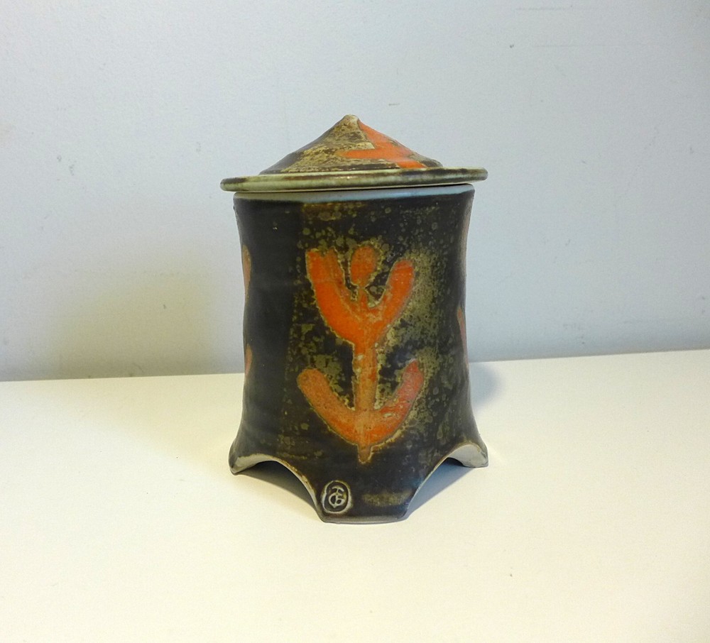Pagoda Shaped Lidded Box Wonderful studio pottery piece is a perfect addition to your collection. Hand thrown pottery design in the shape of a four legged pagoda. Intricate glaze design is deep brown, tan, blue with orange figural patterns. Hand stamped TG on foot. Measures 7" tall with lid on x 4.25" in diameter. In good vintage condition. One tiny flea bite chip to top of lid. PLEASE EXAMINE THE COMPLETE LISTING DETAILS AND ALL PHOTOGRAPHS You are purchasing an original vintage item (unless otherwise noted) that is over 20 years old. I lightly clean, touch up and test or inspect each item for functionality and flaws. These vintage objects have wear and tear that is detailed in the listing and photos (zoom in). My furniture has not been fully restored, if you are looking for a Perfect piece, you may need to perform further painting, refinishing, upholstery or other restoration. Feel free to ask any questions concerning the items condition prior to purchase. You may request additional photographs. I do not accept returns or provide refunds on my shop items. However, if an item has been damaged in shipping, please reserve the original box and all packing materials and contact me as soon as possible. I insure most packages and can handle a damaged item shipping claim for you.