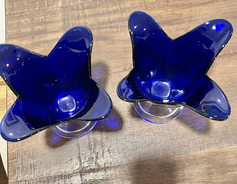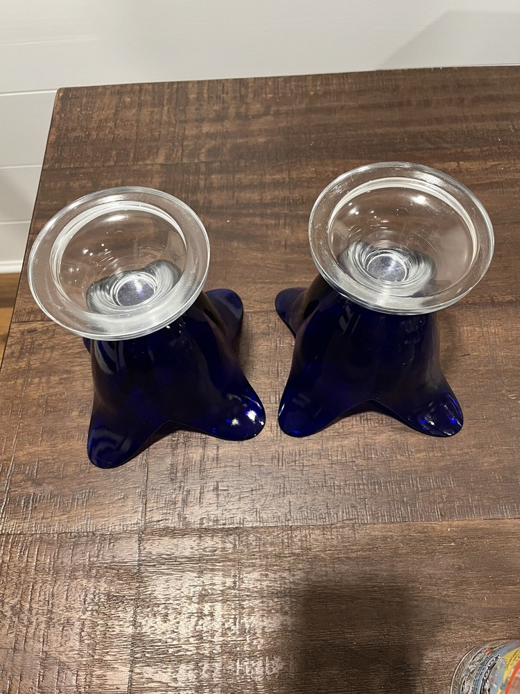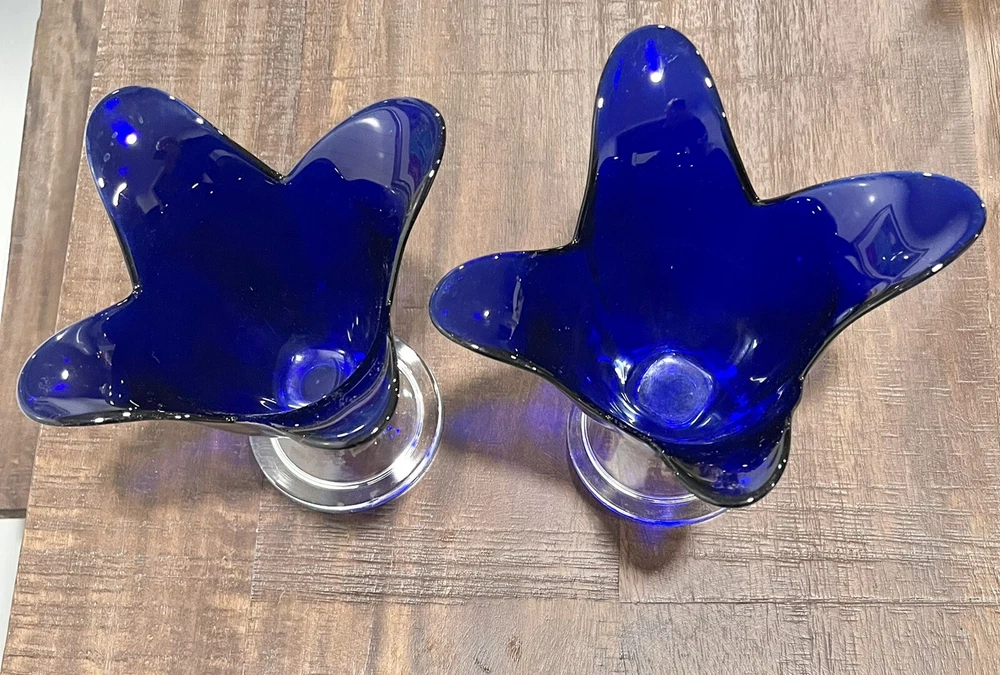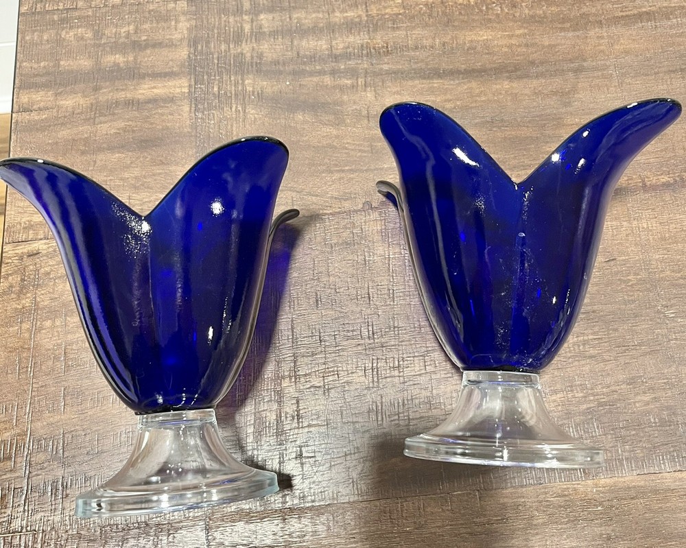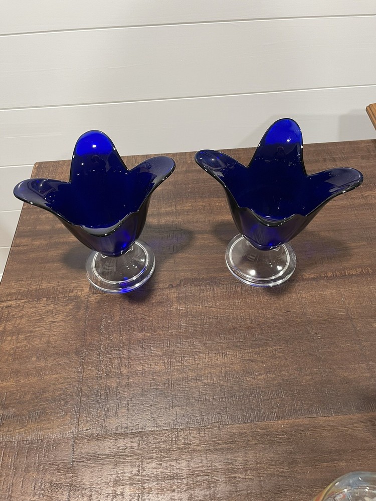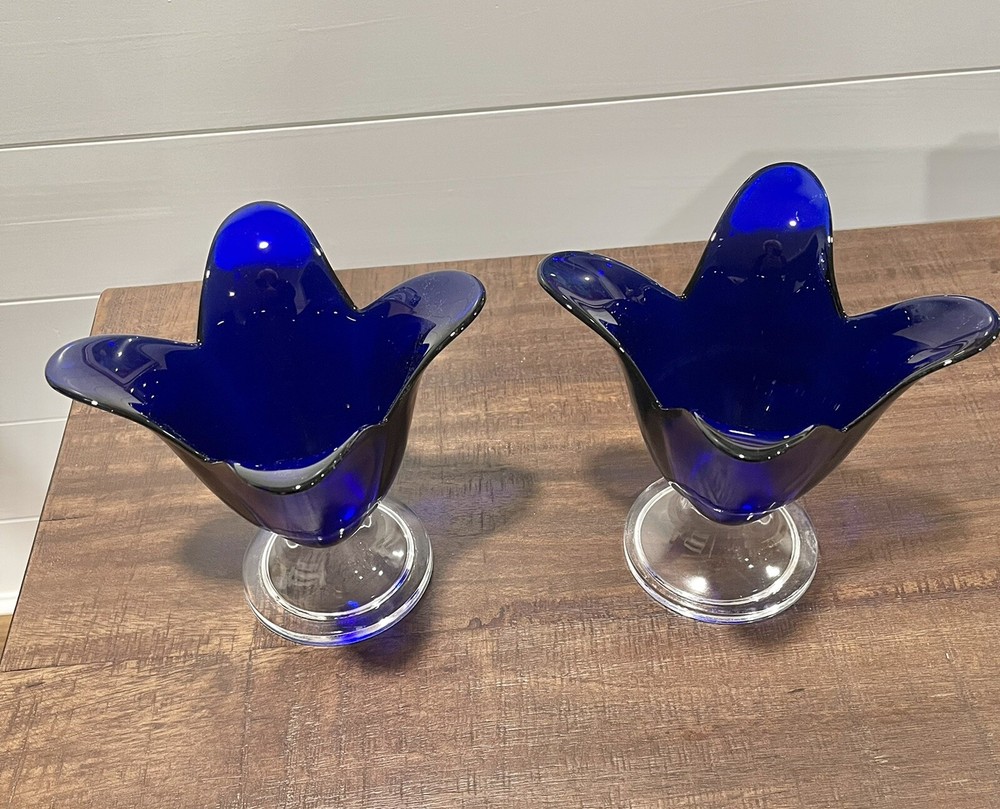 Pair Studio Nova Cobalt Blue Art Glass Tulip Shaped Vase Or Tea light Portugal. Beautiful cobalt blue with clear base. Excellent used condition. No chips or cracks.