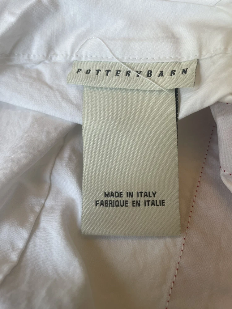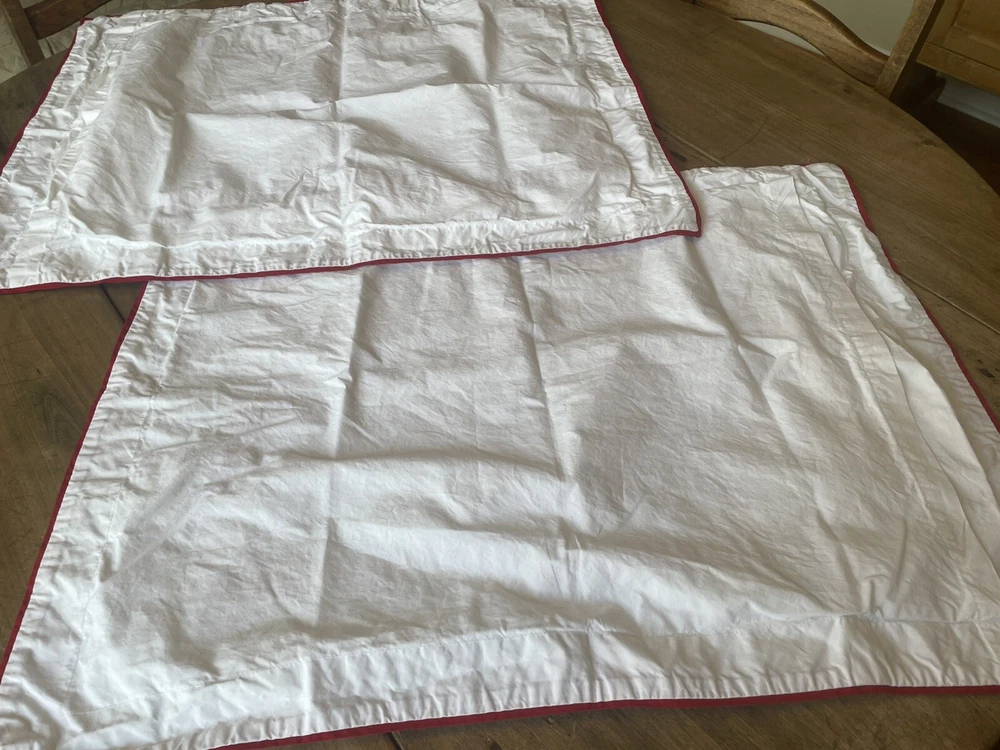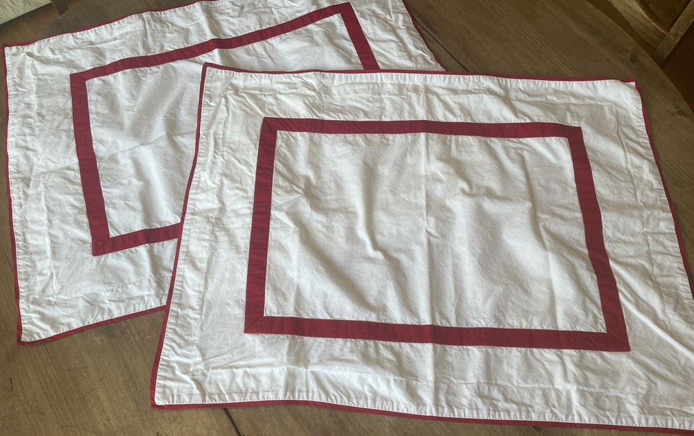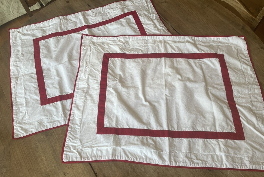 Pair Pottery Barn crisp white with red trim standard pillow shams. 100% cotton. Made in Italy. Perfect condition.