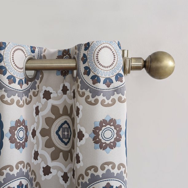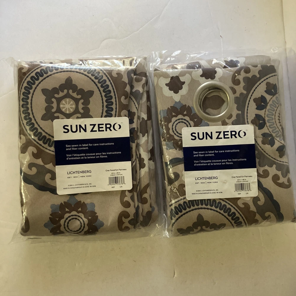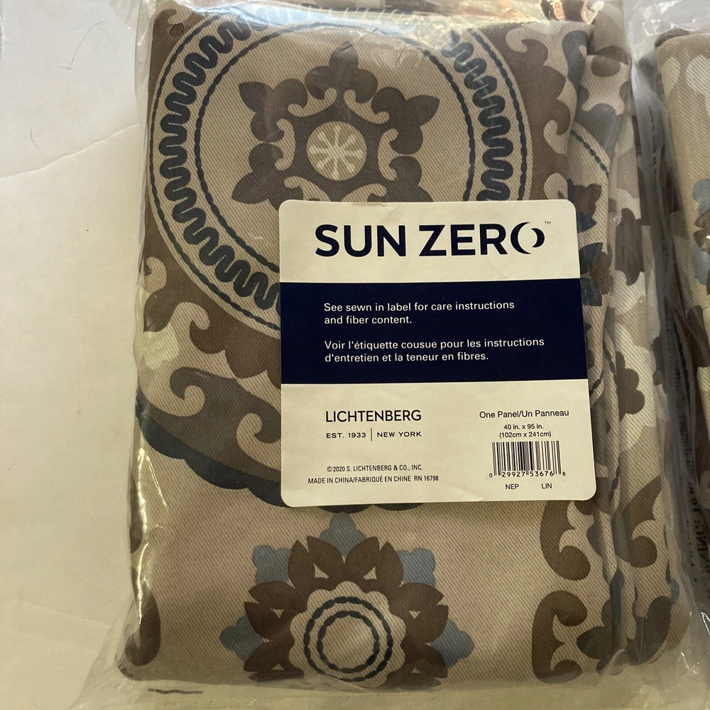 WE DO NOT SHIP TO P.O. BOXES. PLEASE PROVIDE A PHYSICAL MAILING ADDRESS. Item will be shipped free by USPS Priority Mail/UPS within 48 Lower States (NO SHIPPING for Alaska, Hawaii or Puerto Rico) THIS IS A SET OF TWO CURTAIN PANELS 40" X 95" EACH - TOTAL FOR PAIR IS 80" X 95" Featuring a global medallion print design, Sun Zero Nepal Blackout Curtain Panels add global intrigue into any living space. Equipped with built-in metal grommets for easy hanging on standard curtain rods up to 1. 5" in diameter. Sun Zero Blackout technology blocks out most outside light, offers outside noise reduction by up to 30%, and decreases energy lost through your windows by up to 40%. Comfort is optimized with thermal properties that help keep summer heat and winter chill out of your home. Hang in your living room for enhanced privacy, or in your bedroom for a sounder, more uninterrupted sleep. Machine wash cold on gentle cycle. Use non-chlorine bleach when needed. Tumble dry on low heat, using a cool iron as needed. Features: Global medallion print brings global intrigue to any room of your home Blackout technology blocks out most unwanted light while enhancing privacy Energy-Efficient design reduces energy lost through your windows by up to 30% Silver metal grommet top fits a standard curtain rod up to 1. 5" for easy hanging Machine Wash cold, gentle cycle.