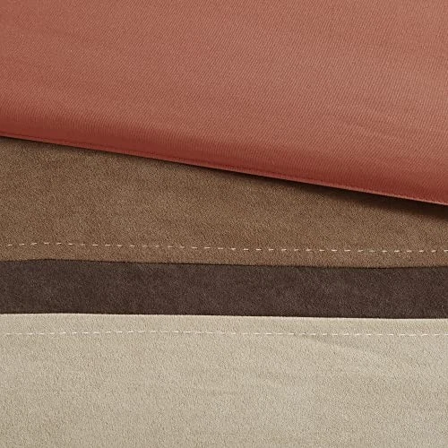 The 7 Piece Palisades Comforter Set offers you a casual alternative in fashion bedding. The reverse of the comforter is solid coral. The soft microsuede in ivory, coral and brown is pieced together to create this beautiful bed. The decorative pillows are embroidered and pieced to add a decorative element to this simple, yet beautiful bedding collection. With hypoallergenic filling in the comforter and pillows, this stylish comforter set easily refreshes your bedroom decor and is machine washable for easy care. For a casual look with a flare of casual luxury and added comfort, the Palisades micro-suede comforter set is perfect for you.This set will keep your warm in the winter but is lightweight enough to keep you cozy during the warm months as well Crafted from premium micro-suede, this bed offers a luxurious and velvety feel. Its unique pieced design combines an array of colors for a harmonious and versatile look that can effortlessly complement any existing décor, adding depth and dimension to your space Items in the set may come in a rolled or compressed packaging, which will need to be fluffed up or steam ironed before use to remove wrinkles Set includes: 1 Comforter:104x92", 1 Bedskirt:78x80+15", 2 King Shams:20x36", 3 Decorative Pillows:18x18"/10x18"/12x18" Care instructions: Machine wash, gentle cycle and separately. Spot clean decorative pillows. Do not bleach. Tumble dry low, remove promptly. Do not iron. If there is no free movement in the washer or dryer, use large capacity commercial washer/dryer.