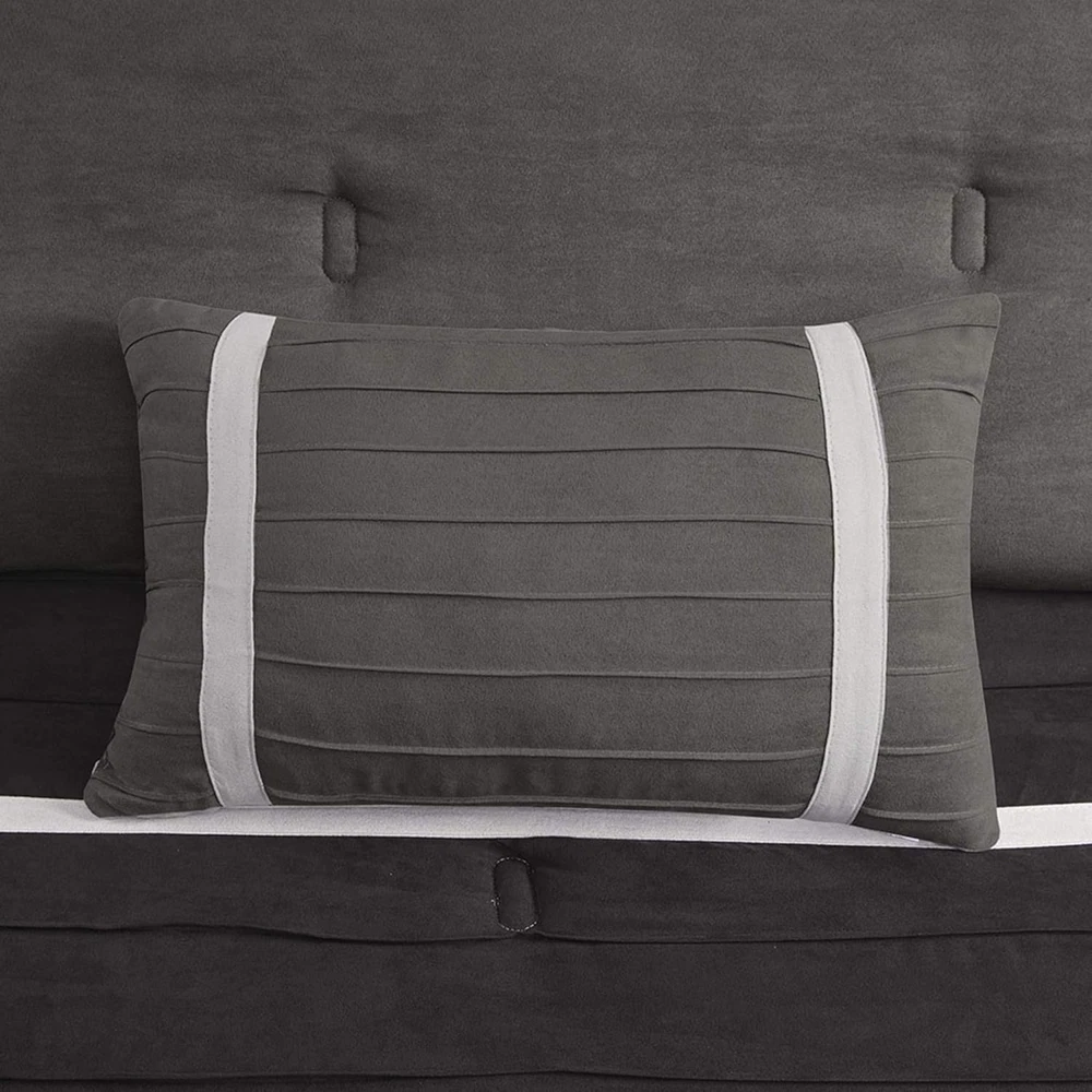 Menu Other Items Feedbacks About Us Contact Us Add To Favorites - Palmer 7 Piece Comforter Set - Black and Gray - California King - Pieced Microsuede - Includes 1 Comforter, 3 Decorative Pillows, 1 Bed Skirt, 2 Shams 100% Polyester PRODUCT FEATURES- This black and gray comforter is made from pieced microsuede for a soft feel while the piecing add texture and color with their gray and black colorways. The decorative pillows add a mix of nature-inspired leaf print SUPERIOR QUALITY FABRIC- Bed in a bag comforter set with ultra-soft, wrinkle resistant fabric that's more durable and breathable. PACKAGE AND MEASUREMENTS- 1 Comforter:104 x 92 inches, 3 Decorative Pillows 20*36 inches ,x20"/18x18", 1 Bedskirt: 72*84 inches + 15inches height, 2 Shams:20x36 inches (2) Bed in a bag classic and transitional style for your bedroom EASY CARE- Machine wash cold and separately. Tumble dry low. The Madison Park Palmer 7 Piece Comforter Set offers a classic and refined update to your bedroom decor. This transitional style comforter features a pieced microsuede design in rich contrasting black and grey colors to create an incredibly soft look and feel. The 2 matching shams also flaunt a pieced construction to coordinate with the faux suede comforter. A solid grey bed skirt and 3 decorative pillows with a mix of embroidered designs add the perfect finishing touches to complete this lush traditionally-inspired comforter. Machine washable for easy care, items in the set may come in a rolled or compressed packaging, which will need to be fluffed up or steam ironed before use to remove wrinkles. Item Specification Item model number MP10-425 Style Transitional Material Polyester Assembly required No Pattern Striped Country of Origin China Theme nature, Botanical Department unisex-adult Number of Pieces 7 Product Dimensions 24 x 24 x 17.72 inches Batteries required No Pillowcase Width 2E+1 Inches Seasons All Is Discontinued By Manufacturer No Included Components 1 Comforter, 3 Decoratvie Pillows, 2 King Shams, 1 Bedskirt Item dimensions L x W x H 24 x 24 x 17.72 inches Item Weight 0.01 ounces Color Black Global Trade Identification Number 00675716455231 Refill polyester Fabric Type 100% Polyester Product Care Instructions Machine Wash Size California King (104 in x 92 in) Dimensions Shipping Returns Additional Info Product Dimensions: 24.0 inches x 24.0 inches x 17.72 inches. Weight: 0.01 oz Fast shipping is very important for us. Our standard shipping service is FREE. Your order will be shipped within 1-3 business days upon full payment received. Most items are delivered within 3-5 business days, however, please allow 3-10 business days. We are shipping only to USA. We only ship to the confirmed Paypal address. We reserve the right to cancel any order for any reason at any time. We are not responsible for undeliverable addresses. We offer a 30 day return policy from checkout winning date. Your satisfaction is guaranteed! If for any reason you are unhappy with your item, just return it within 30 days for a full refund, minus shipping cost. Please contact us prior to initiating a return so that we can issue you a refund authorization. Items defective upon receipt must be packaged in their retail packaging as if new and returned with a detailed description of the problem. Return shipping fees are not refundable. We reserve the right to decline any returns if the above guidelines are not followed. All of our items, unless otherwise stated, will only run on 120 volts. Please check to make sure your country complies with these specifications. If you have a problem or question regarding your transaction please contact us before leaving any type of feedback. We will work with you to resolve any problem you may have.