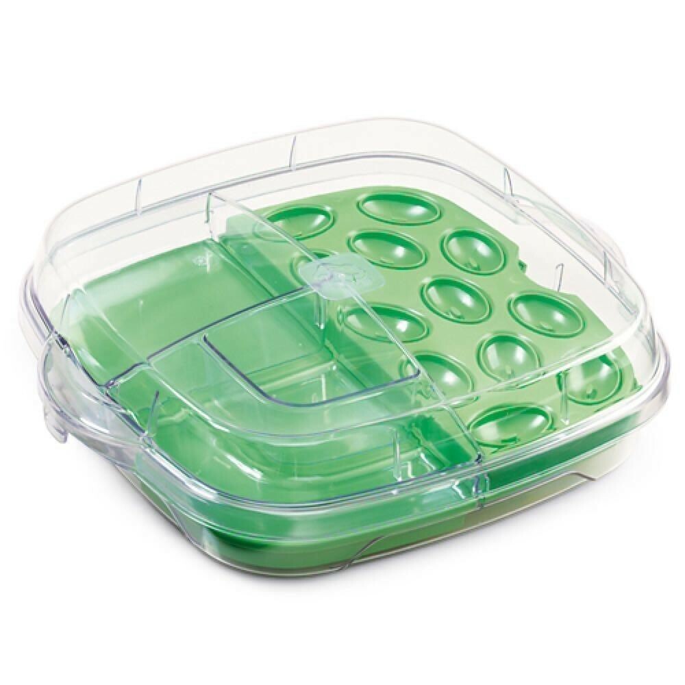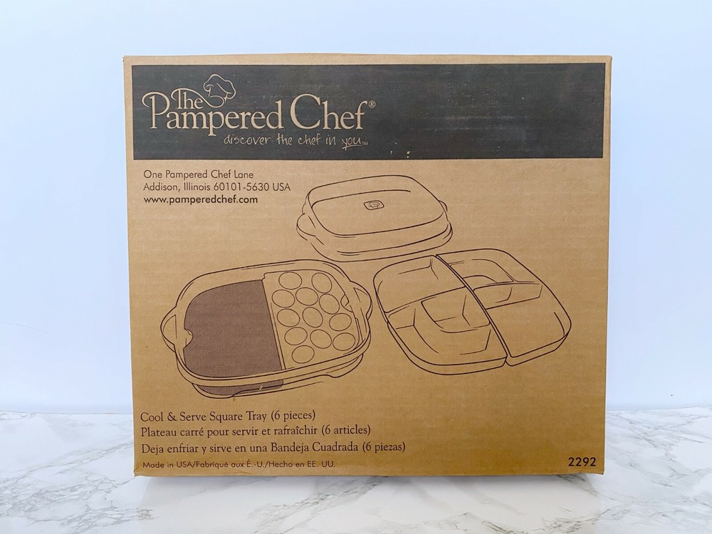 Pampered Chef Large Cool & Serve Tray 12" tray will keep food chilled for 4-6 hours. Great for barbecues, picnics and parties. 6 pieces includes 2 serving trays each with 1-cup dip wells. Condition is New. Shipped with USPS Priority Mail.