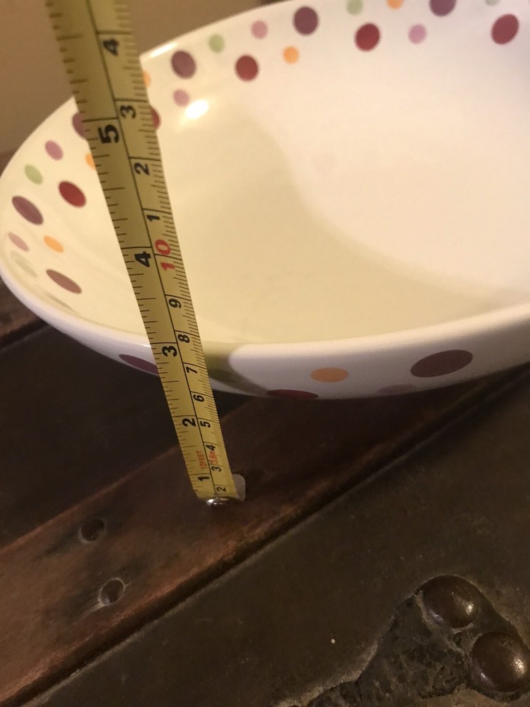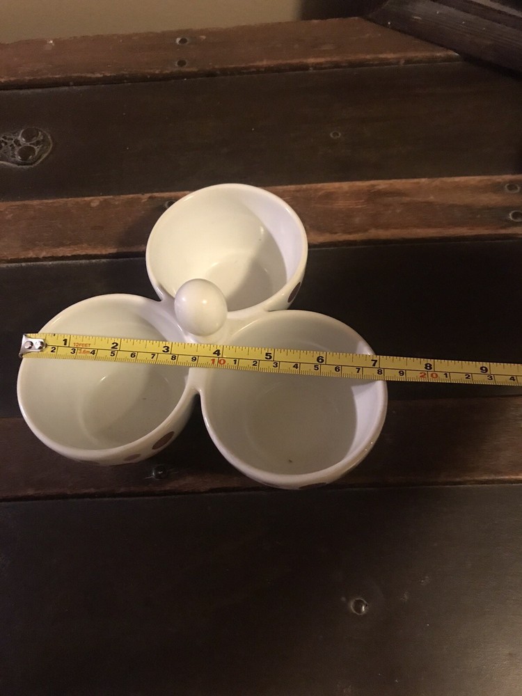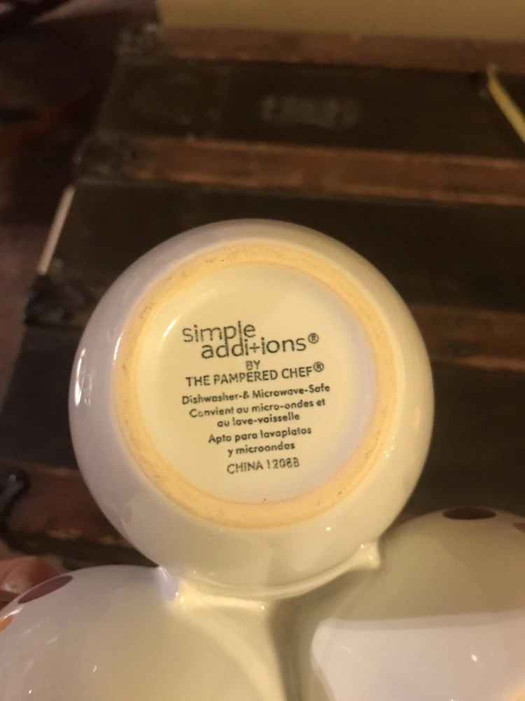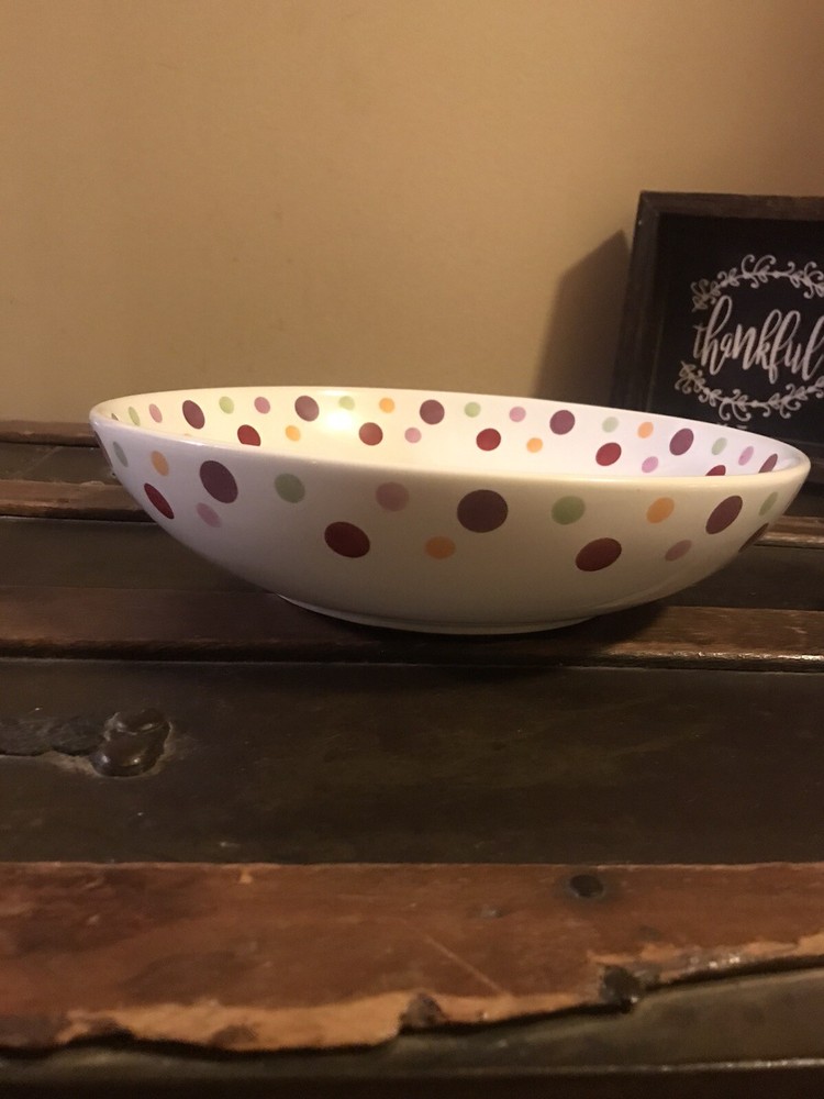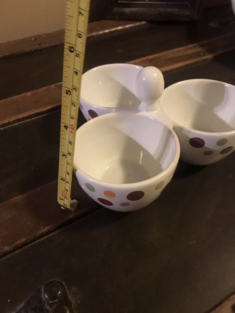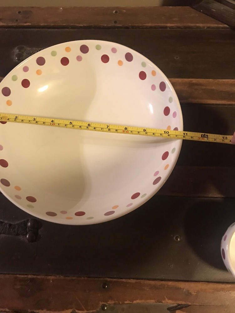 This is a beautiful set by Pampered Chef Simple Additions. Includes a large serving bowl and also a dipping bowl set. See photos for all measurements. White with multi colored polka dots. I will ship by USPS priority or ground advantage, both would be insured. However in the event of any damage in shipping, you will need to take carton and contents to the post office for inspection or they will probably decline claim. I don’t charge anything above actual shipping costs and I use eBay calculated shipping which is based on destination, dimensions and weight. Feel free to contact me with any questions. LotG7