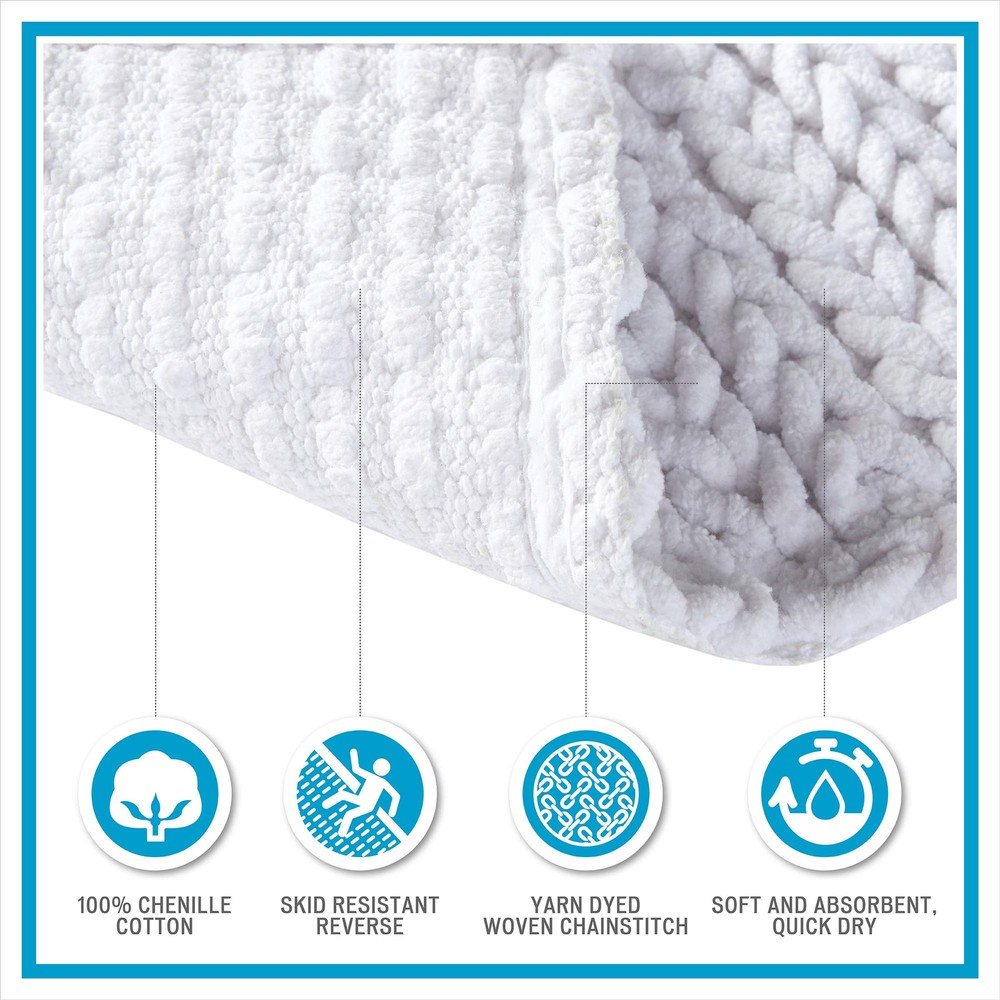 The Lasso 100% Cotton Chain Stitch Rug brings a rich textural look to your bathroom decor. This charcoal piece dyed bath rug features a woven chain stitch design that creates bold dimension for an updated look. The rug is made from 100% cotton chenille making it soft and absorbent, and the reverse has transparent latex to keep the rug stays in place. Machine washable for easy care, this bath rug is quick drying and adds a cool and casual touch to your bathroom. Total of 3 sizes for your selection. Complete the collection with coordinating Breeze towel set, available and sold separately. COLOR AND DESIGN – this white charcoal piece dyed bath rug features a woven chain stitch design that creates bold dimension for an updated look. MATERIAL AND FEATURES –measures 24 (W) x 40 (L) inches, the rug is made from 100% cotton chenille making it soft and absorbent, and the reverse has transparent latex to keep the rug stays in place. this bath rug is quick drying and adds a cool and casual touch to your bathroom. NON SLIP AND ABSORBENT –You won't slip and fall after the shower due to a wet tile with the non-slip design. High-pile, thick Chenille fabric helps save your floors from dripping water while you're stepping out of the bath, shower, or getting ready by the sink. Moisture is trapped in the mat's deep pile, allowing the rug to dry quickly and cleanly. EASY CARE - Machine wash cold seperately, on gentle/delicate cycle. Use mild detergent. Do not bleach. Line or flat dry only. Do not iron. Do not dry clean. SATISFACTION - We offer 100% satisfaction for our elegant designer microfiber fabric bath accessories sets with 39-day free return for our unique bathroom shower curtains set.